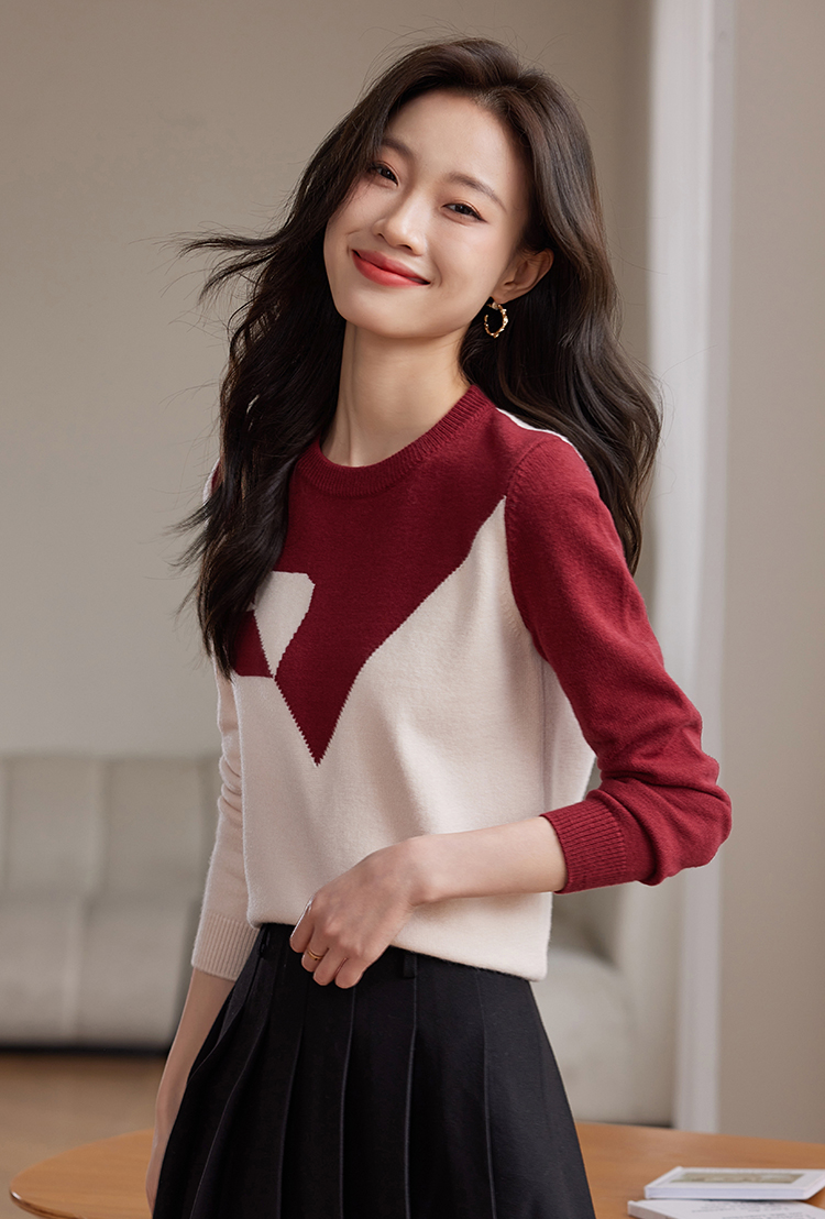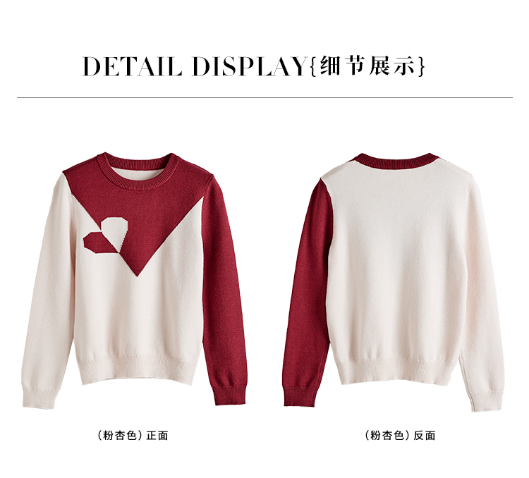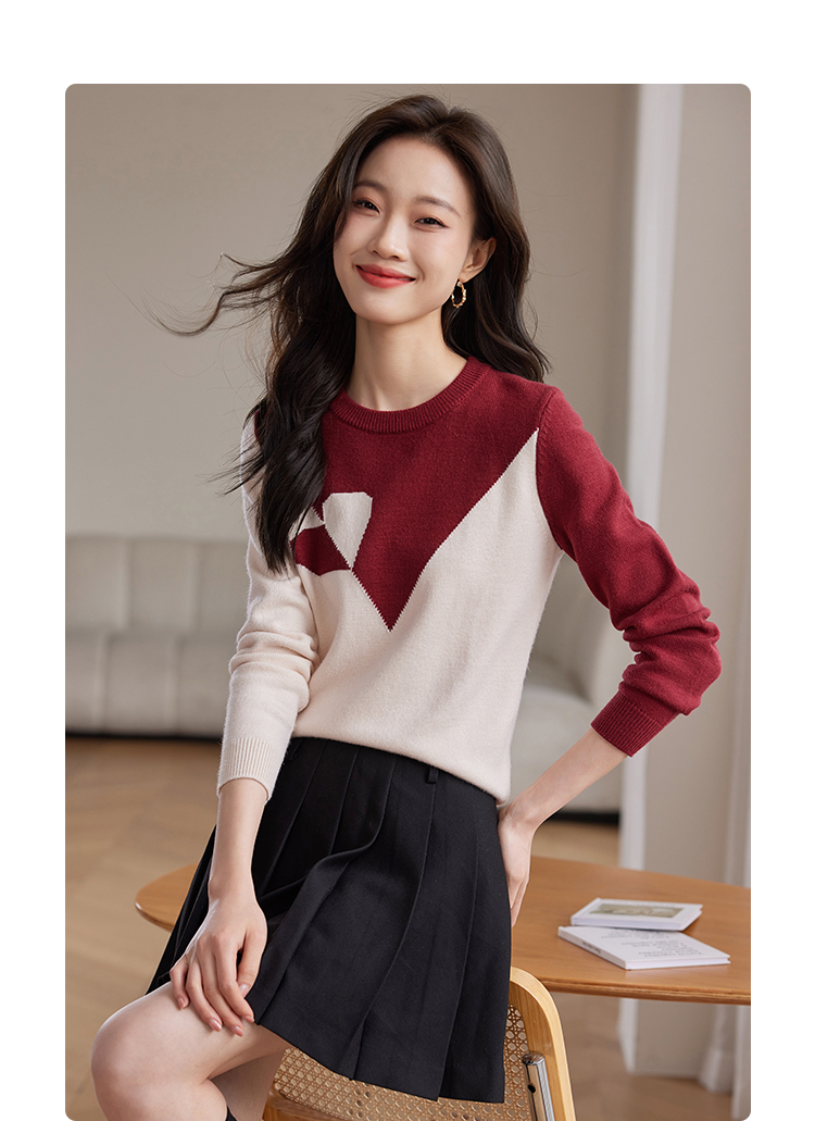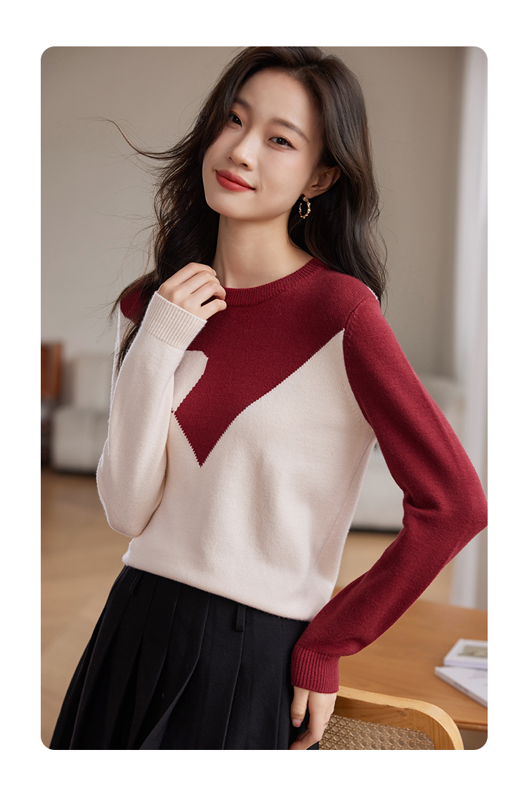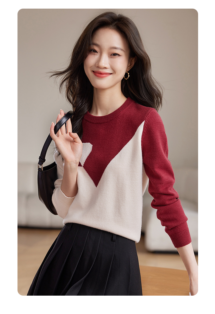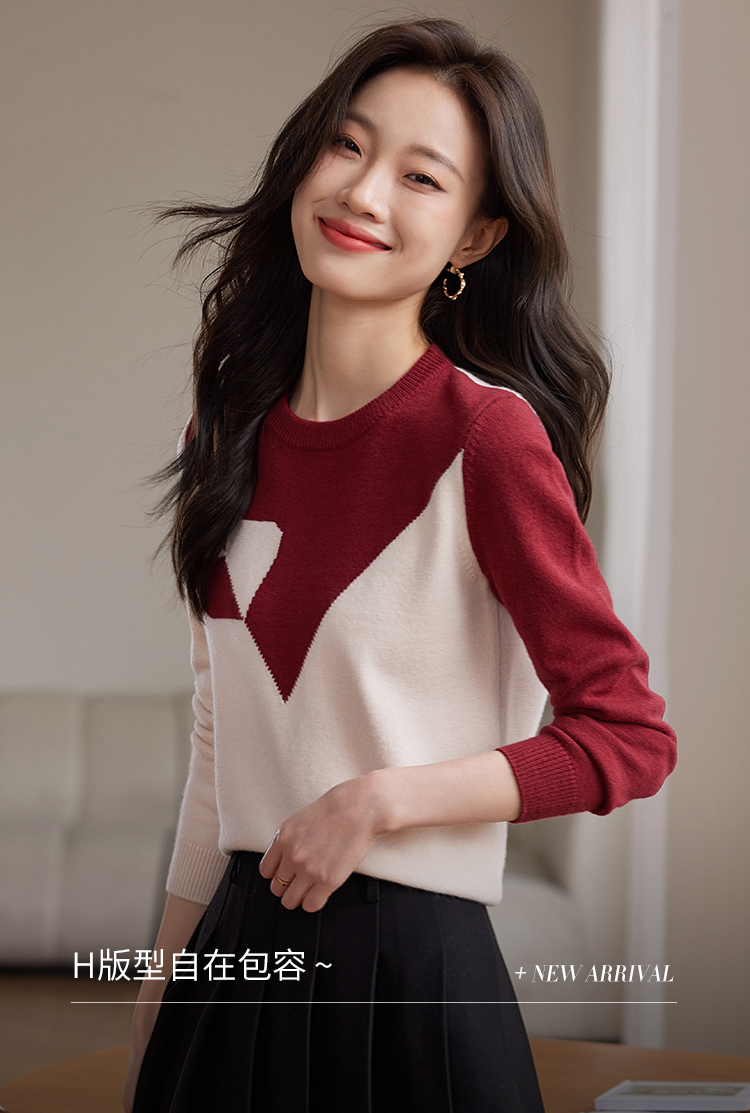 【年终特卖】熙世界红色撞色拼接慵懒毛衣女高级感宽松圆领针织衫2025秋冬新款