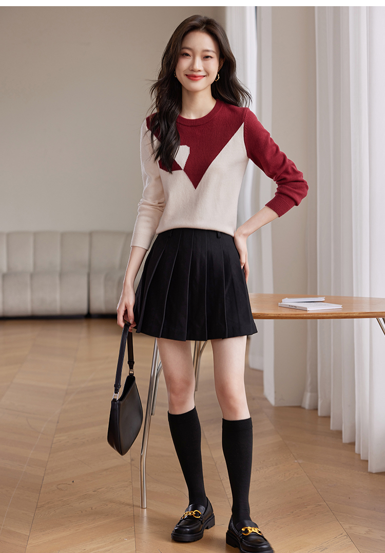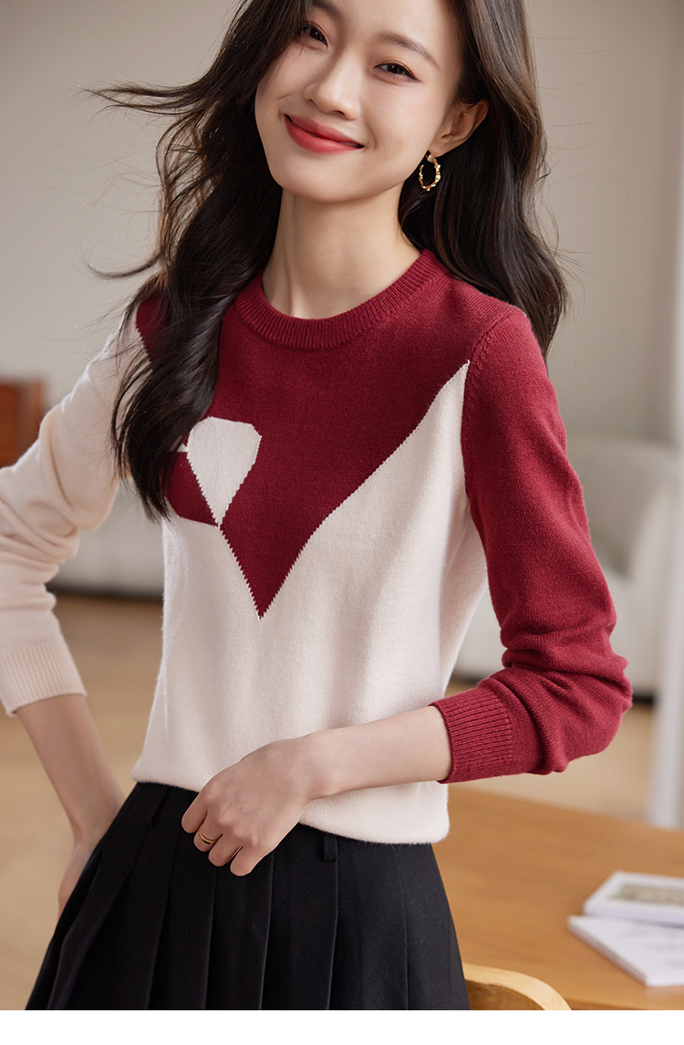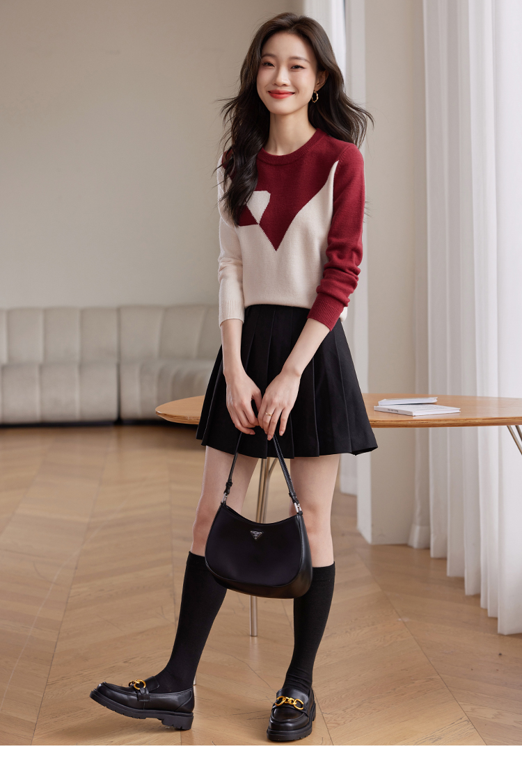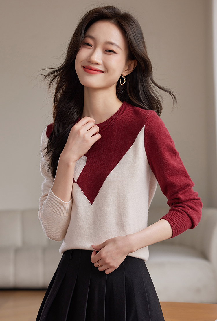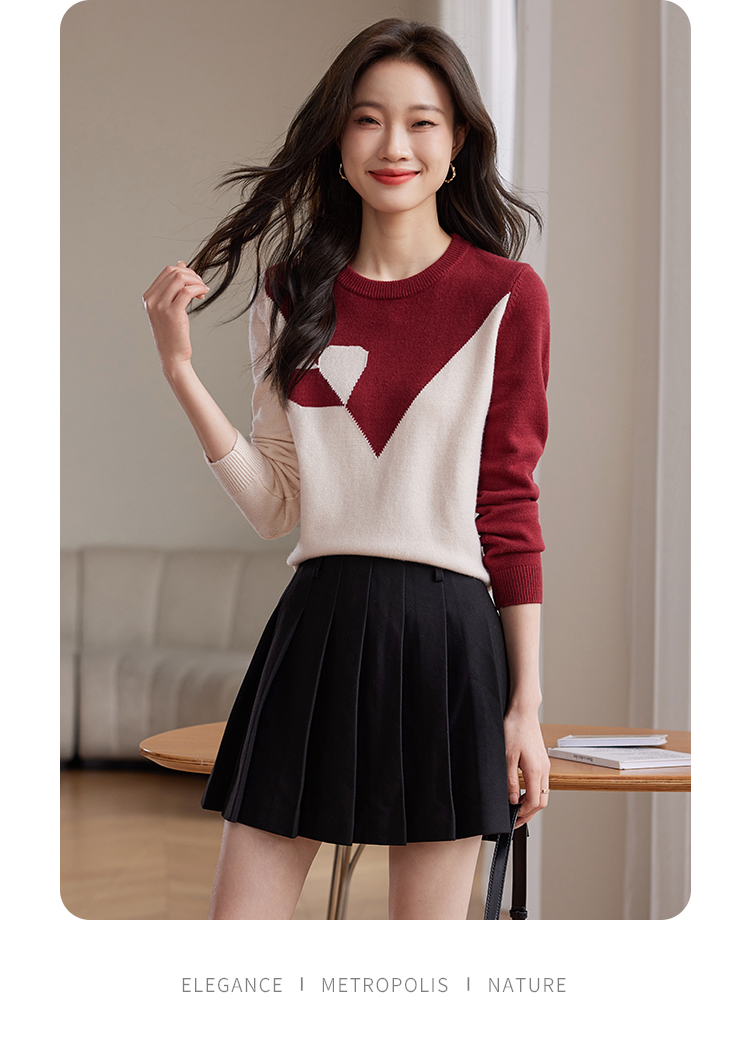 【年终特卖】熙世界红色撞色拼接慵懒毛衣女高级感宽松圆领针织衫2025秋冬新款