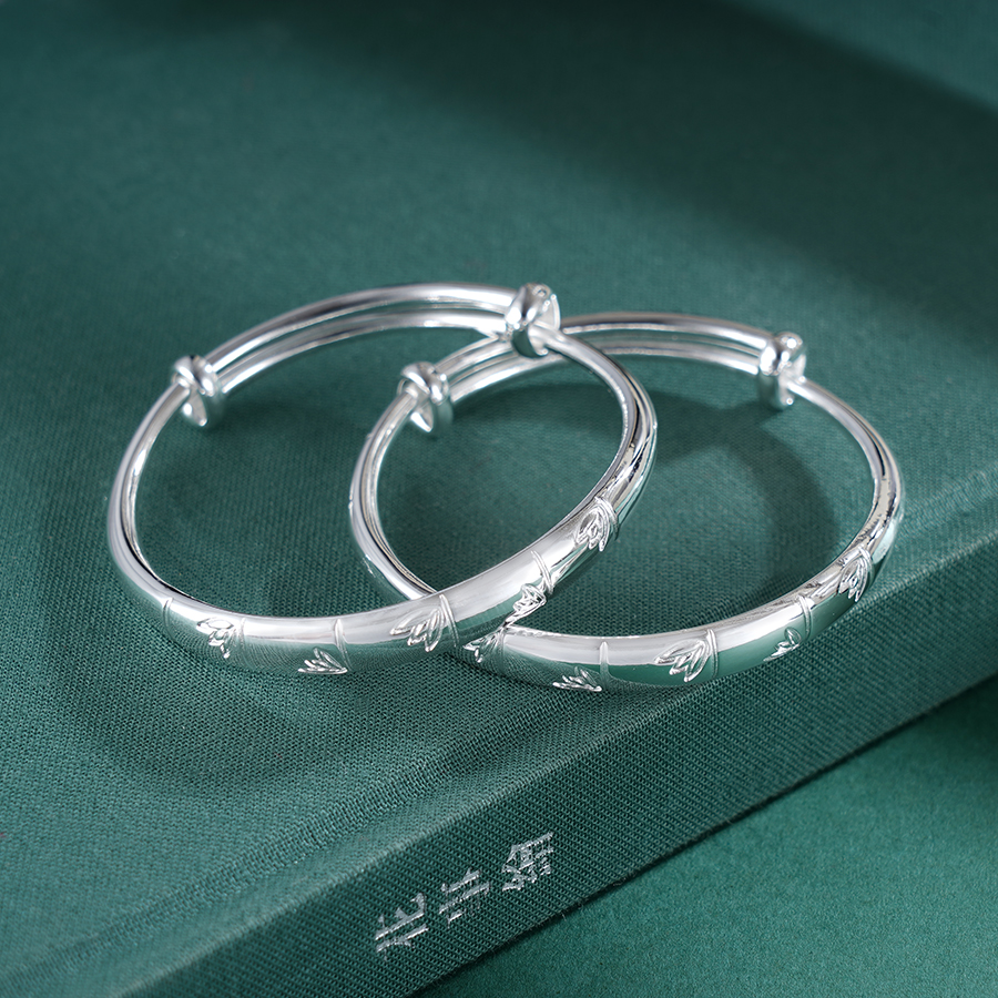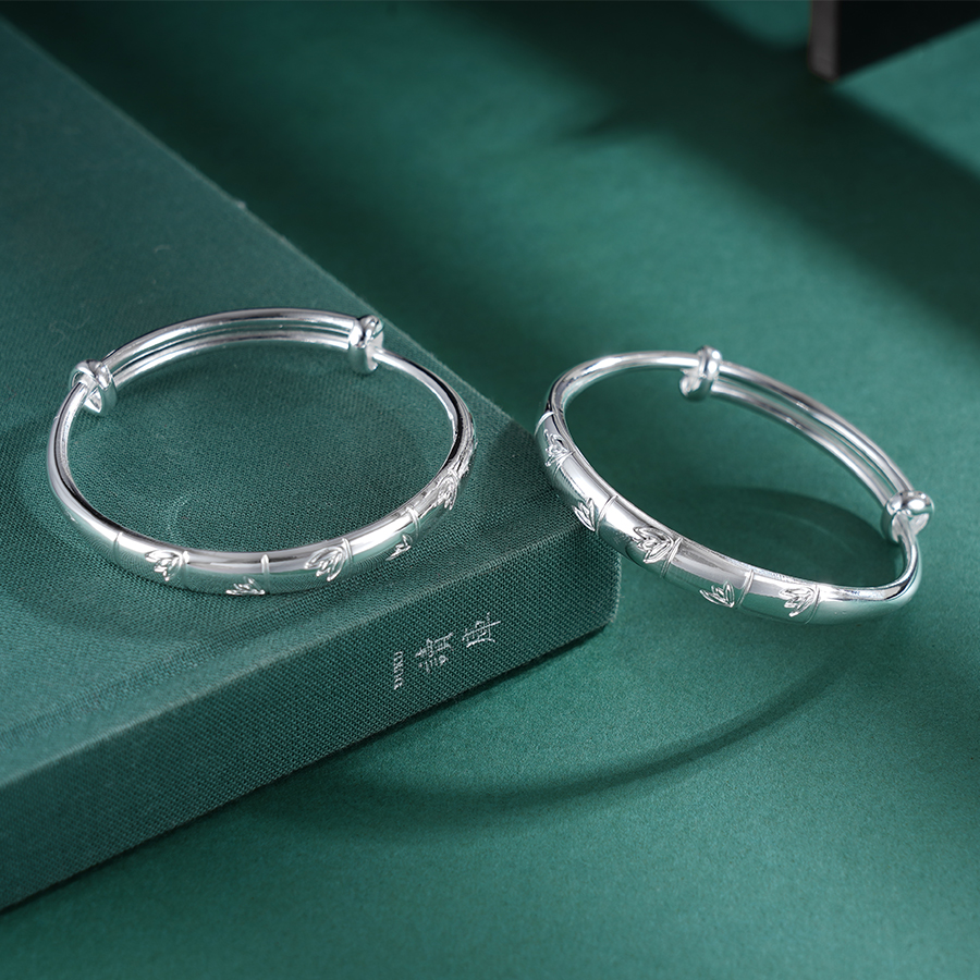 【寓意】:纯银童镯呵护宝宝稚嫩肌肤。镯面錾刻竹节图案,增添灵动趣味,寓意宝宝如竹般茁壮成长,寄予无限美好祝福。