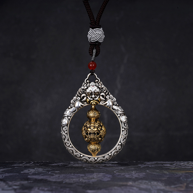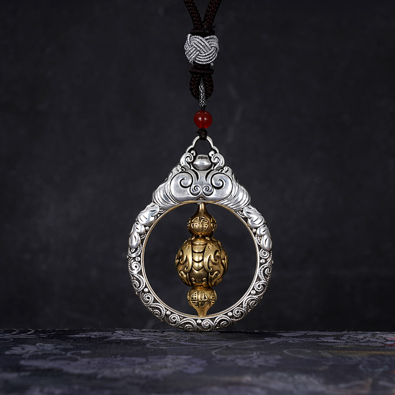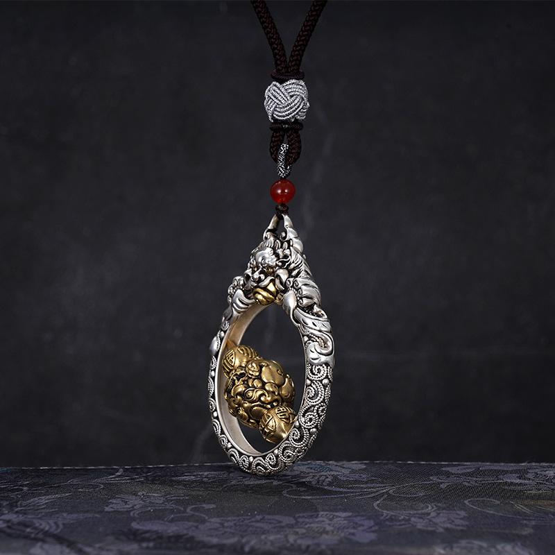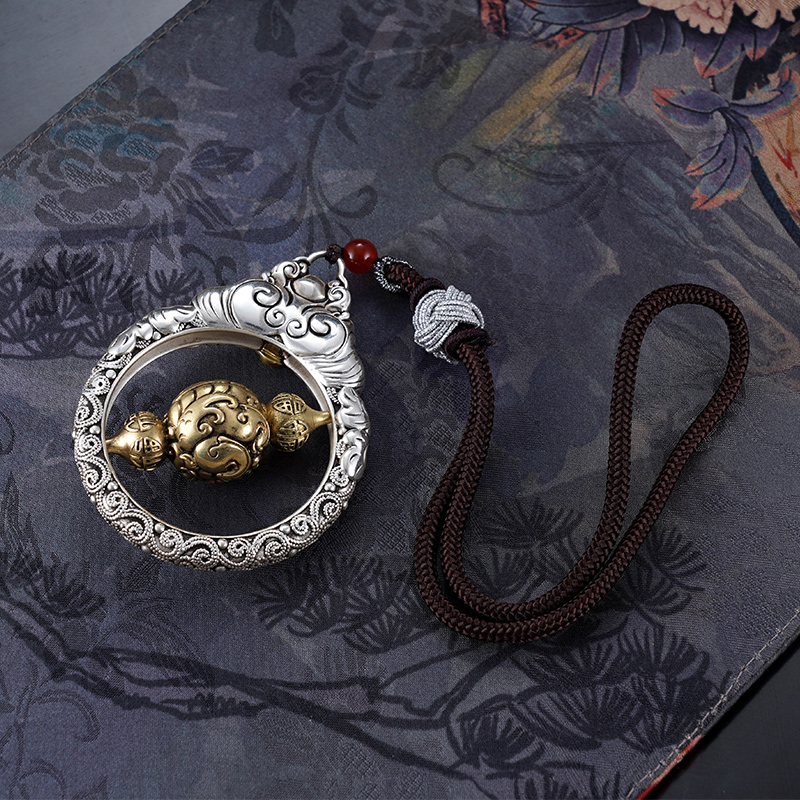 【寓意】:足银手把件创意十足,貔貅巧妙镶嵌融于圆环之中,可转动设计,寓意扭转乾坤、招财进宝。