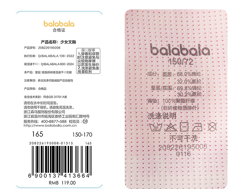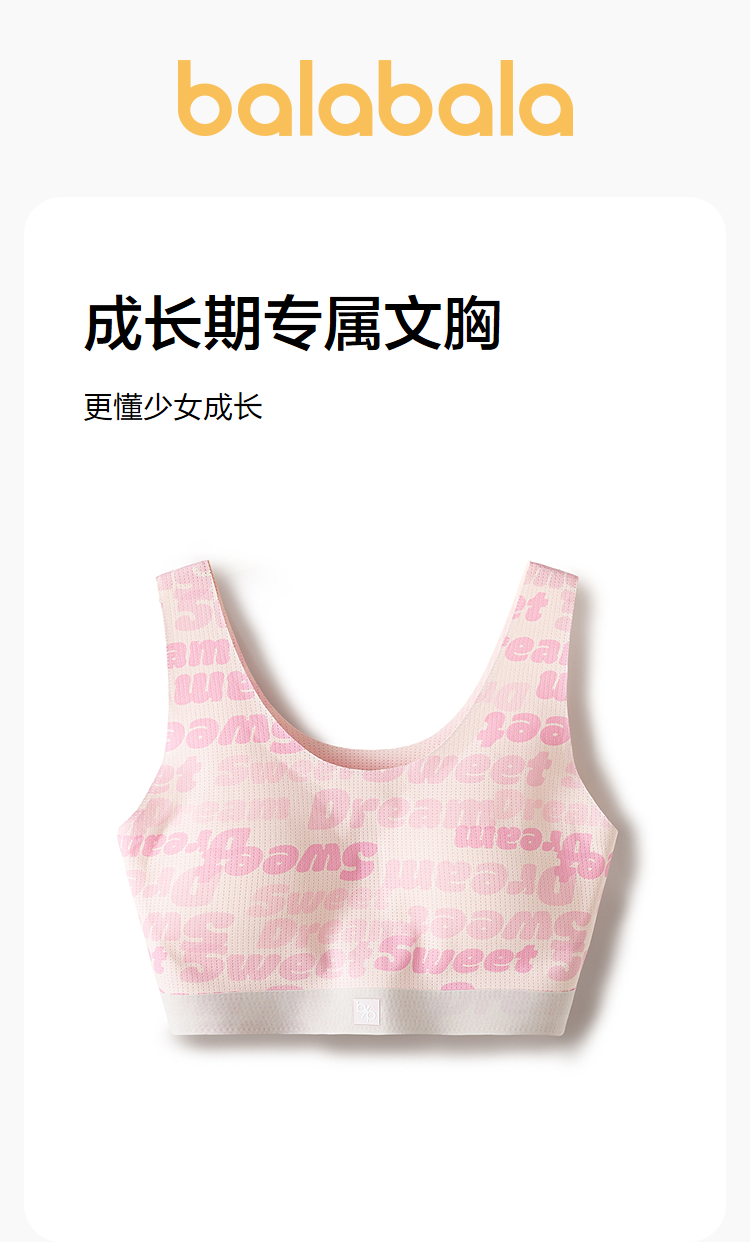 巴拉巴拉女童运动文胸防走光防凸点儿童内衣小背心发育期胸衣速干