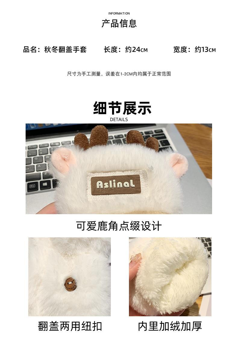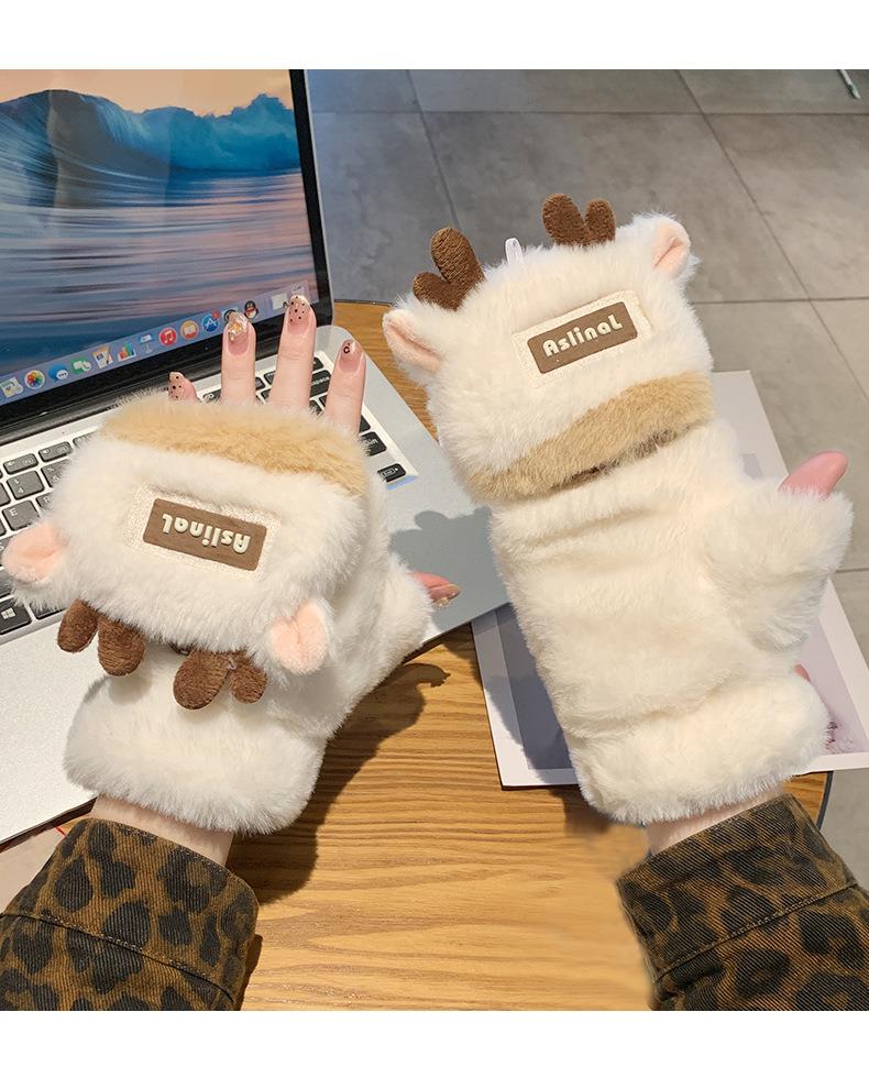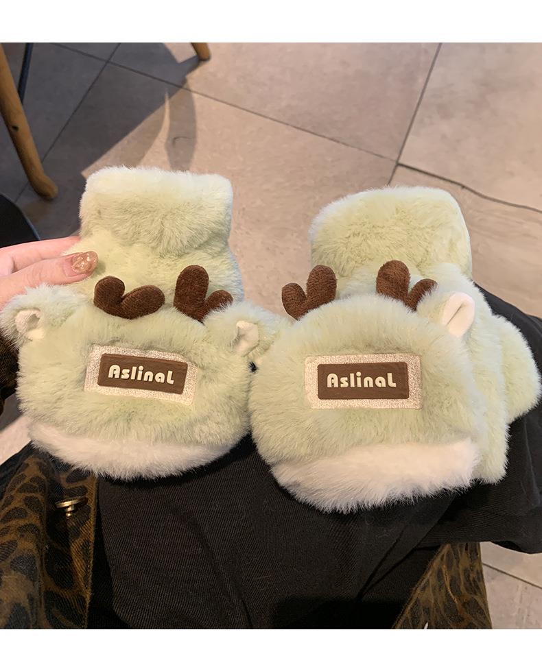 新款圣诞鹿角毛绒手套冬季女款加厚保暖可爱学生骑车防寒半指手套