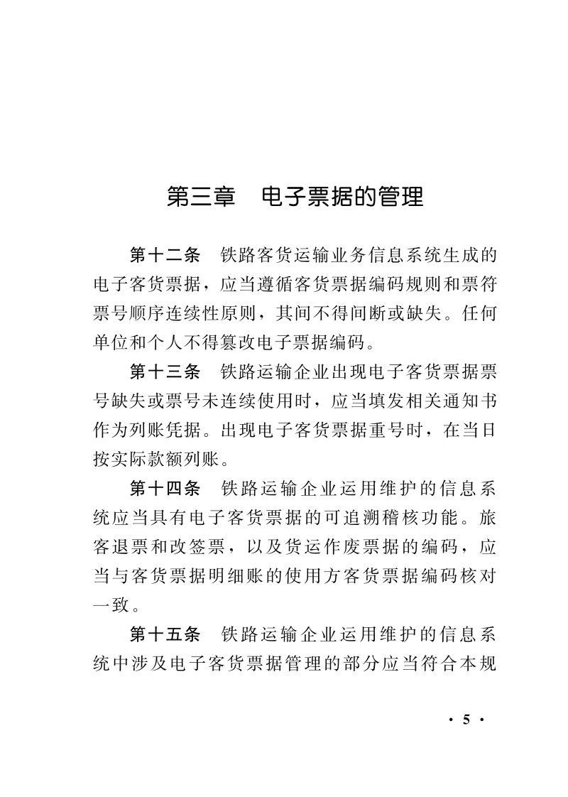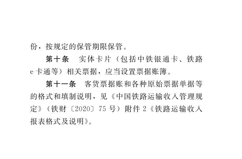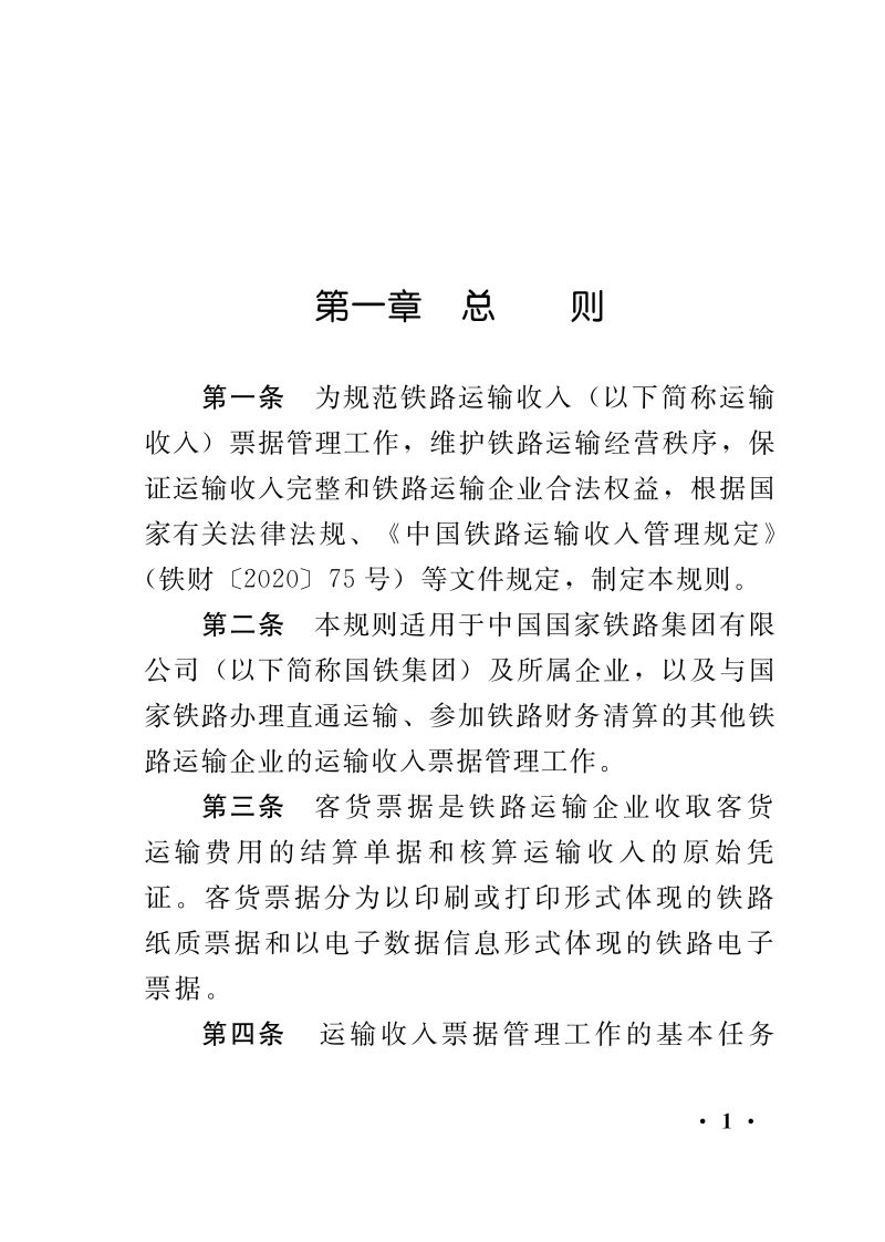 为规范铁路运输收入票据管理工作,维护铁路运输经营秩序,保证运输收入完整和铁路运输企业合法权益,根据国家有关法律法规、《中国铁路运输收入管理规定》(铁财〔2020〕75号)等文件规定,制定本规则。本规则适用于中国国家铁路集团有限公司(以下简称国铁集团)及所属企业,以及与国家铁路办理直通运输、参加铁路财务清算的其他铁路运输企业的运输收入票据管理工作。本规则主要包括总则、票据账、电子票据的管理、纸质票据的管理、客货票据的印制、票据管理工作稽核等内容。
