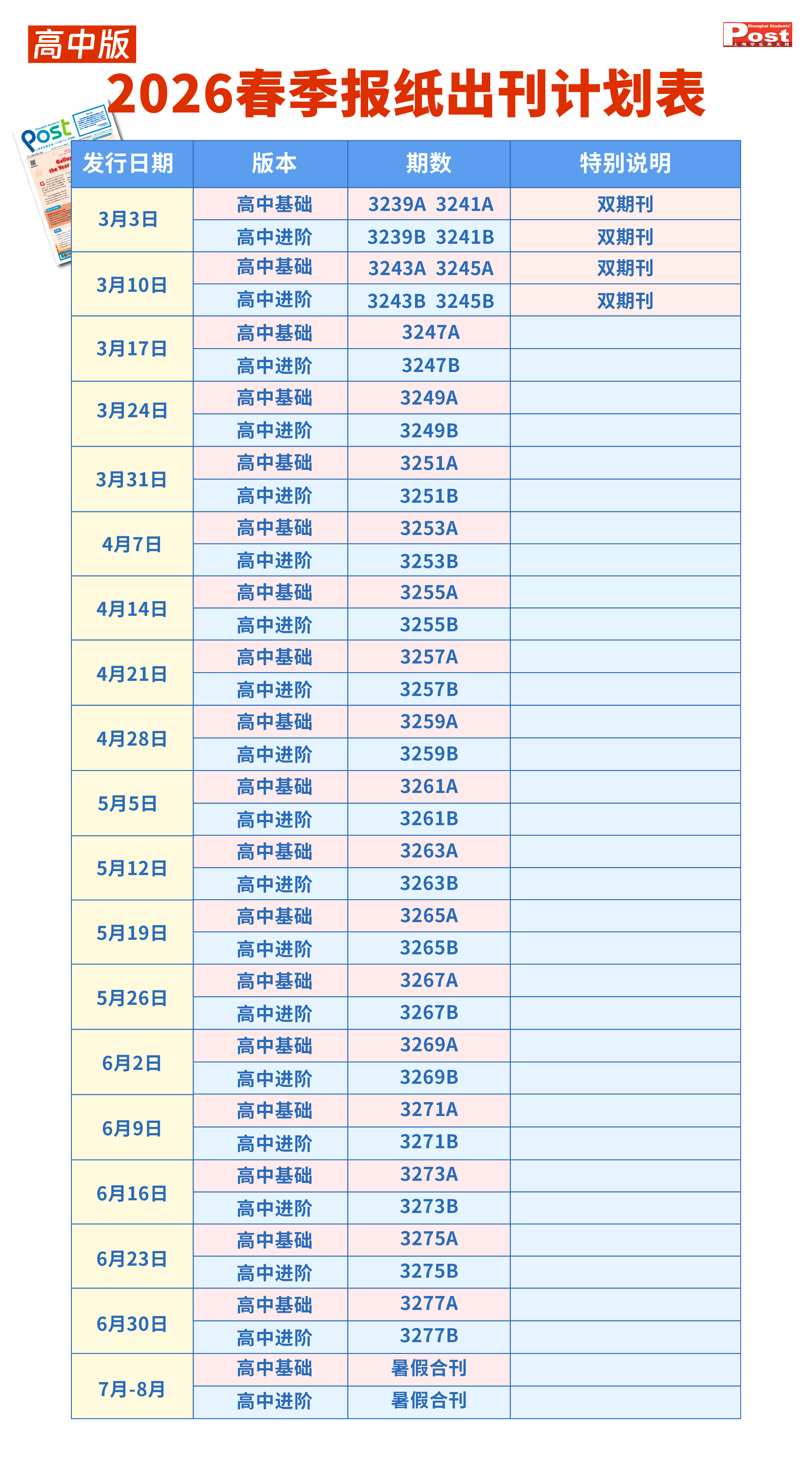 高中版上海学生英文报26年3月-8月纸质报刊(20期+暑假合刊)含运费