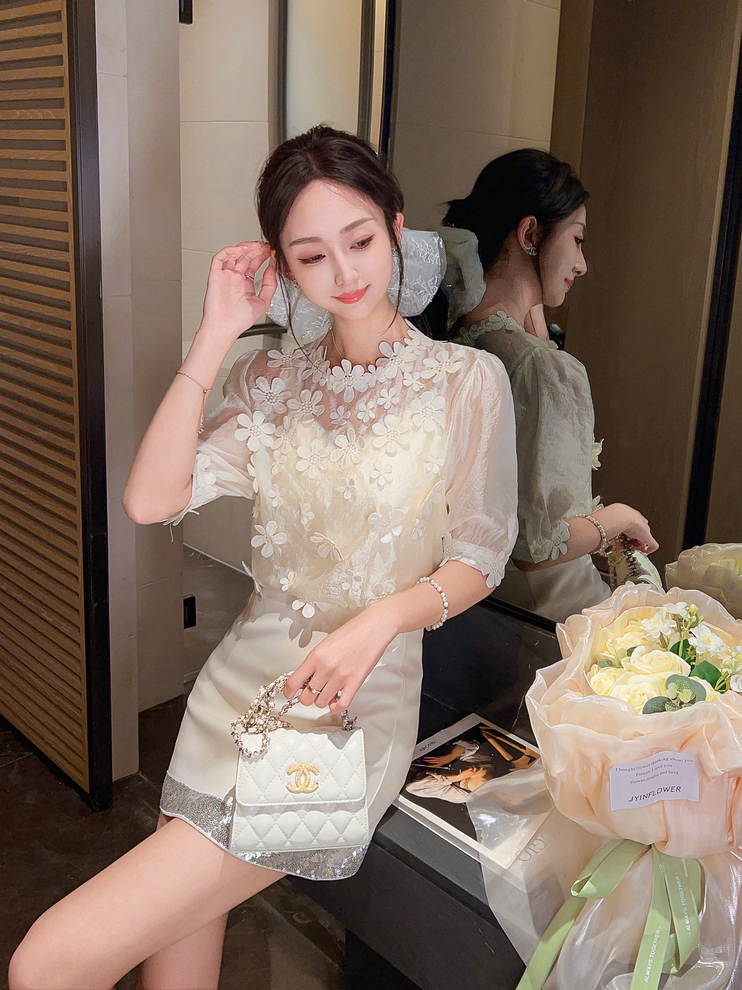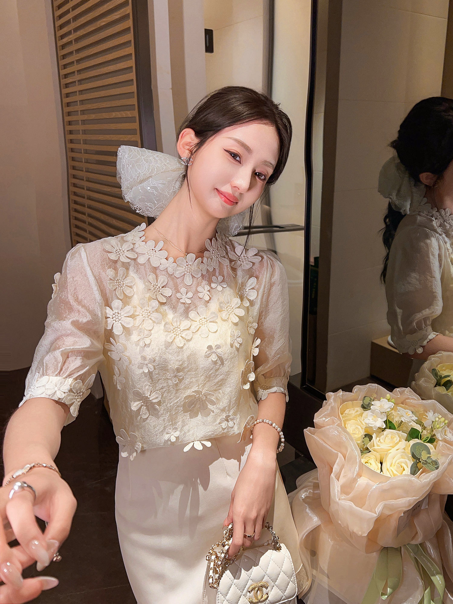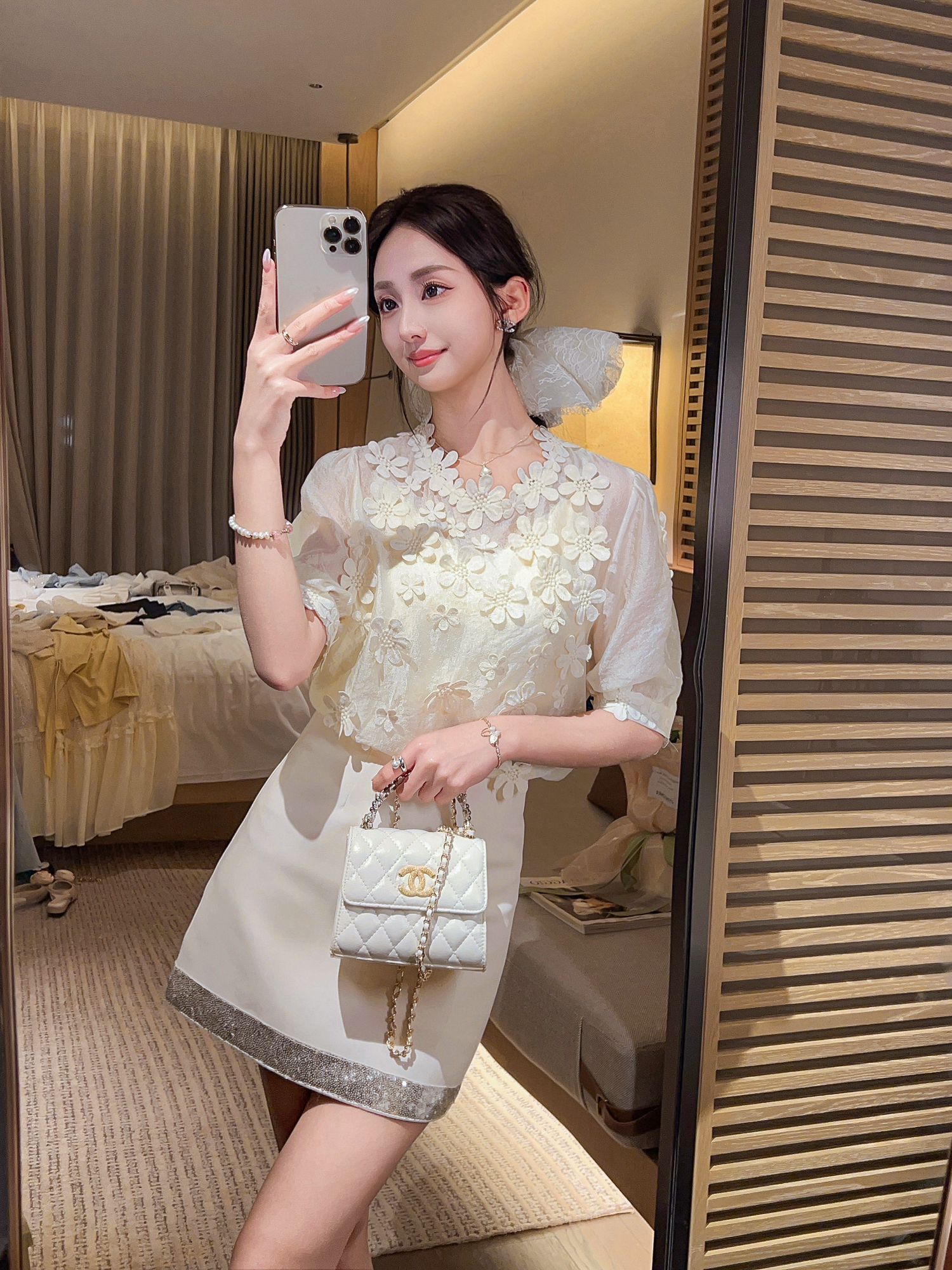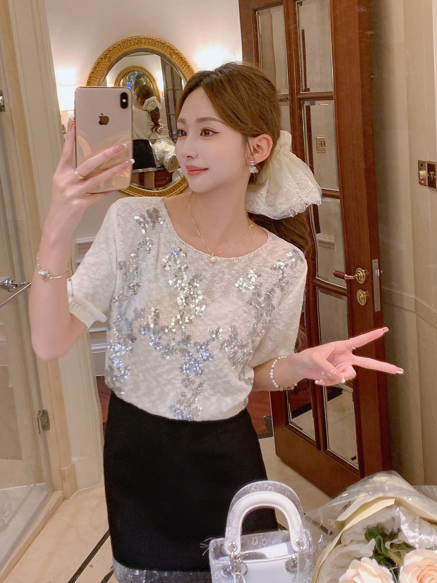 张心子【夏日攻略】设计感烫钻花朵T恤女短袖夏新款修身显瘦上衣 U2604006