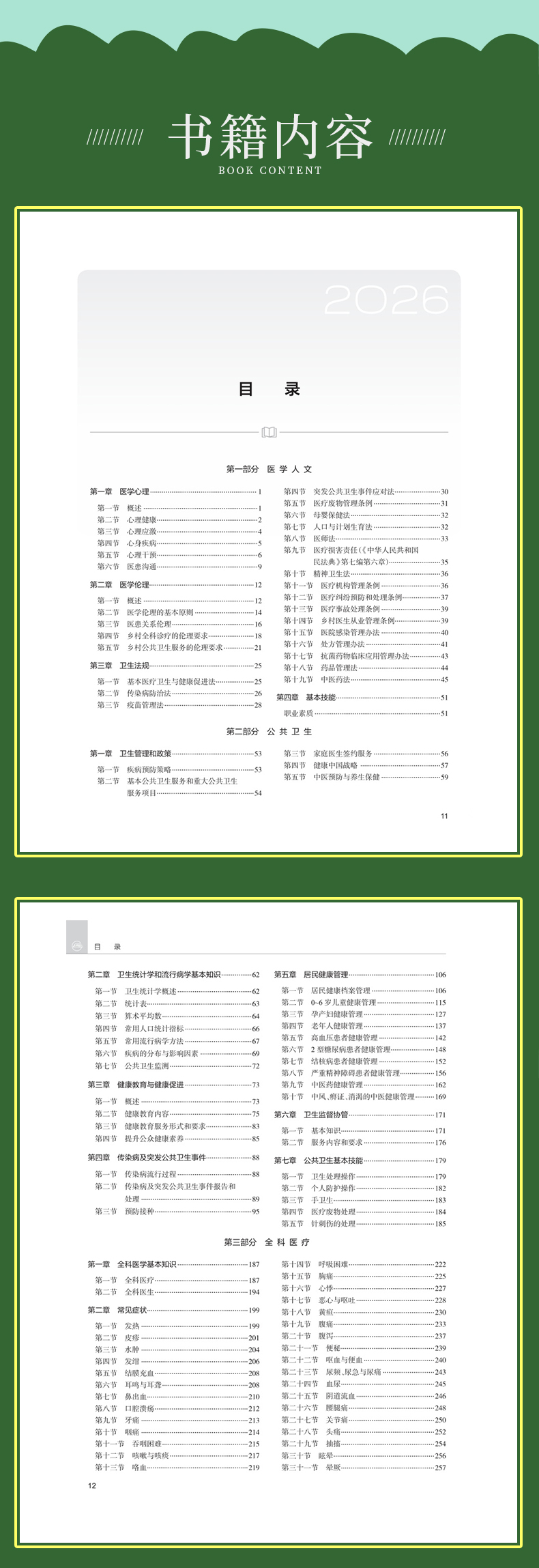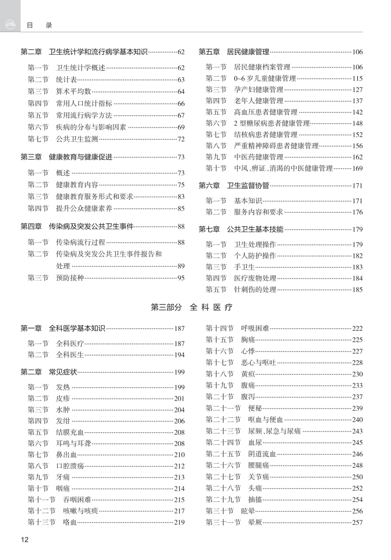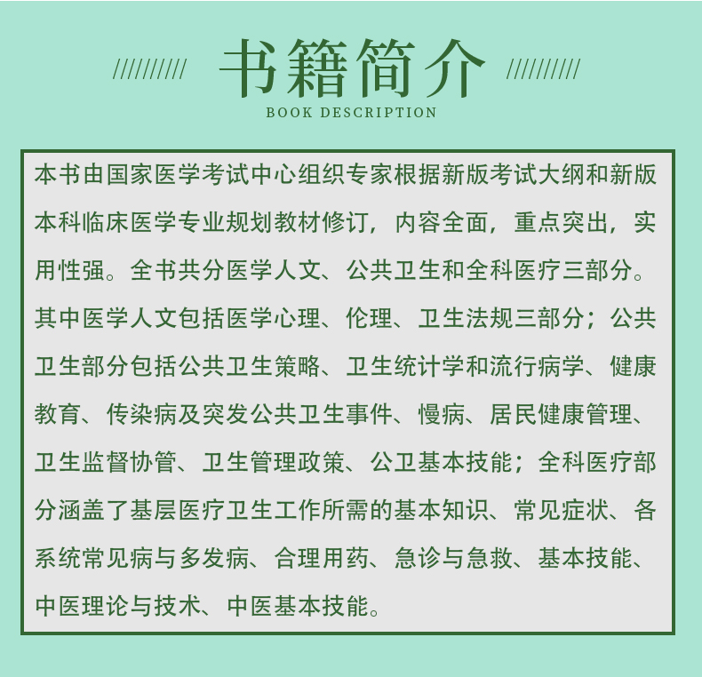 本书由国家医学考试中心组织专家根据新版考试大纲和新版本科临床医学专业规划教材修订,内容全面,重点突出,实用性强。全书共分医学人文、公共卫生和全科医疗三部分。其中医学人文包括医学心理、伦理、卫生法规三部分;公共卫生部分包括公共卫生策略、卫生统计学和流行病学、健康教育、传染病及突发公共卫生事件、慢病、居民健康管理、卫生监督协管、卫生管理政策、公卫基本技能;全科医疗部分涵盖了基层医疗卫生工作所需的基本知识、常见症状、各系统常见病与多发病、合理用药、急诊与急救、基本技能、中医理论与技术、中医基本技能。