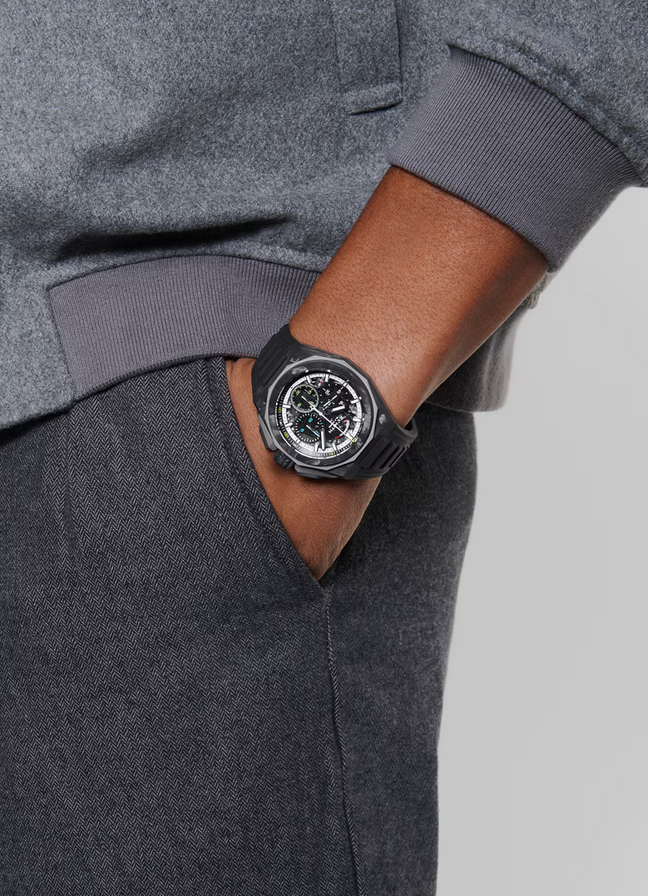 镜面 材质 | 蓝宝石水晶玻璃 | 表盘 | 碳纤维和微喷砂钛金属元素表壳 彩色蓝宝石水晶玻璃表盘,搭配三个黑色计时盘;时标:镀铑刻面,涂覆SuperLuminova SLN C1超级夜光物料;指针:镀铑刻面,涂覆SuperLuminova SLN C1超级夜光物料 计时 动力储备显示 背透 |