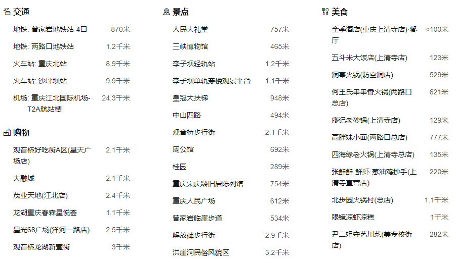 [轨道交通站]以及[机场穿梭巴士始发站];距上清寺牛角沱轨道交通仅3分钟路程,可直通解放碑、观音桥、南坪、杨家坪、重庆火车北站、江北机场等地。周边拥有丰富的[文化旅游资源],10分钟路程便是革命历史陈列馆;重庆市人民大礼堂、三峡博物馆离酒店路程都在步行10分钟。
