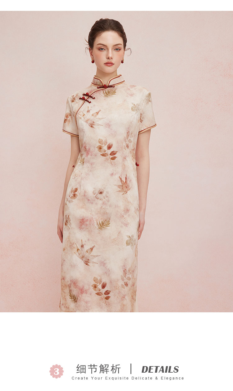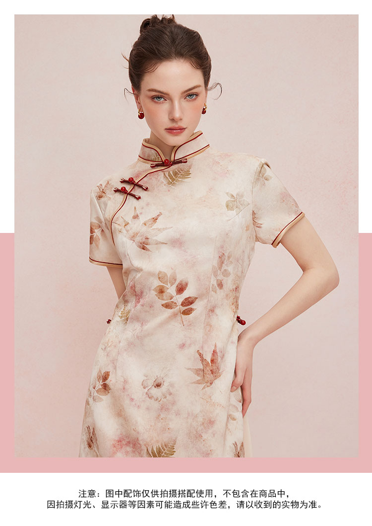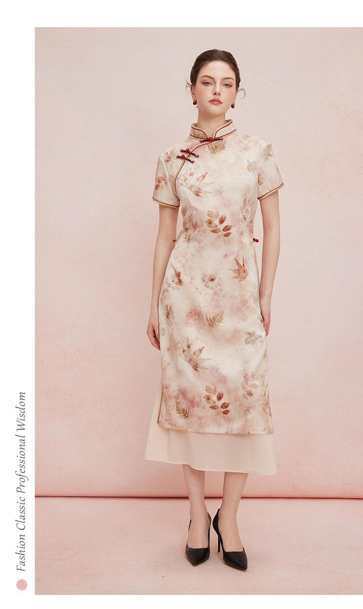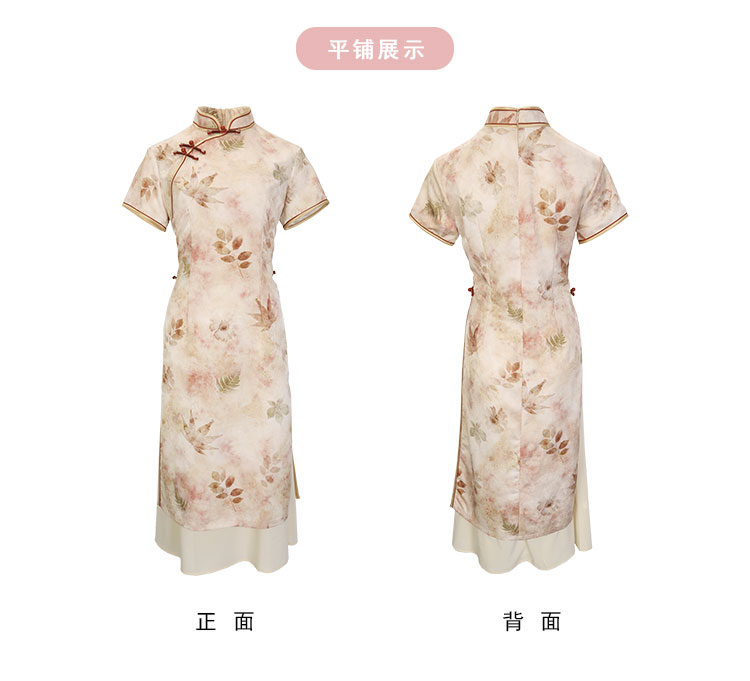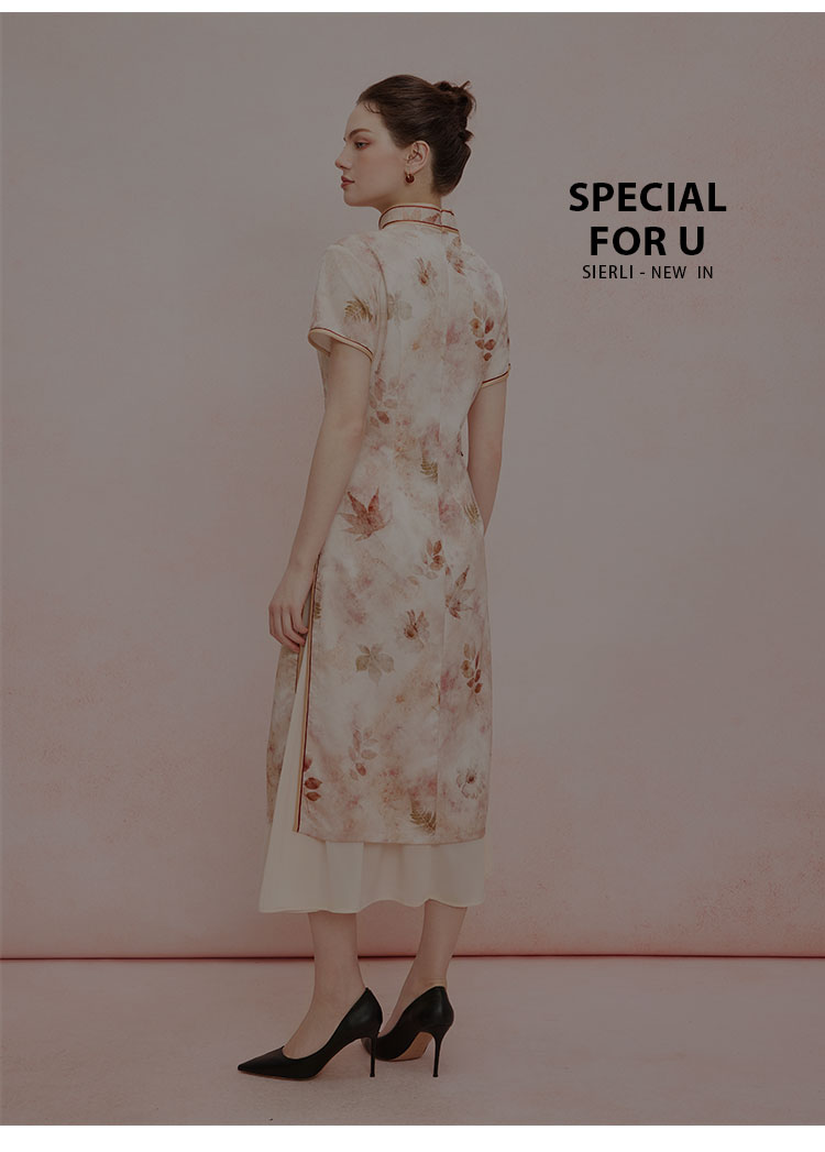 QF822斯尔丽25新款改良式旗袍提花加印花下摆插片A型显瘦浪漫连衣裙