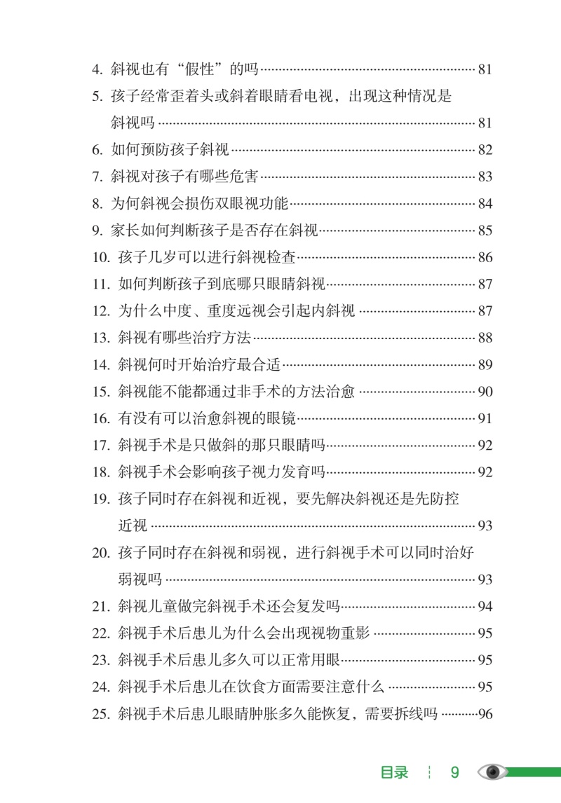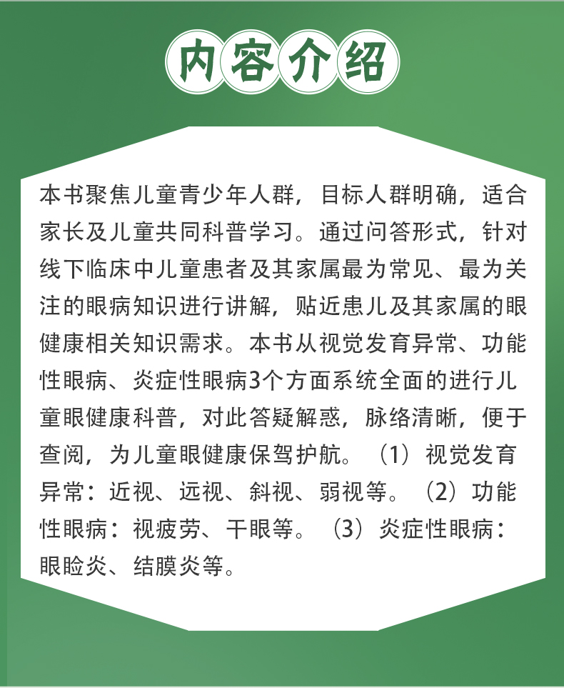 本书聚焦儿童青少年人群,目标人群明确,适合家长及儿童共同科普学习。通过问答形式,针对线下临床中儿童患者及其家属最为常见、最为关注的眼病知识进行讲解,贴近患儿及其家属的眼健康相关知识需求。本书从视觉发育异常、功能性眼病、炎症性眼病3个方面系统全面的进行儿童眼健康科普,对此答疑解惑,脉络清晰,便于查阅,为儿童眼健康保驾护航。 (1)视觉发育异常:近视、远视、斜视、弱视等。 (2)功能性眼病:视疲劳、干眼等。 (3)炎症性眼病:眼睑炎、结膜炎等。