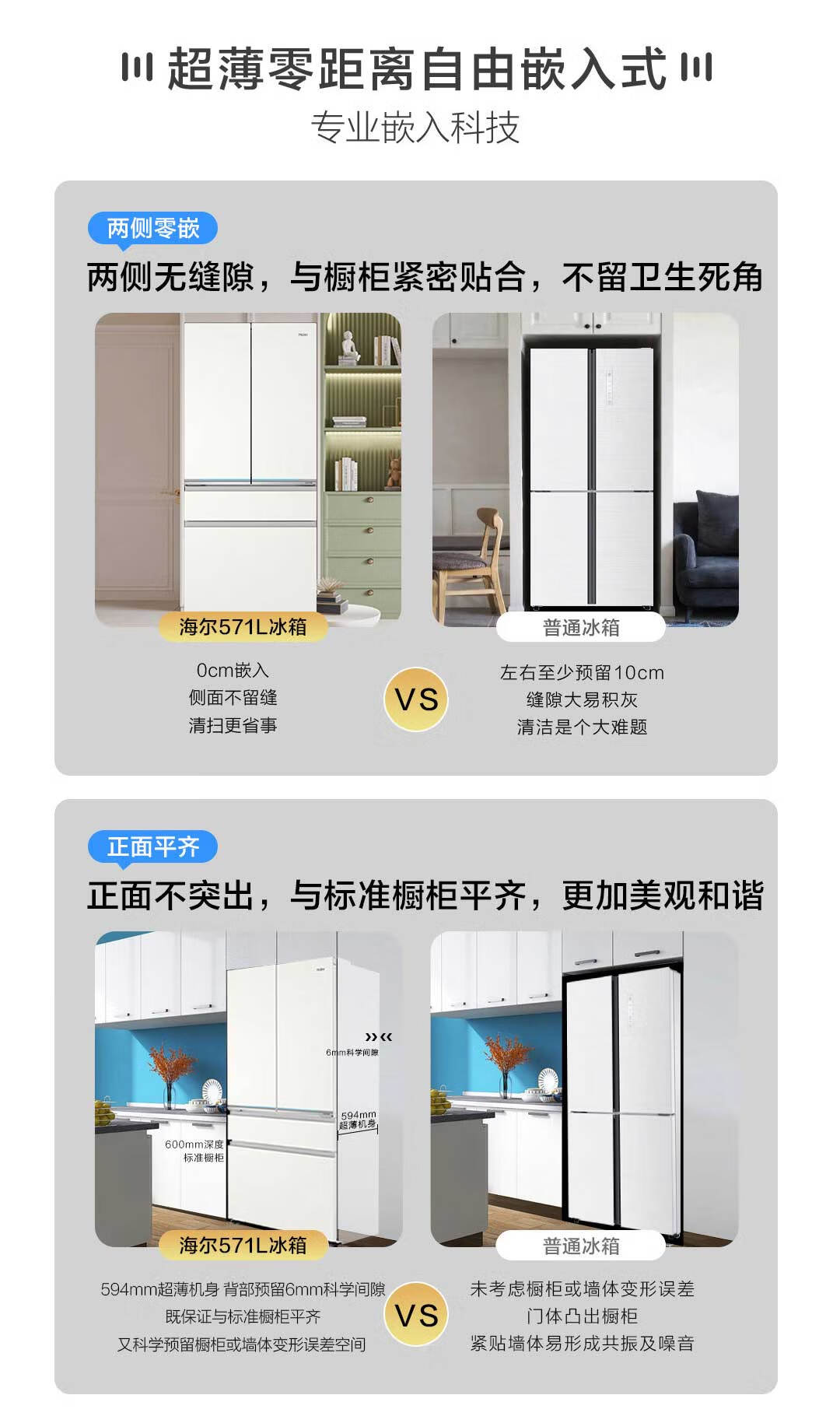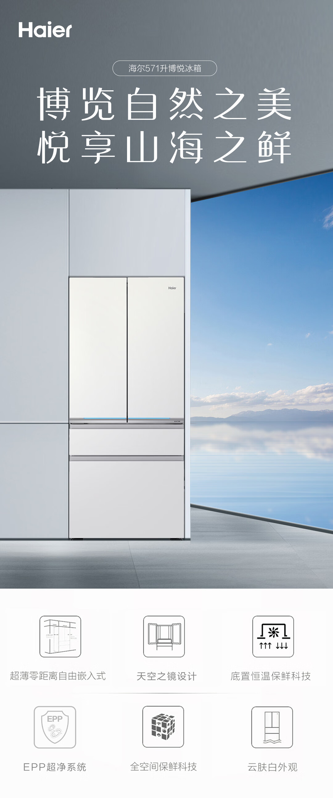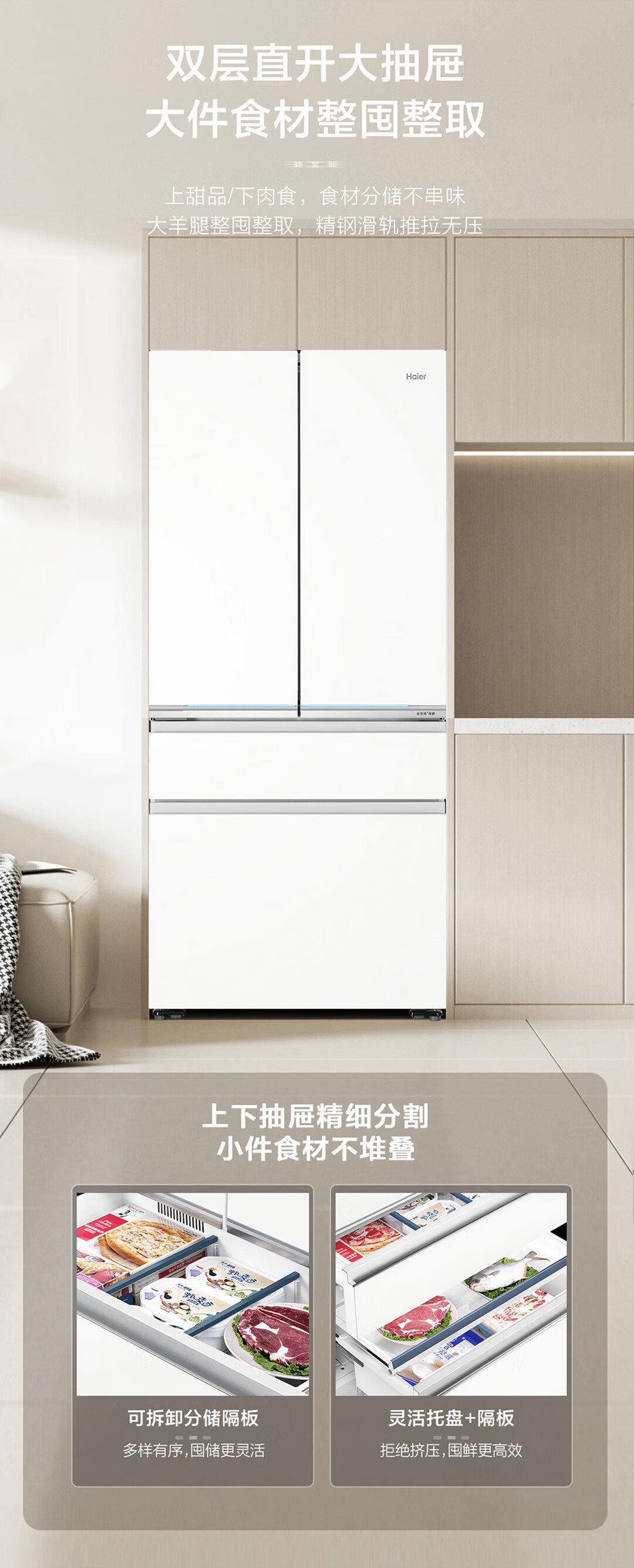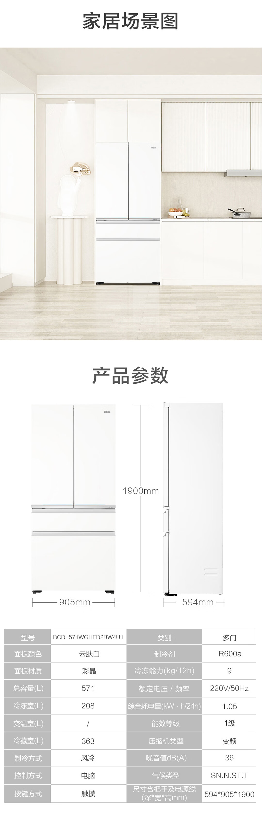 海尔571升全空间保鲜超薄零距离自由嵌入式风冷无霜一级变频多门家用大容量电冰箱 法式四开门 BCD-571WGHFD2BW4U1