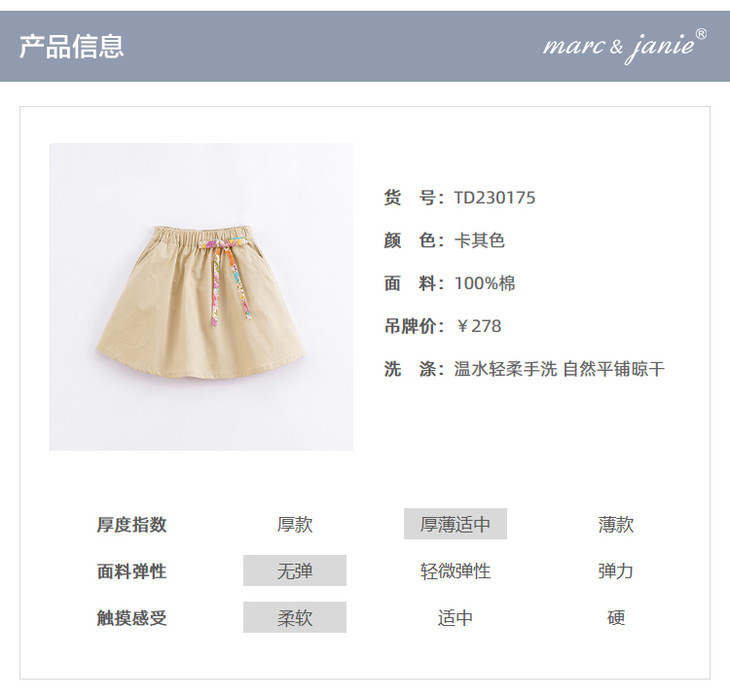 马克珍妮春装新款 女童田园风全棉半身裙 儿童短裙230175