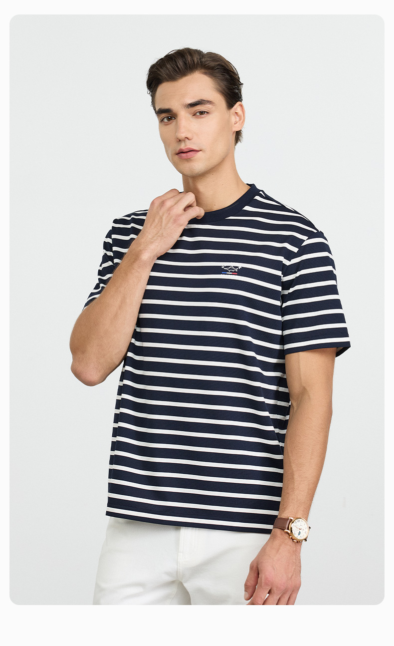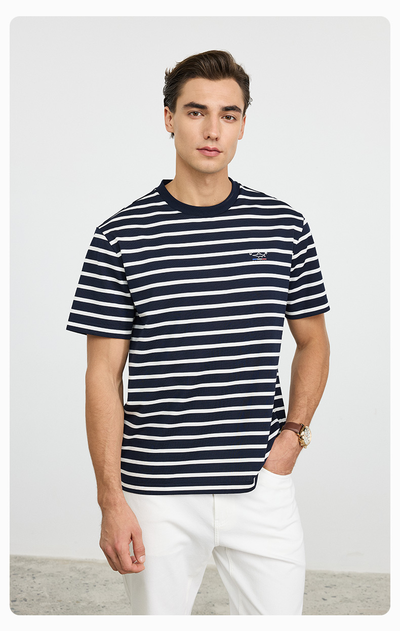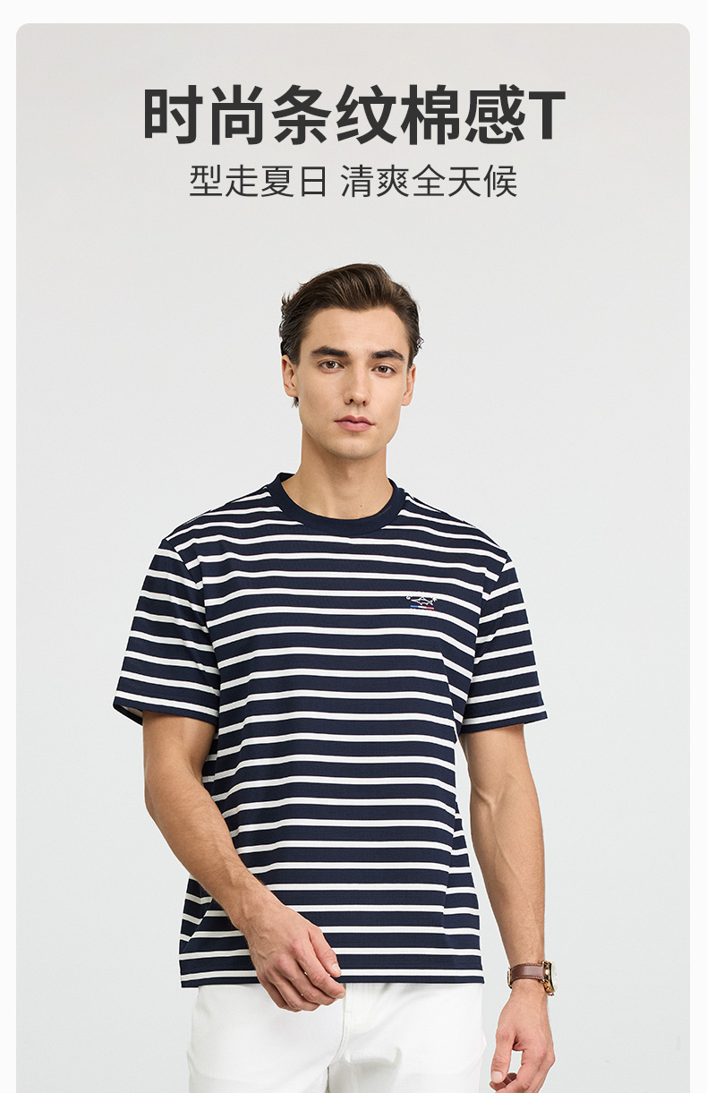 【棉混纺】德鲨条纹短袖圆领T恤男2026夏新款休闲弹力上衣打底衫