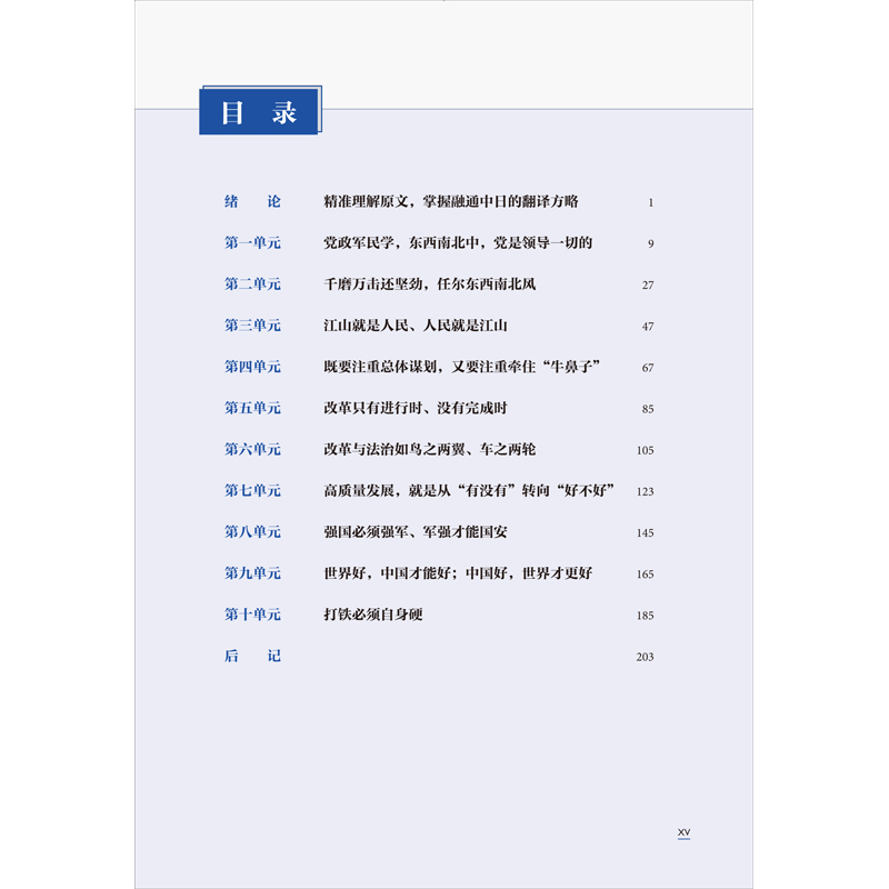 《高级汉日翻译教程》属于高等学校外国语言文学类专业“理解当代中国”系列教材日语系列教材,面向翻译硕士专业学位研究生、翻译学学术学位硕士研究生和日语语言文学学术学位硕士研究生。教材更加重视语篇翻译策略,重视对翻译过程中关键问题和难点的处理,注重国际传播效果,同时兼顾不同类型时政文本的翻译演练。教材包含绪论、10个单元和后记。绪论深入阐述中国时政文献的特点、翻译原则,强调精准理解原文、掌握融通中日的翻译方略的重要性。各单元选篇主要来自《习近平谈治国理政》第一卷、第二卷、第三卷,《在庆祝中国共产党成立100周年大会上的讲话》和《中共中央关于党的百年奋斗重大成就和历史经验的决议》。各单元探讨习近平新时代中国特色社会主义思想的一个重要方面,包括:1)中国特色社会主义最本质的特征和中国特色社会主义制度的最大优势;2)坚持和发展中国特色社会主义总任务;3)坚持以人民为中心的发展思想;4)中国特色社会主义事业总体布局和战略布局;5)全面深化改革总目标;6)全面推进依法治国总目标;7)必须坚持和完善社会主义基本经济制度;8)党在新时代的强军目标;9)中国特色大国外交;10)全面从严治党的战略方针。各单元结构相同,分为核心概念(中日文对照)、关键语句(中日文对照)、翻译实践 (两个文本,分为课前试译、译文评析、点评练习等环节)、课后练习及专题探讨(包括翻译实践和专题探讨)、拓展思考。