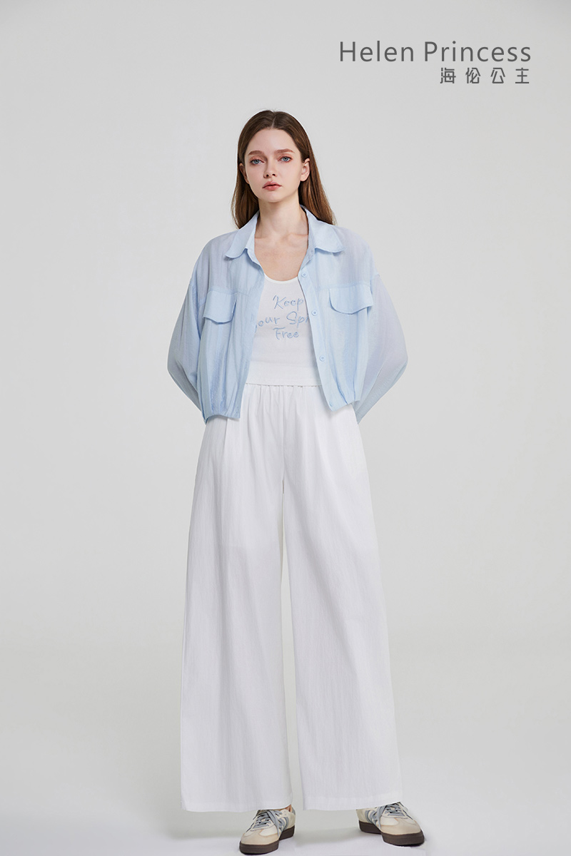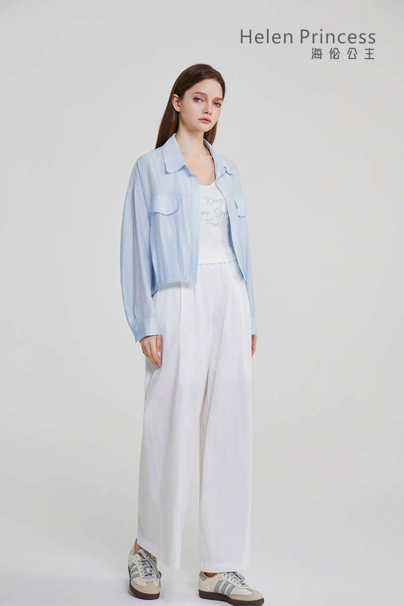 蓝白色三件套套装,配色清新自然。浅蓝色翻领短外套,宽松版型简洁利落。内搭圆领字母刺绣背心,柔软舒适。下装高腰白色阔腿长裤,自带内衬打底,亲肤透气,行动自如。