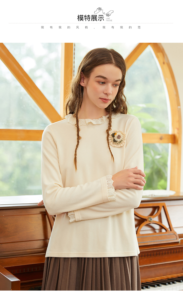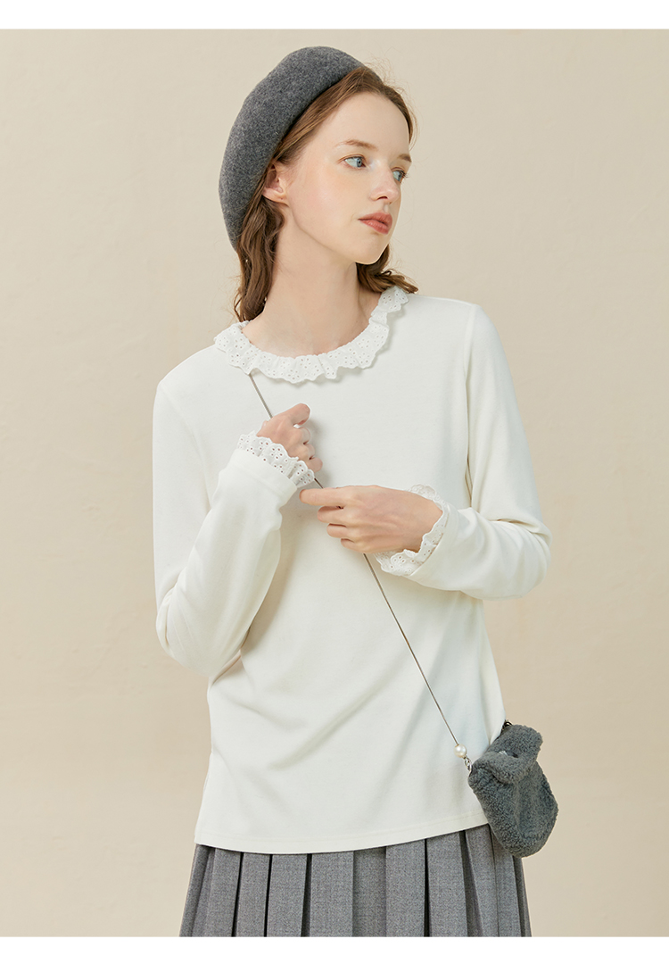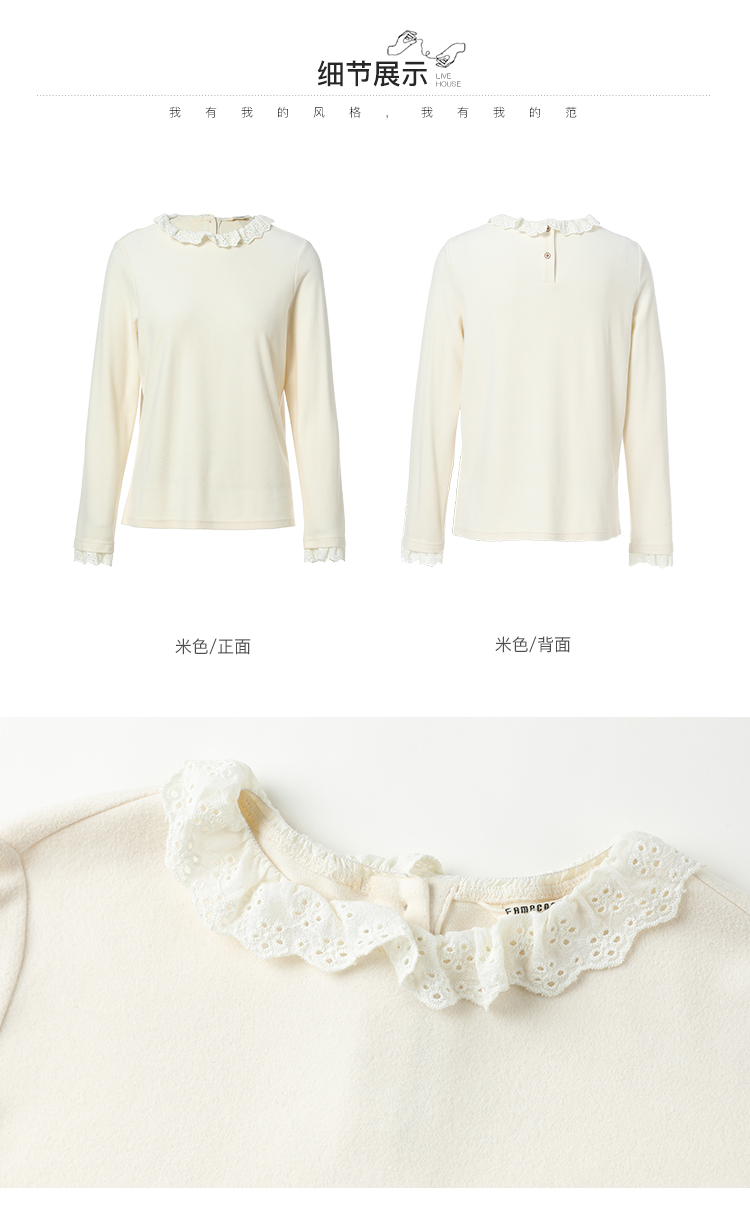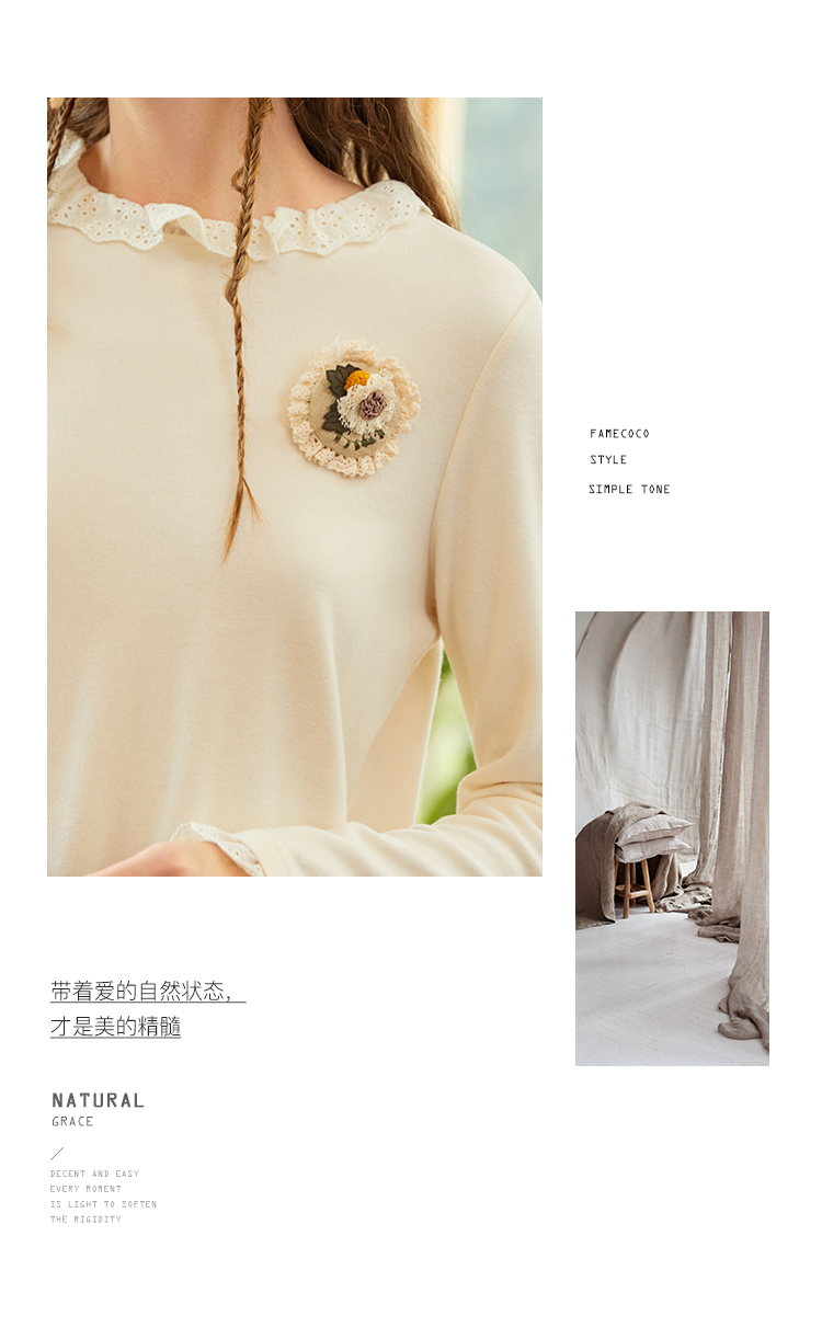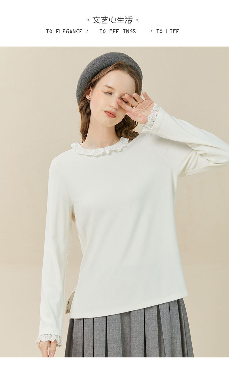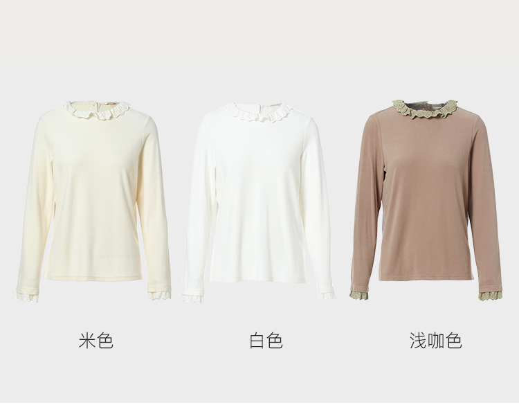 famecoco范可儿原创设计高弹花边t恤女纯色磨毛打底衫F228BB010