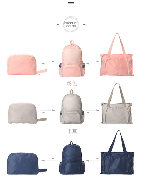 ✅一包两用,可双肩可单挎 折叠收纳很方便 就算是一个手残党、糙汉子 也是随便叠一下就塞进去 不同的展开方法 能让你得到两个不同的包 🔺当整个包展开后 就是个11L的普通双肩包 🔺当整个包由外往内翻 就是一个手提包,有9L的容量 可轻松将下备用衣物、相机、充电宝 防晒喷雾、笔记本文具等随身物品 户外旅行和购物逛街甚至当妈咪包都可以