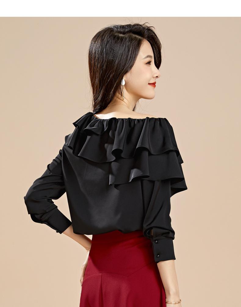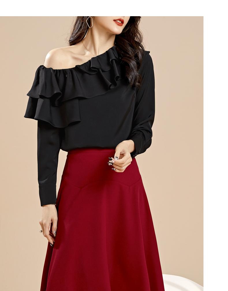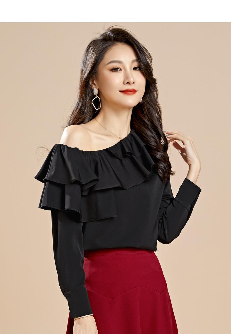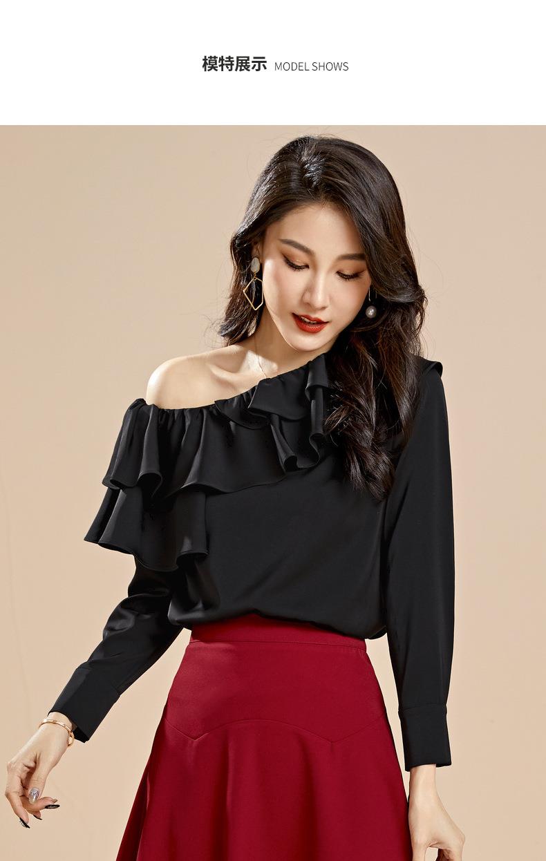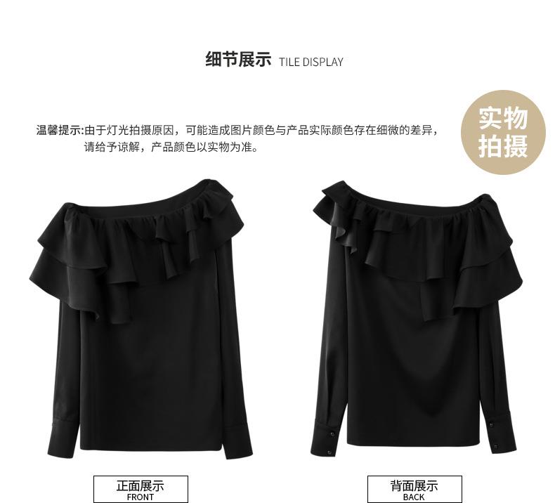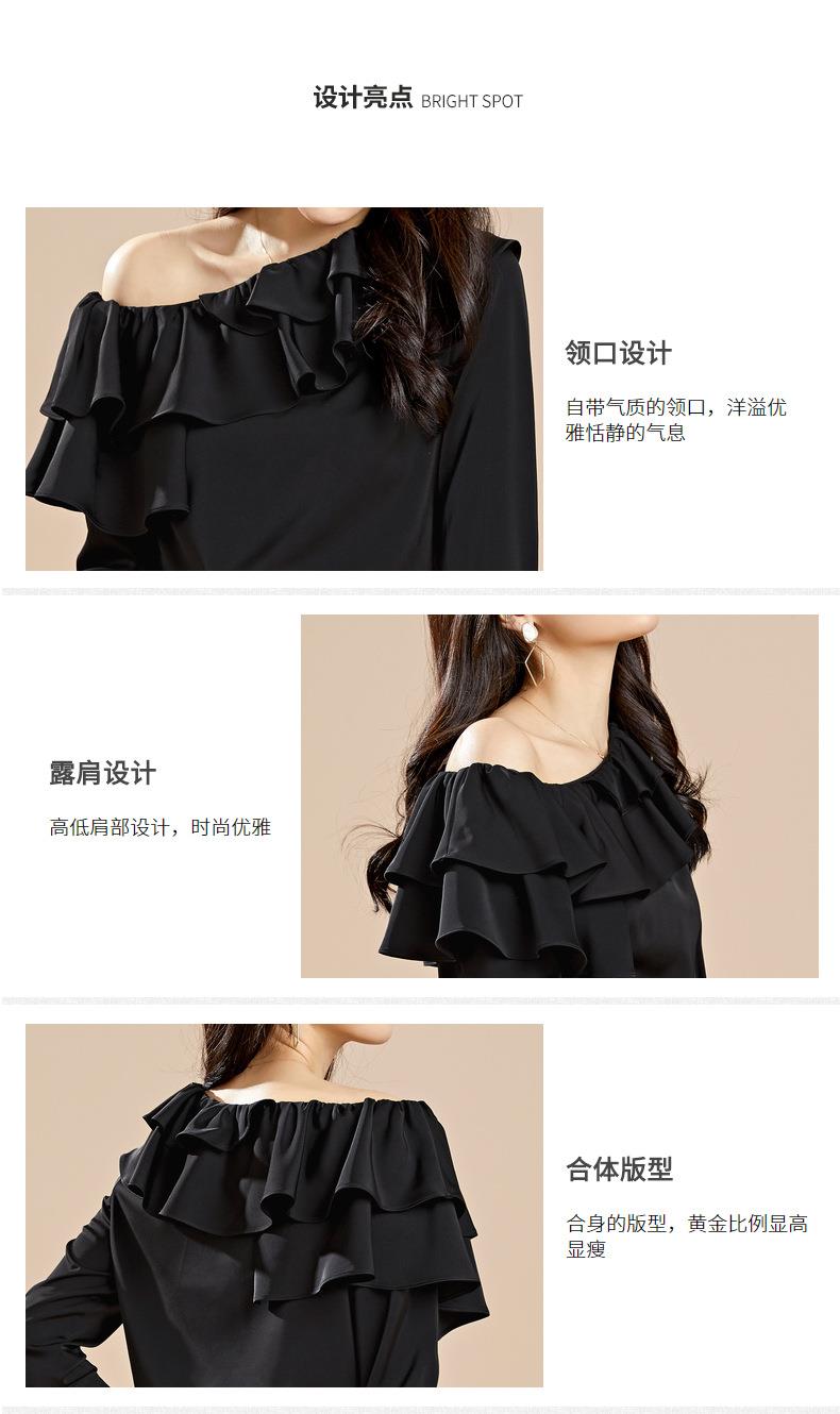 百姿 秋季新款韩版女装气质修身时尚斜边露肩雪纺衫女长袖92037