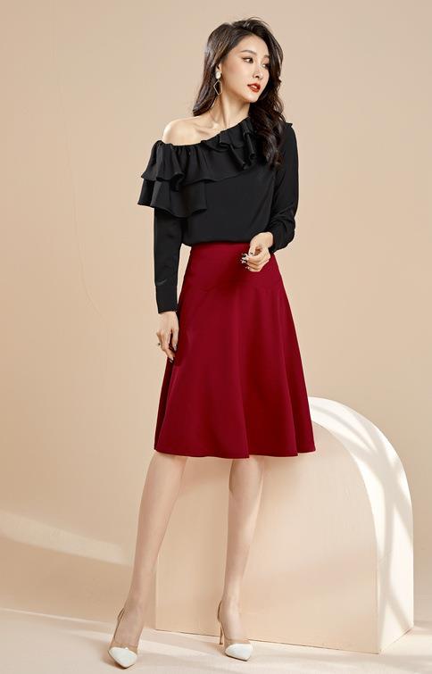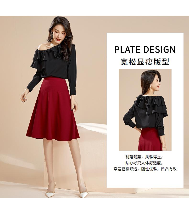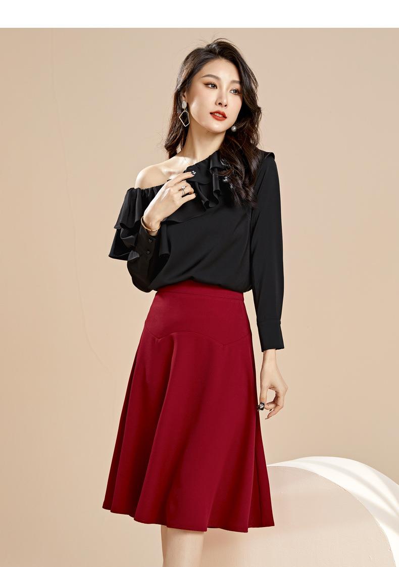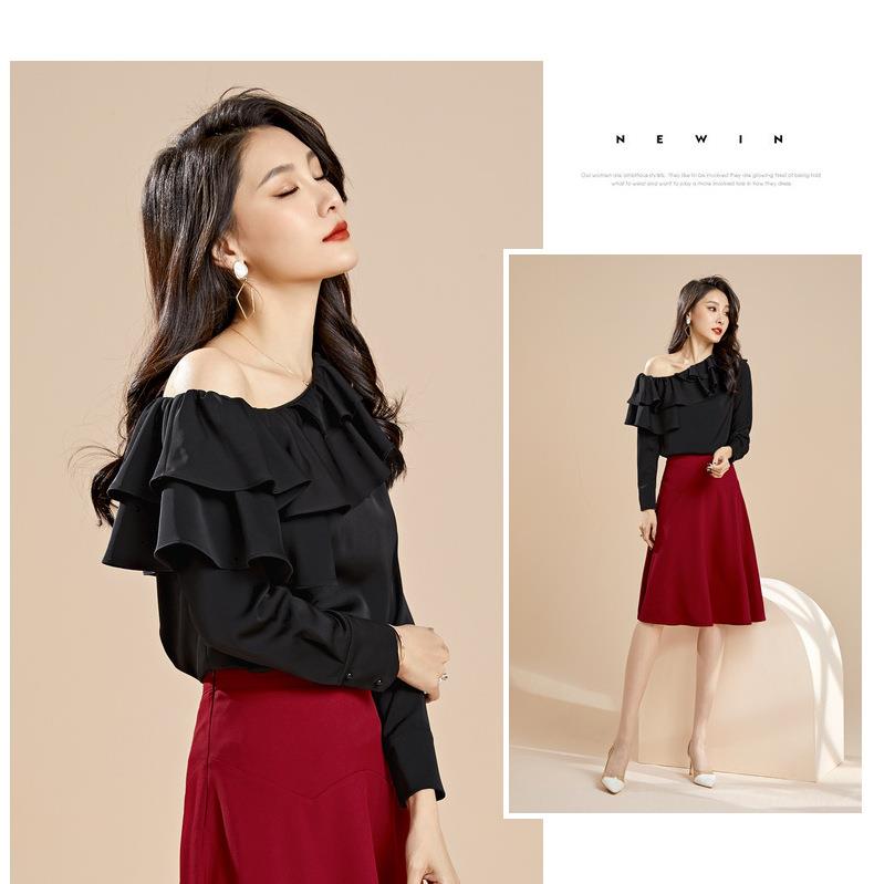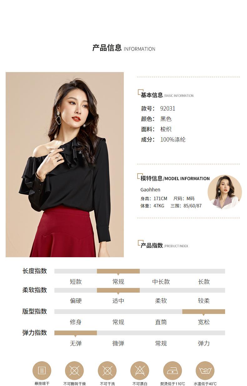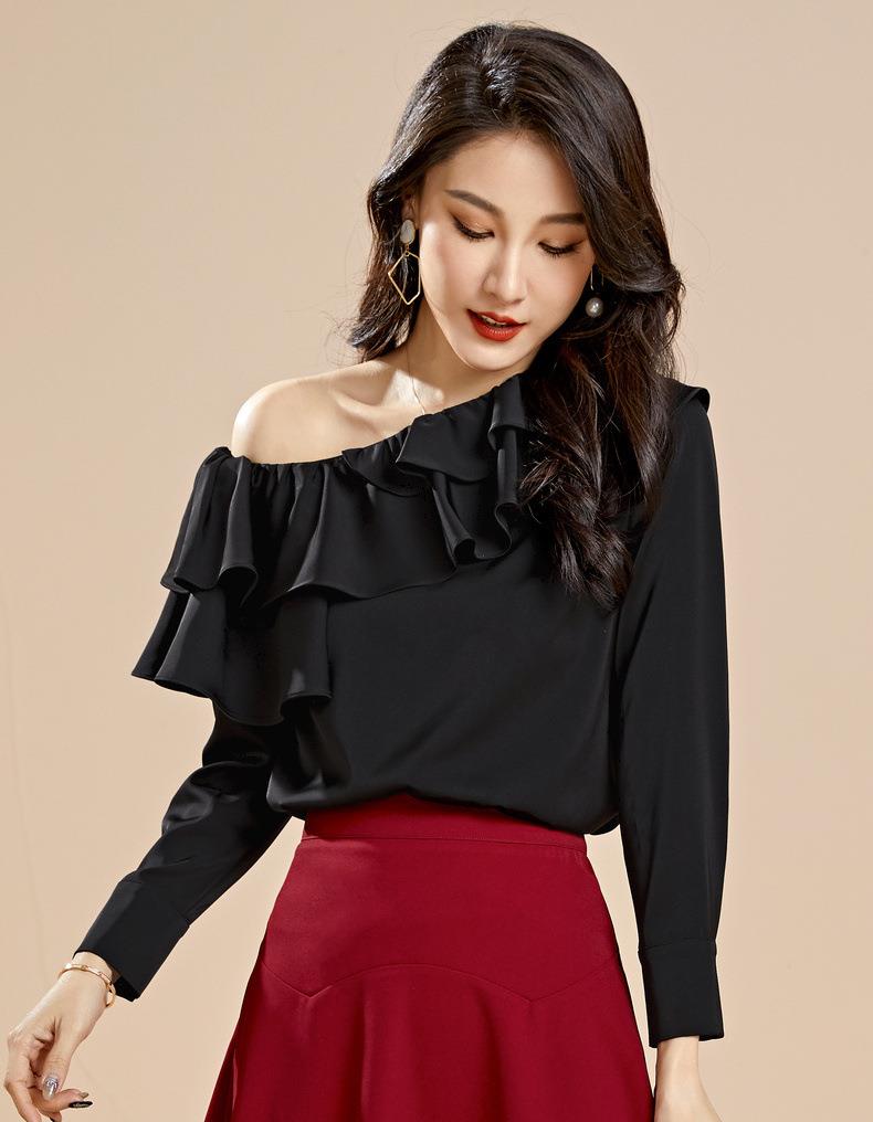 百姿 秋季新款韩版女装气质修身时尚斜边露肩雪纺衫女长袖92037