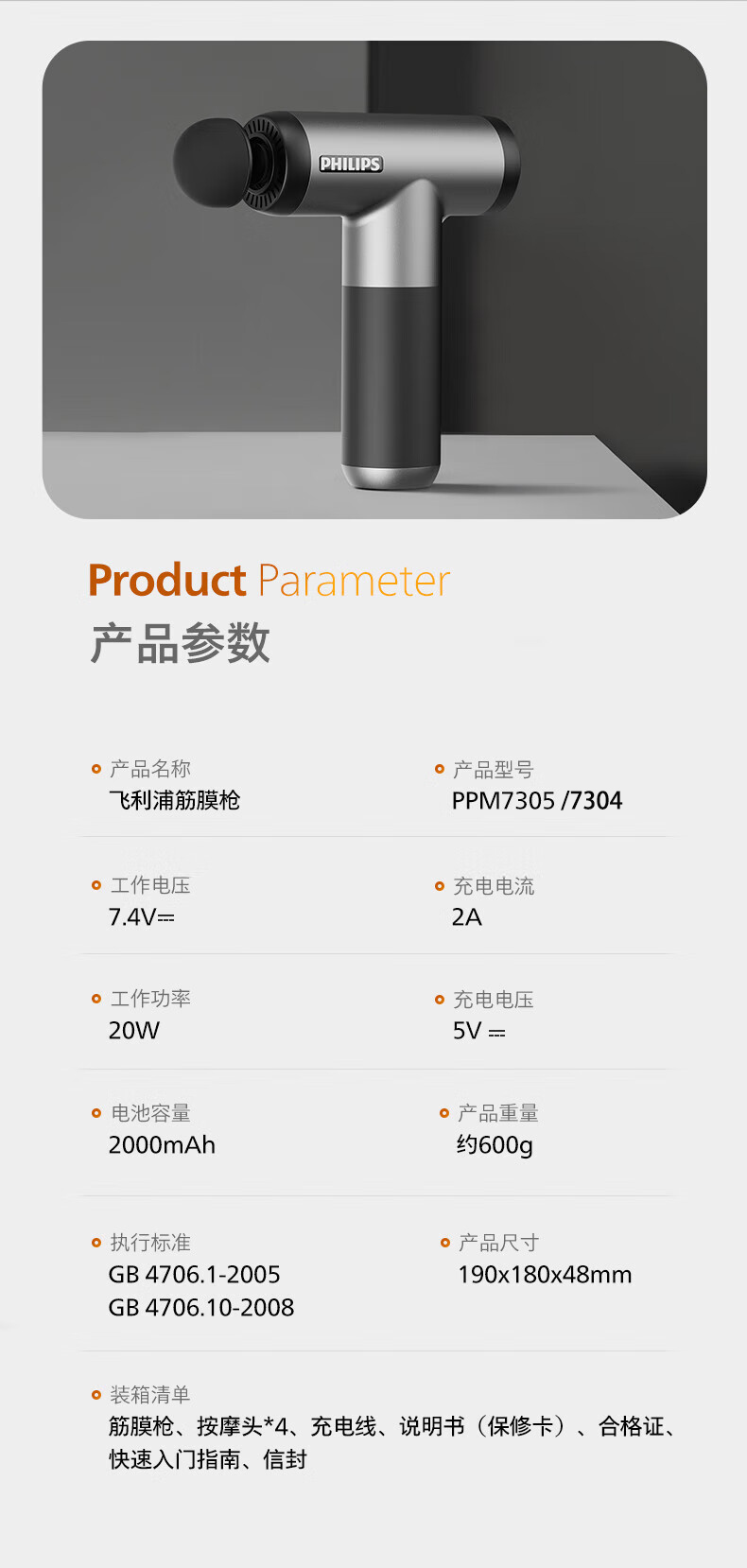 飞利浦筋膜枪PPM7304全身肌肉按摩器专业级家用健身肌肉仪肩颈腰椎腿颈PPM7305(蓝灰颜色随机)