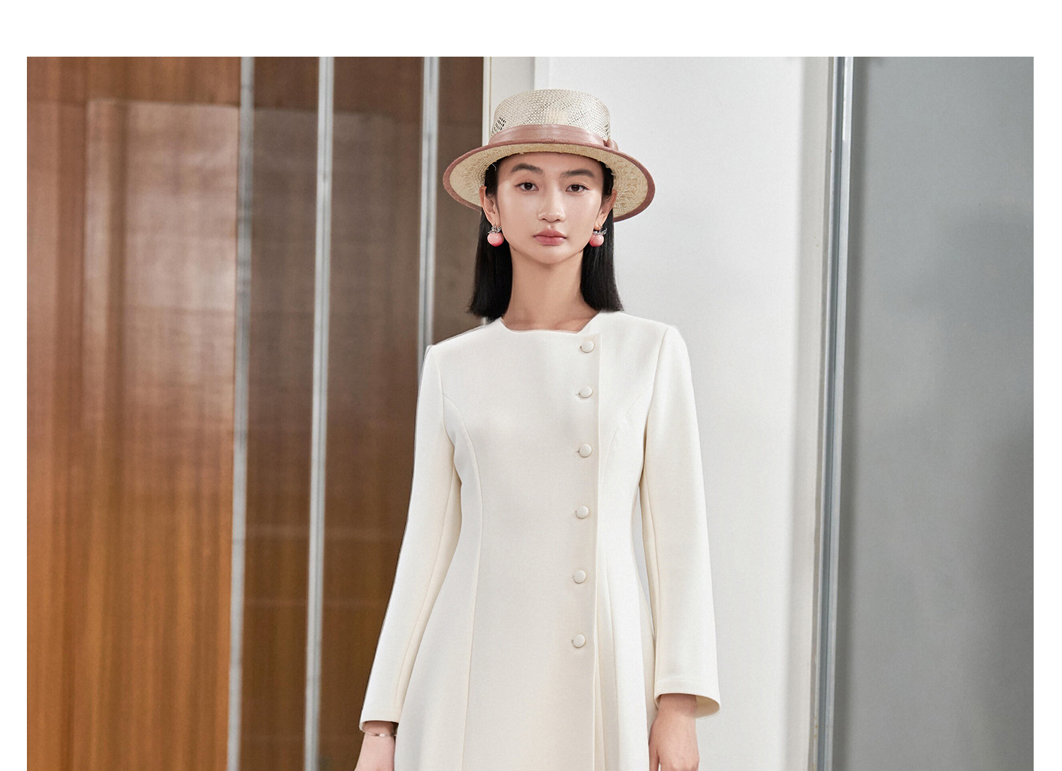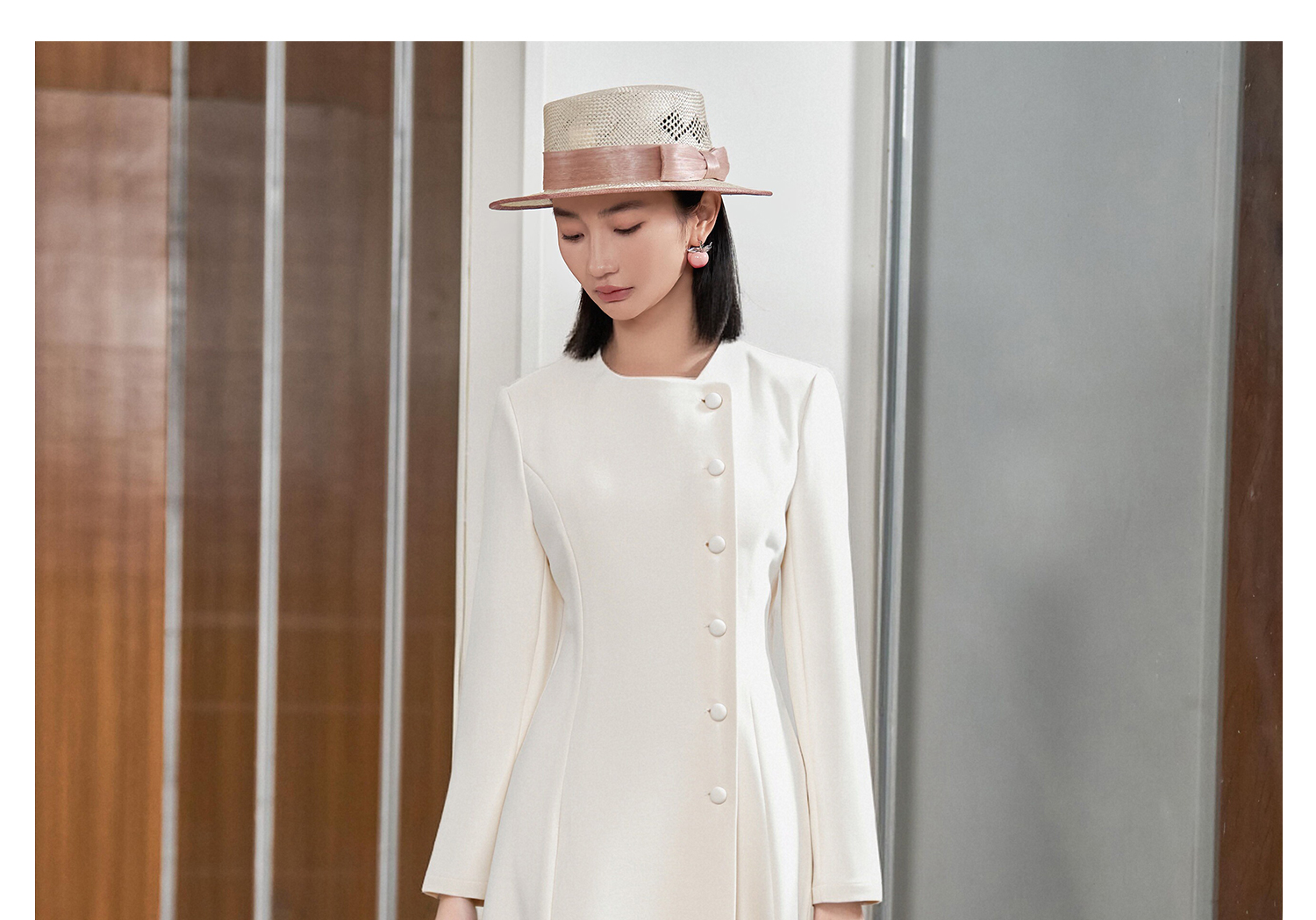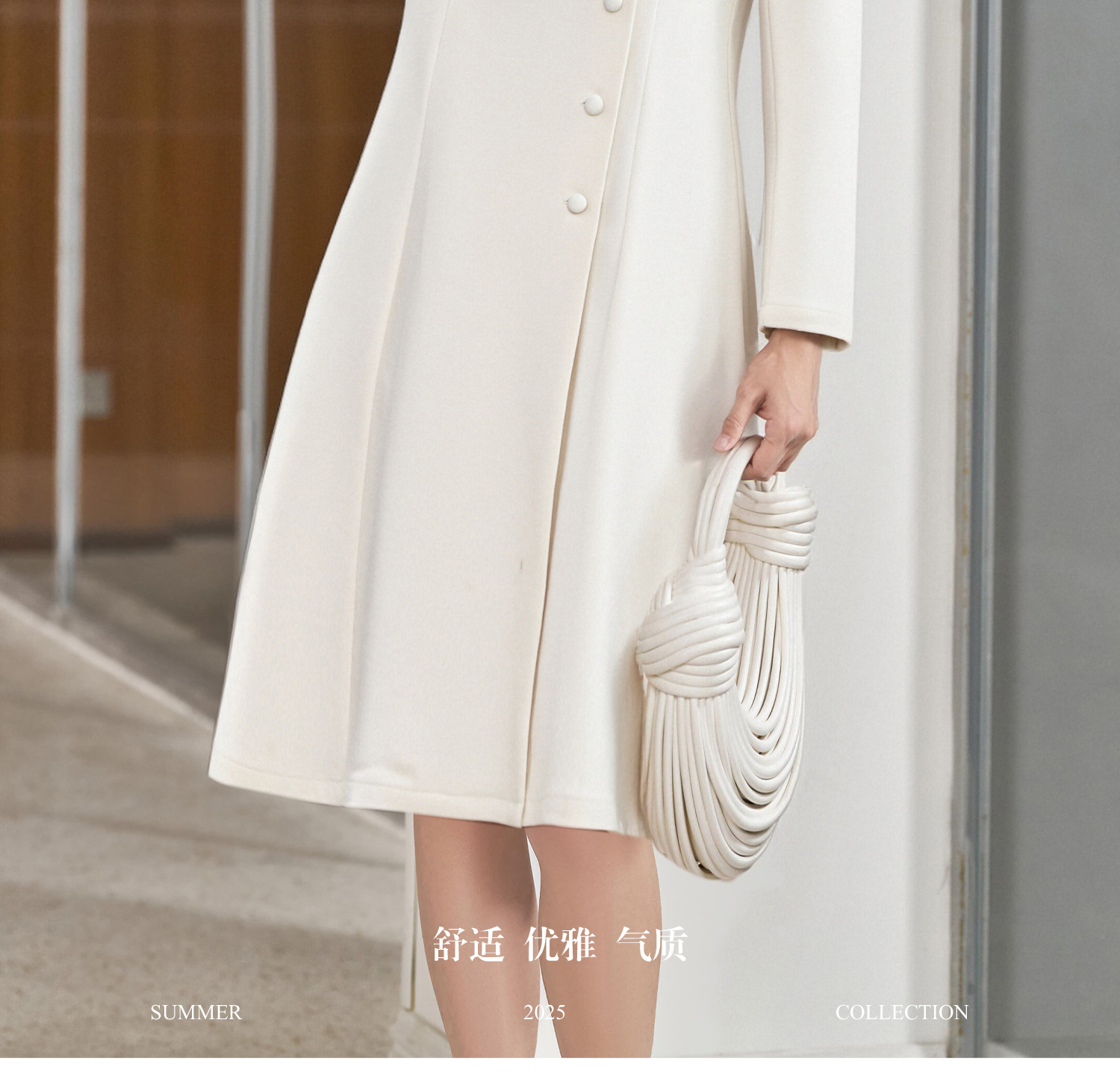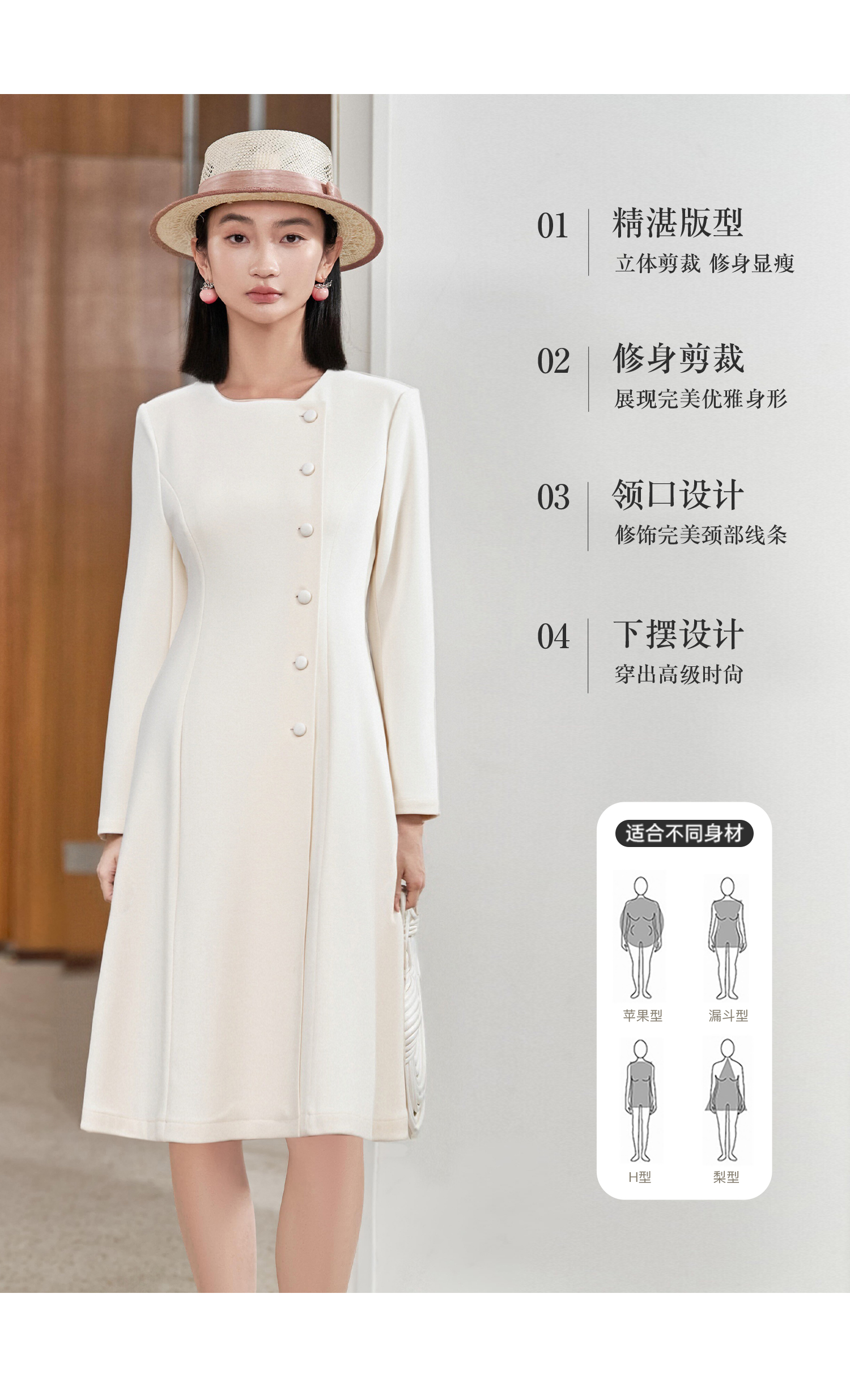 米思阳2026春季新款通勤优雅风收腰显瘦A字连衣裙圆领长袖不规则排扣裙子女4550