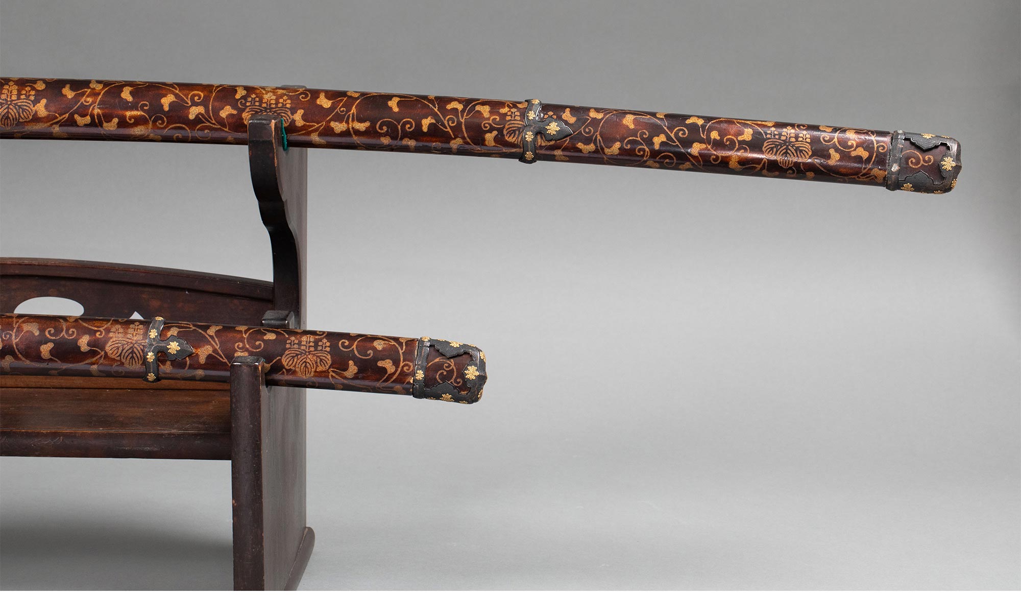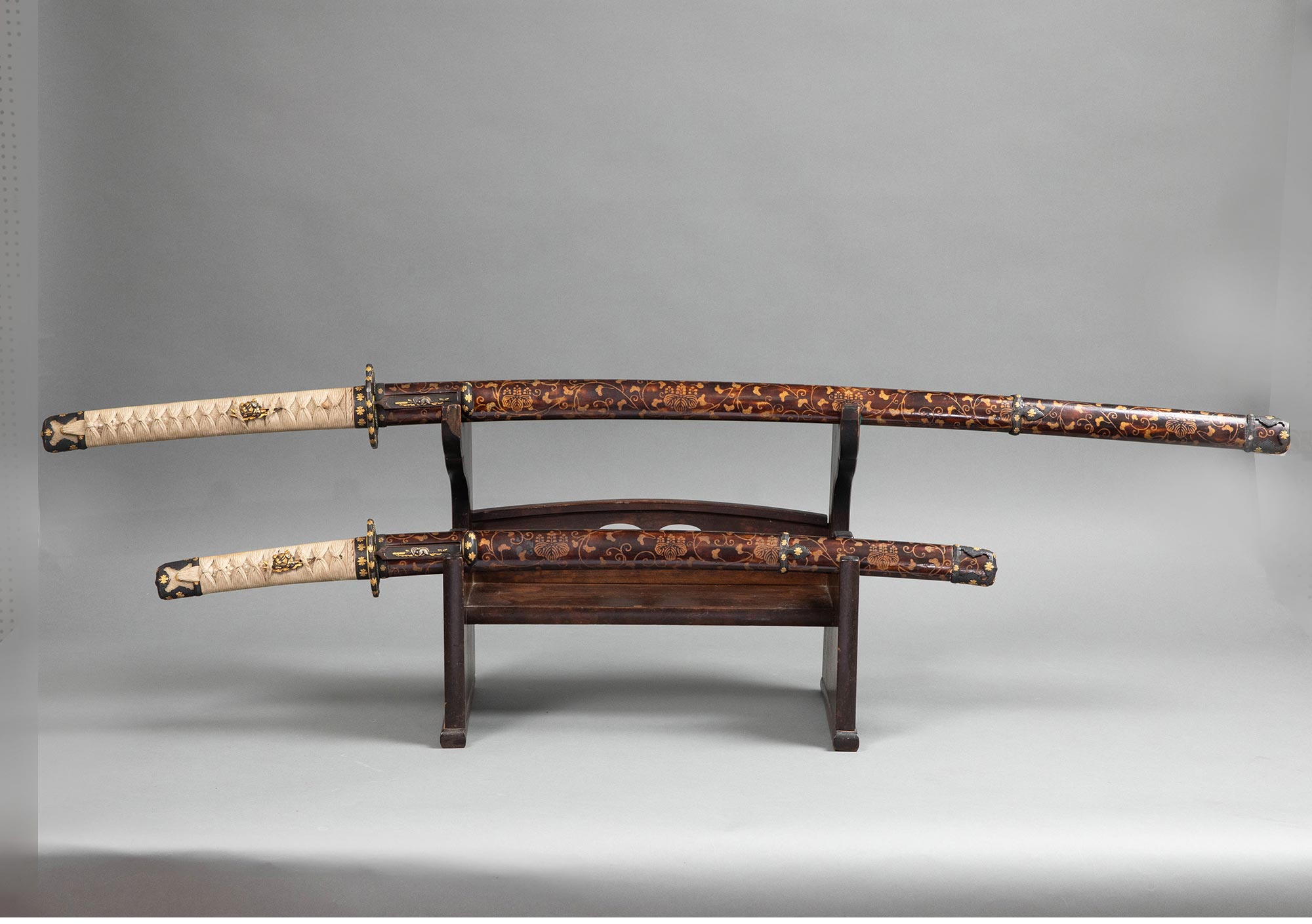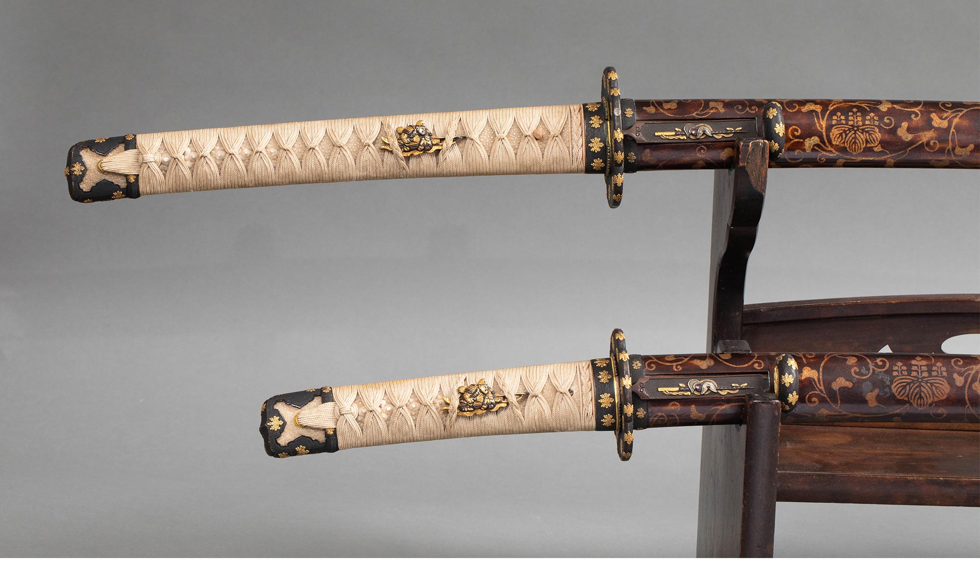 17-18世纪日本江户时代信濃大掾藤原忠国及信高出品武士主题金银精雕装饰绢丝鲛皮及桐纹莳绘大小武士刀一对 带刀架