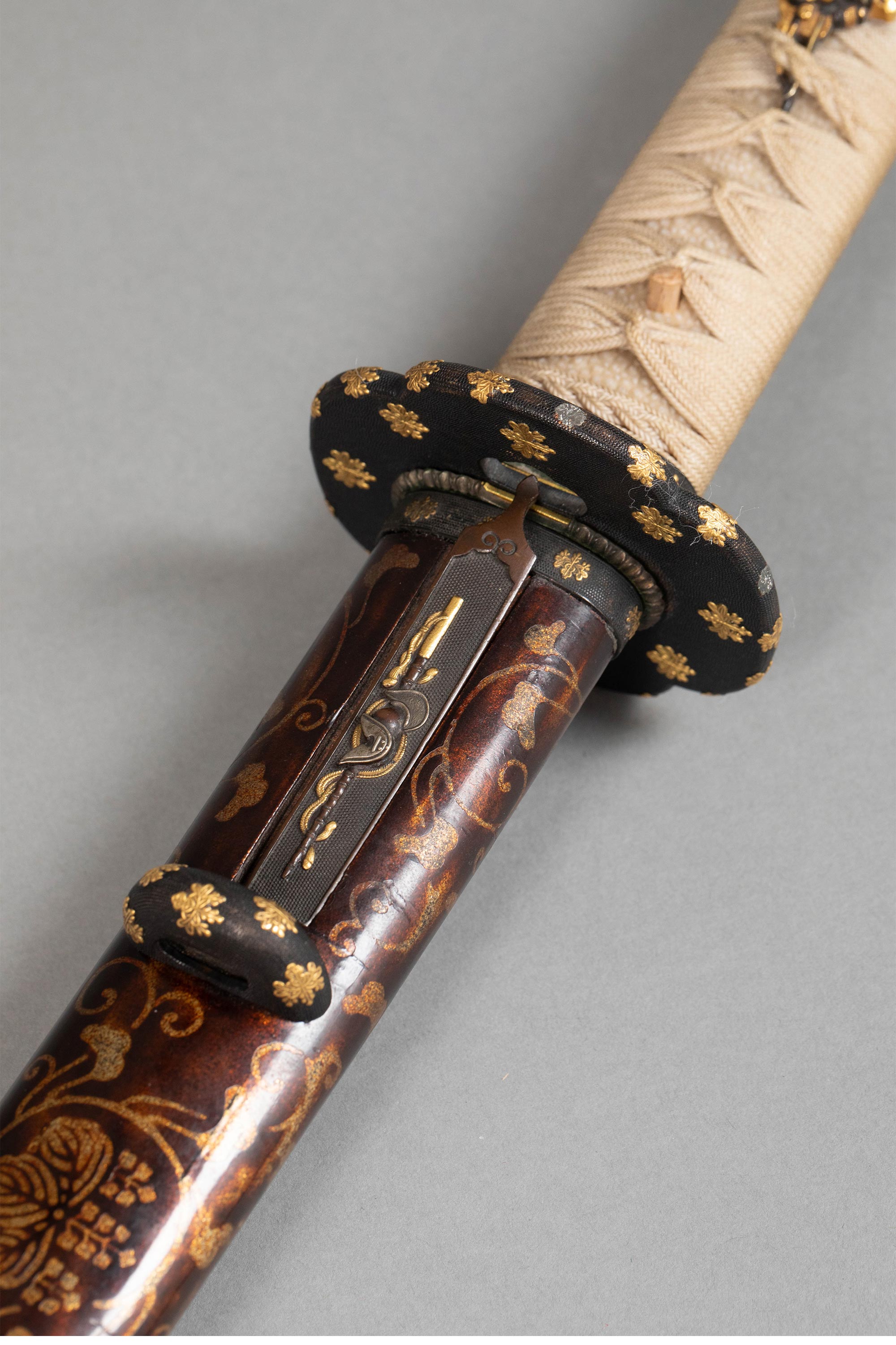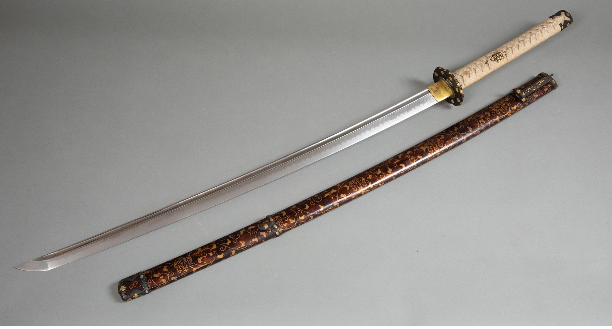 独角鹿西洋古董 日本江户时代信濃大掾藤原忠国及信高出品武士主题金银精雕装饰绢丝鲛皮及桐纹莳绘大小武士刀一对 带刀架【未开刃】