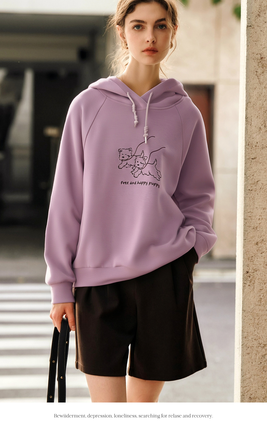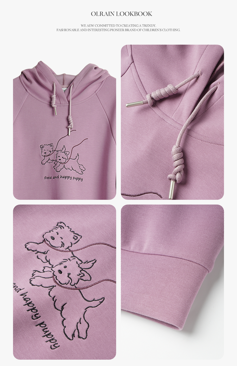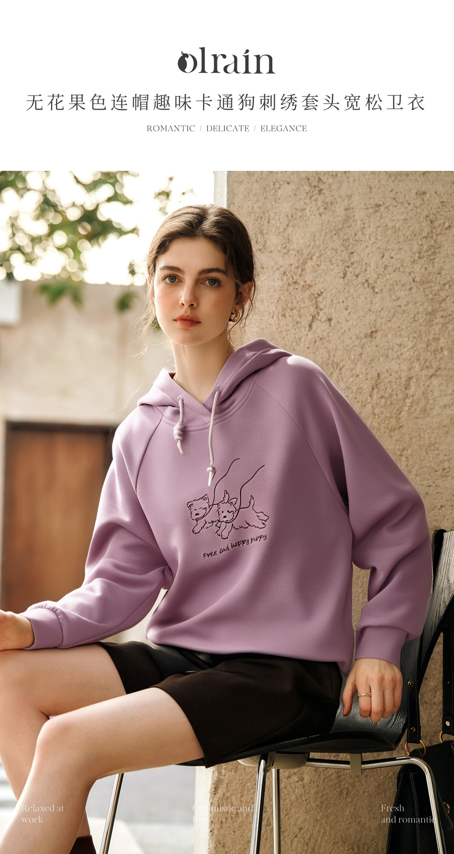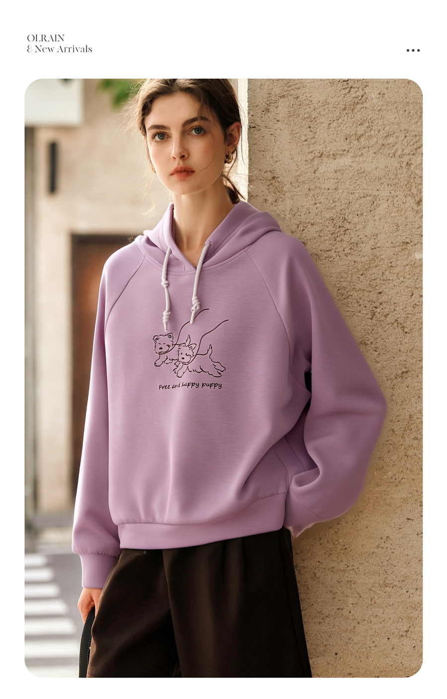 OLrain欧芮儿紫色连帽宽松卫衣2025秋季新款趣味卡通狗刺绣上衣