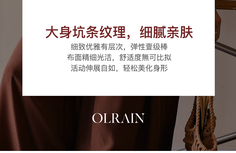 - “精致”是欧芮儿olrain品牌文化的核心,欧芮儿认为,精致的女人,不但要外在动人,更要内在迷人,内外兼修,有魅力、有气质、有内涵,自信而不自傲,优雅而不矫揉,自有万种风情而不轻浮,更不故作矜持。