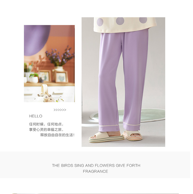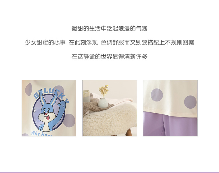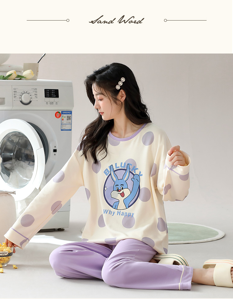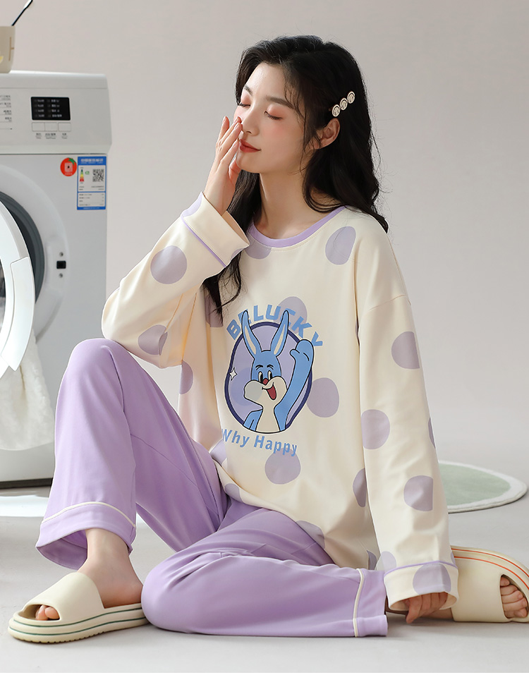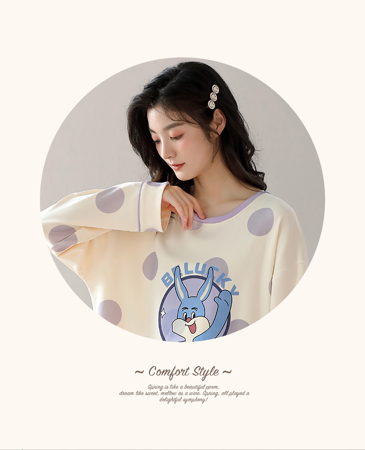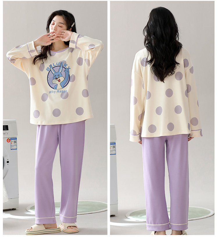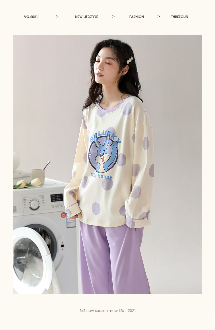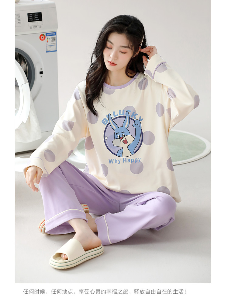 洁丽雅棉质女士大码圆领家居服个性印花舒适亲肤长袖长裤套装