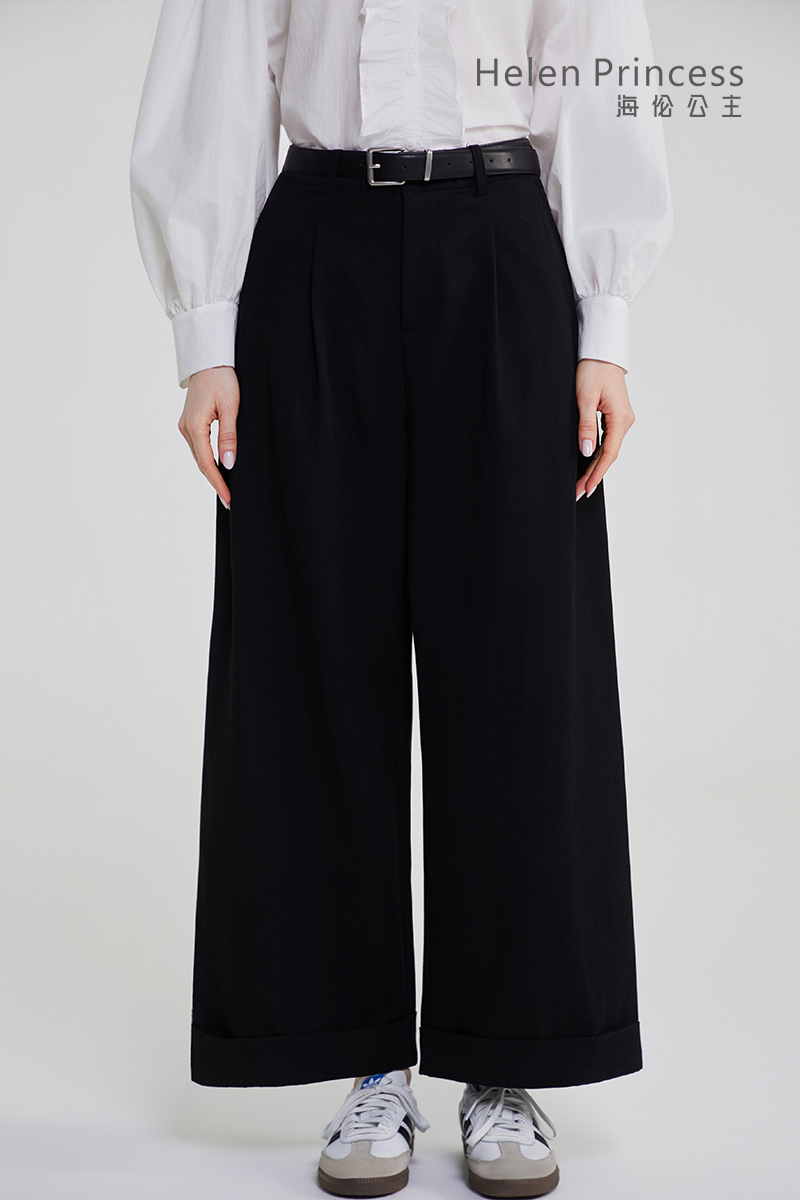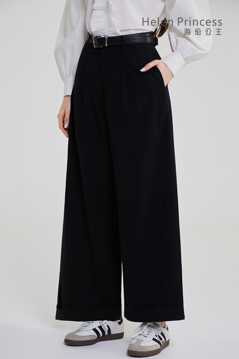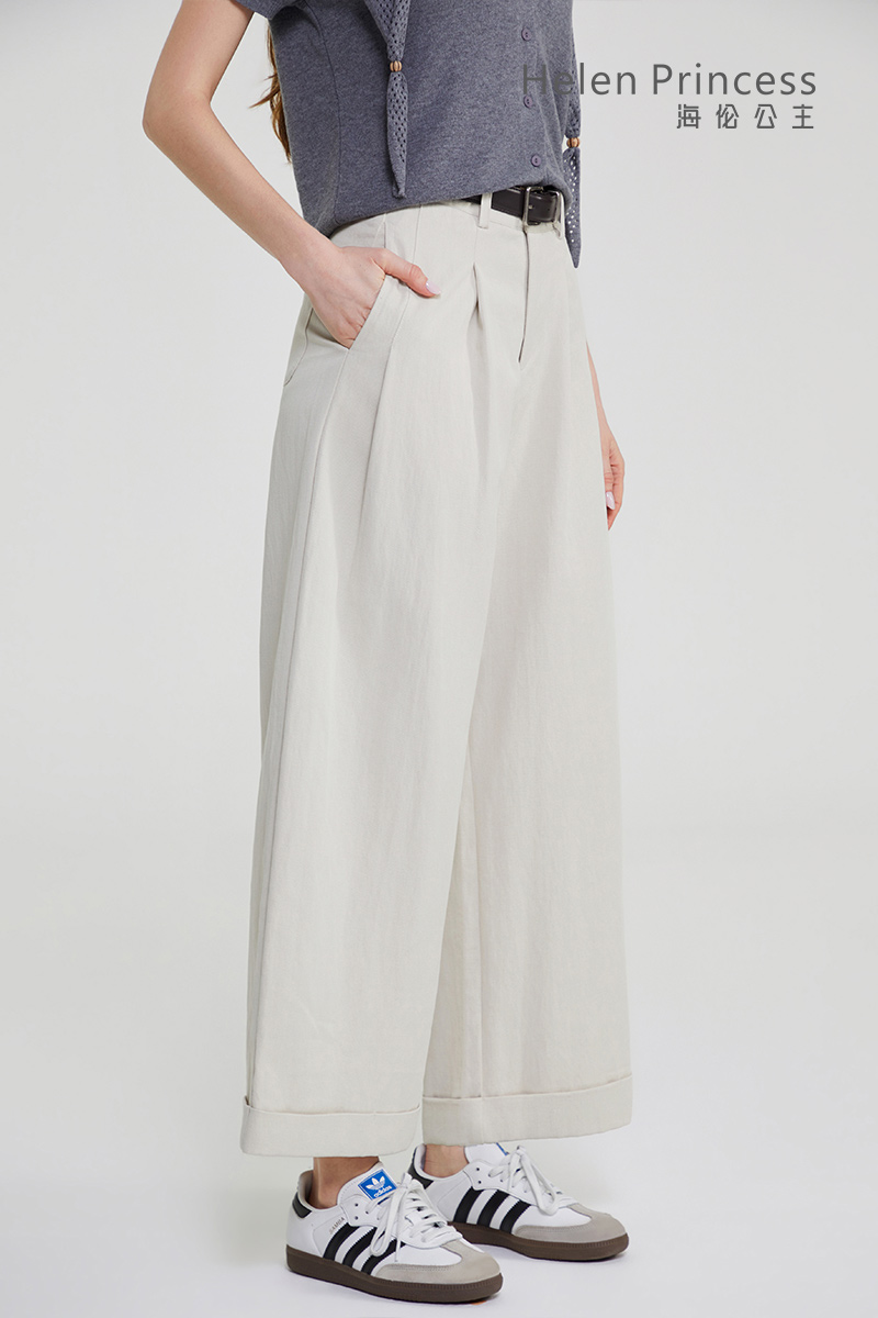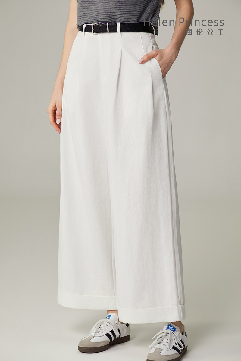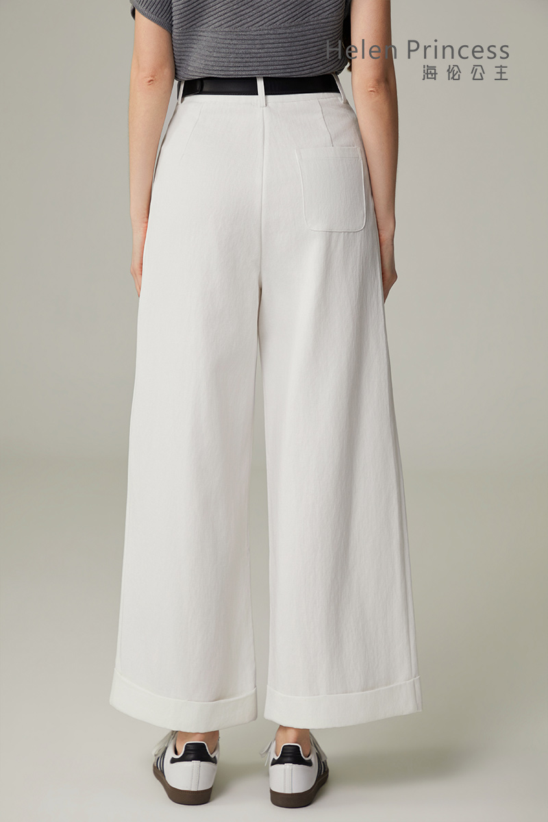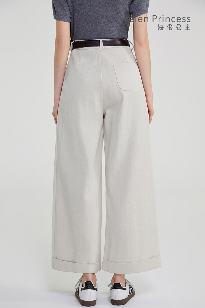 垂坠感面料挺括有型,带来舒适自在的穿着体验。高腰设计搭配时髦腰带,轻松勾勒腰线,拉长腿部比例;卷边裤腿,休闲自然,行走间尽显随性大气。