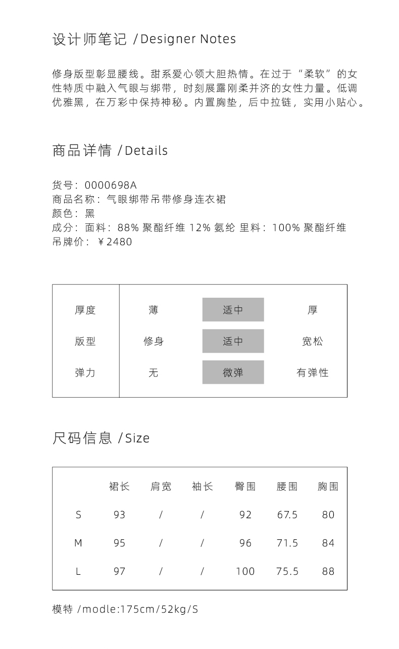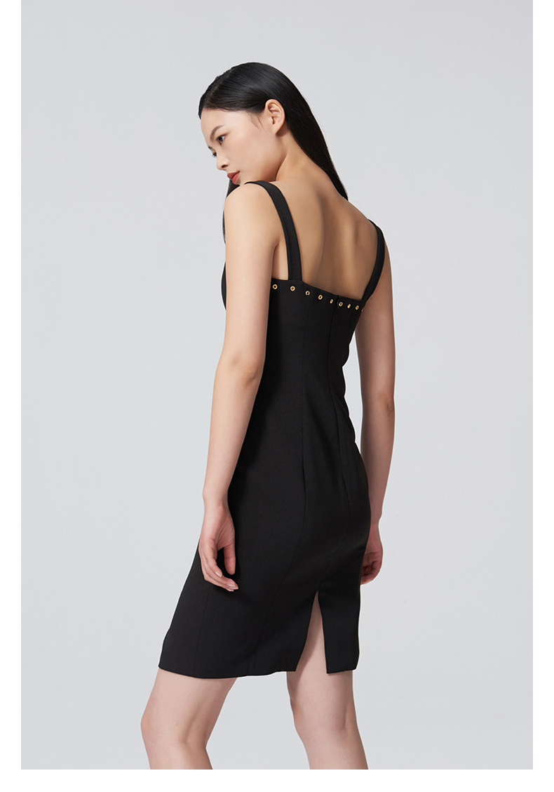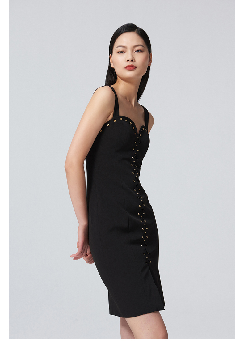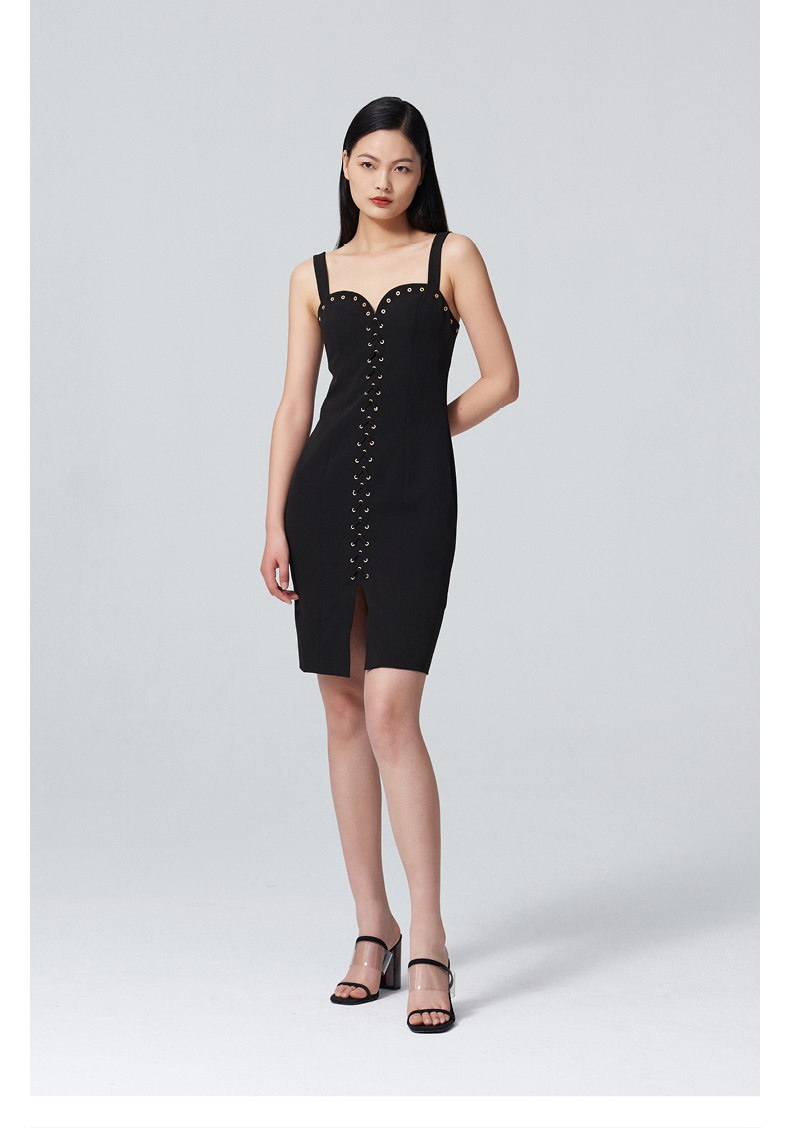 【温蒂公主的侍卫】爱心领气眼绑带设计吊带开叉黑色修身连衣裙/0000698A