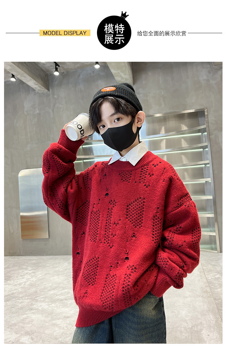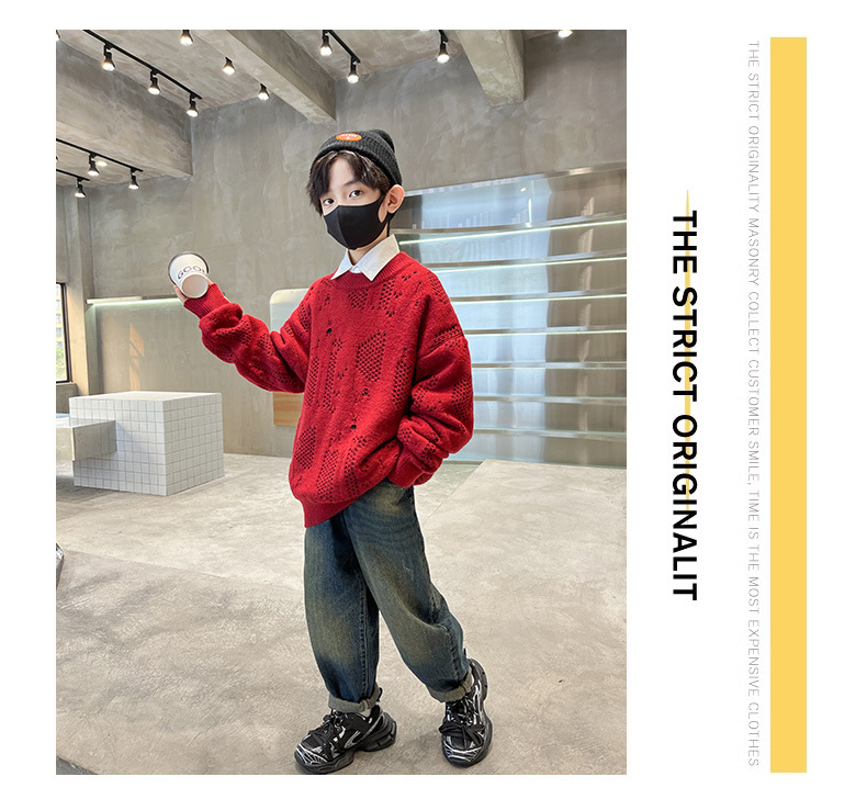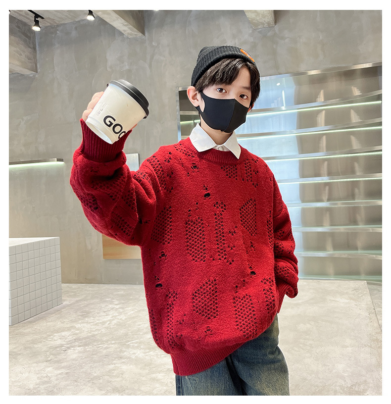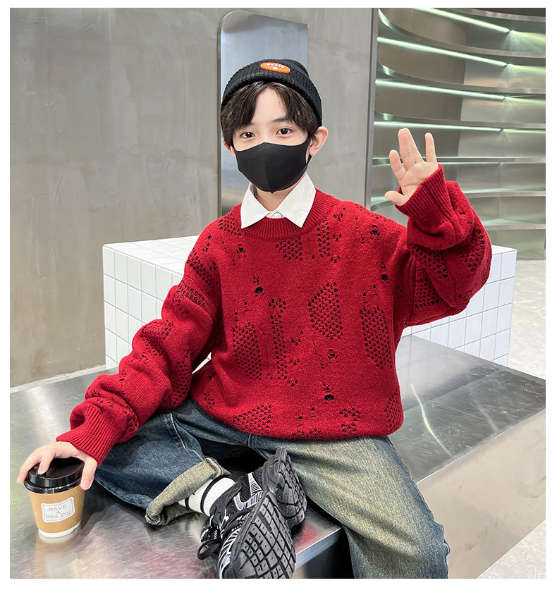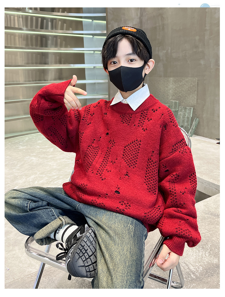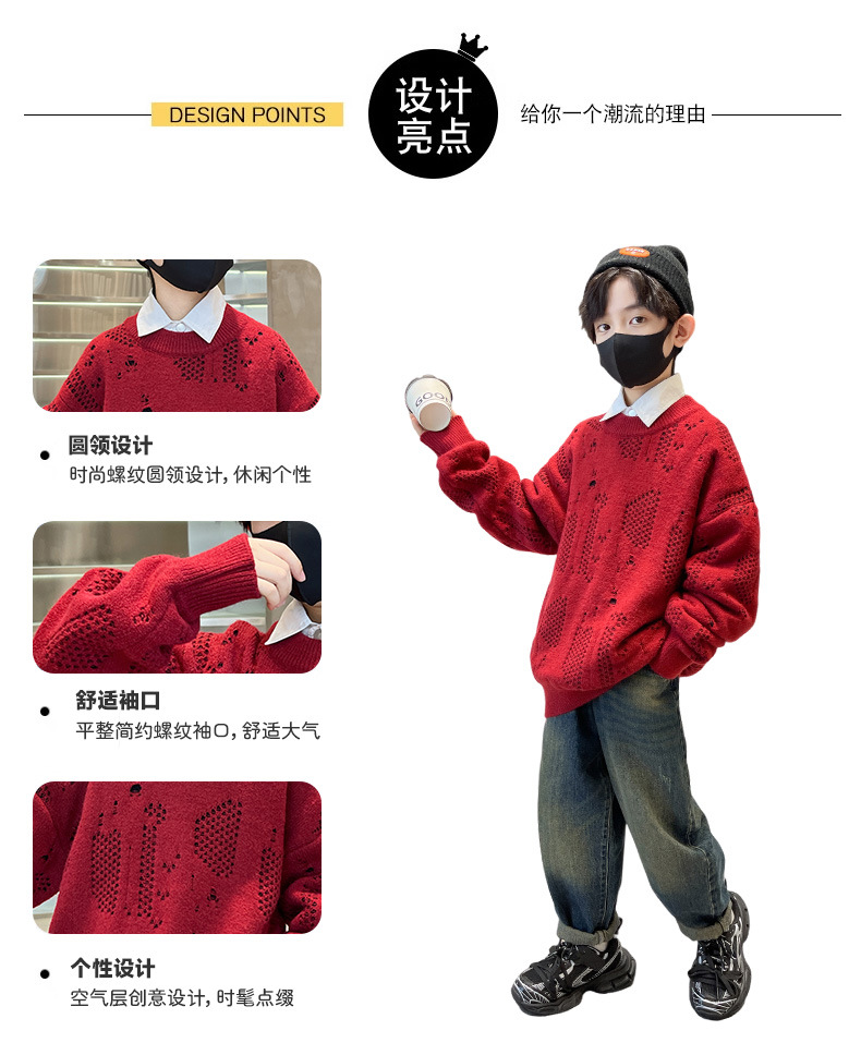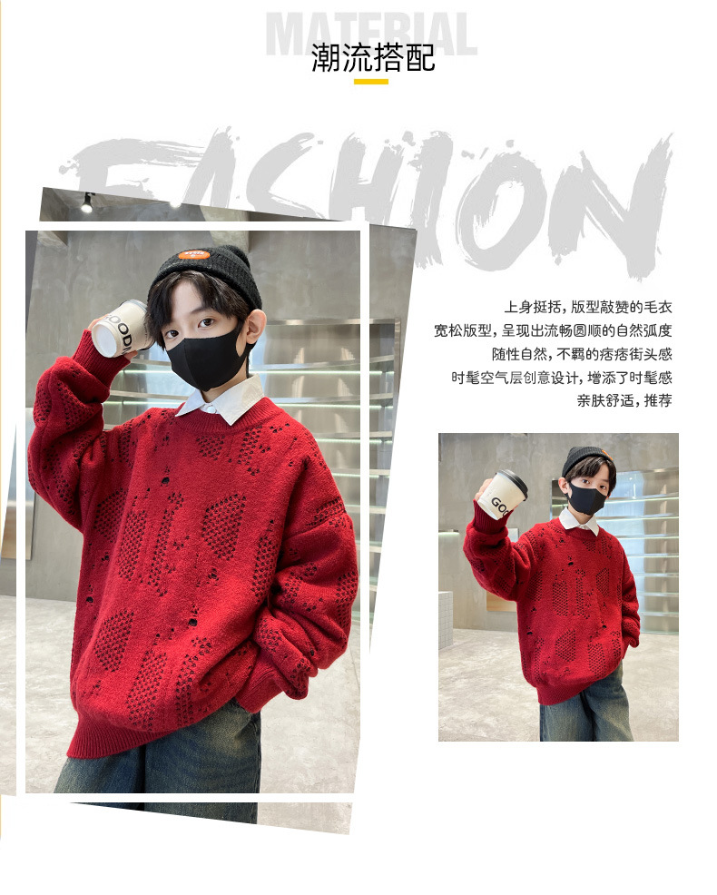 【宽松版型,随性自然!】男童加厚毛衣2023新款,秋冬款中大童儿童男孩冬季红色打底衫冬装潮,展现了现代儿童时尚潮流的风采,无论是日常穿搭还是参加各种场合!