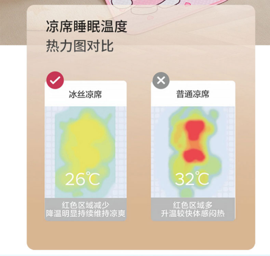 有些凉席刚睡下的时候是凉的,但不透气,睡醒了照样憋一身汗,而小冰熊是凉感丝的面料。 一触即凉不是说说而已,它的凉感丝都是经过检测认证的!通过高科技技术在面料中植入超强冷感分子,3秒超速凉感,能迅速散发体热。