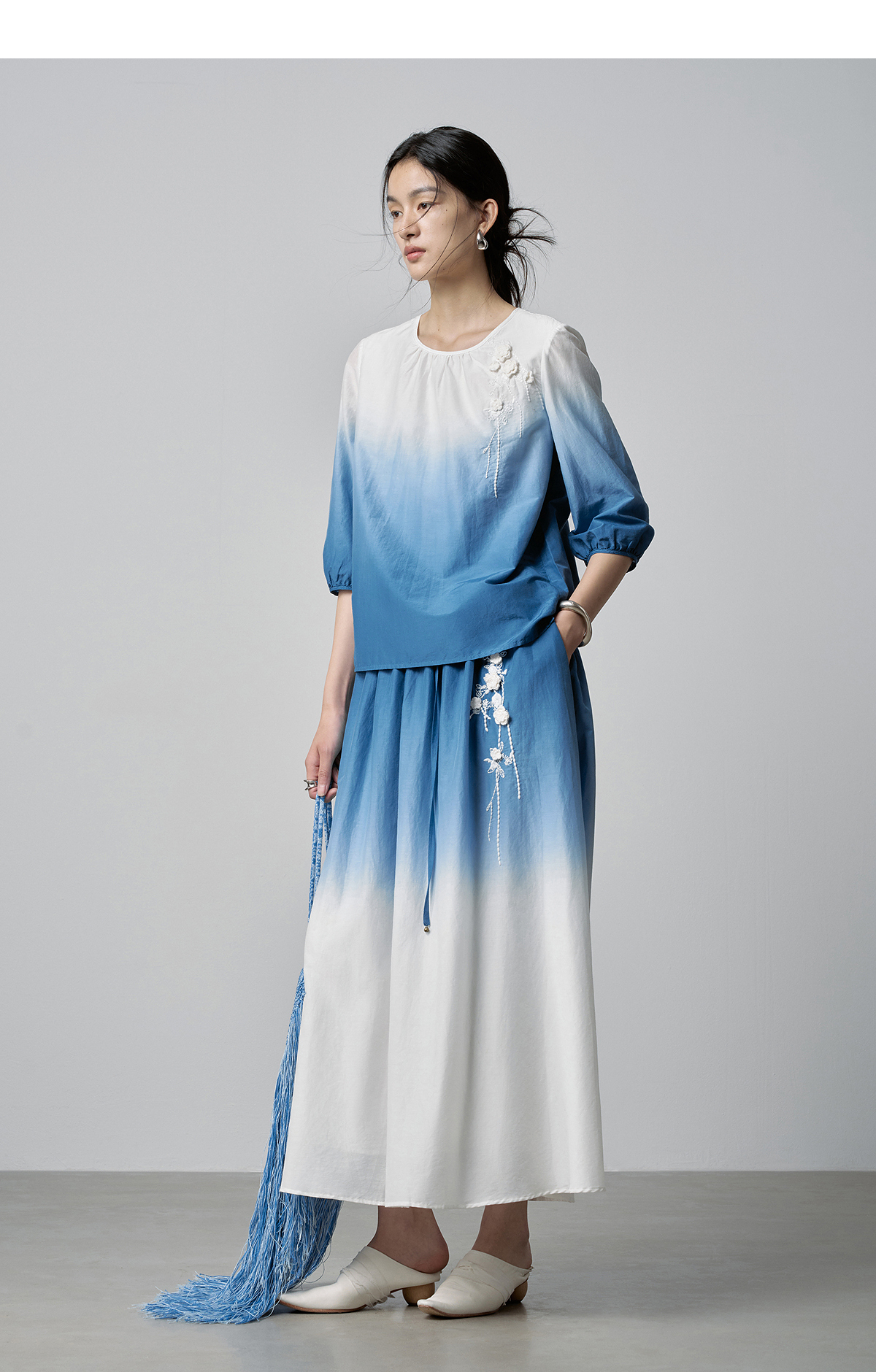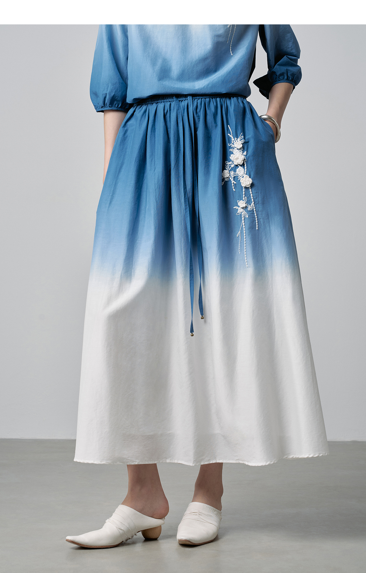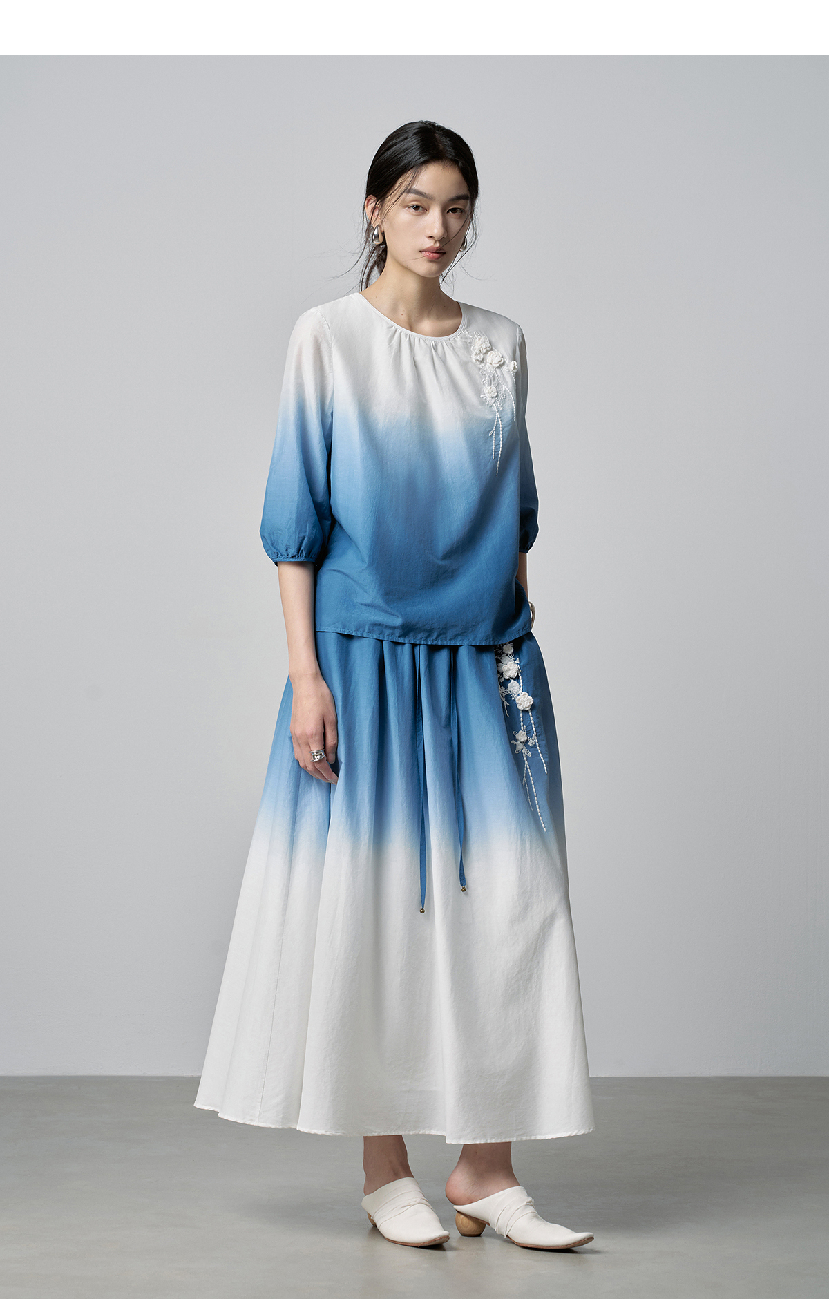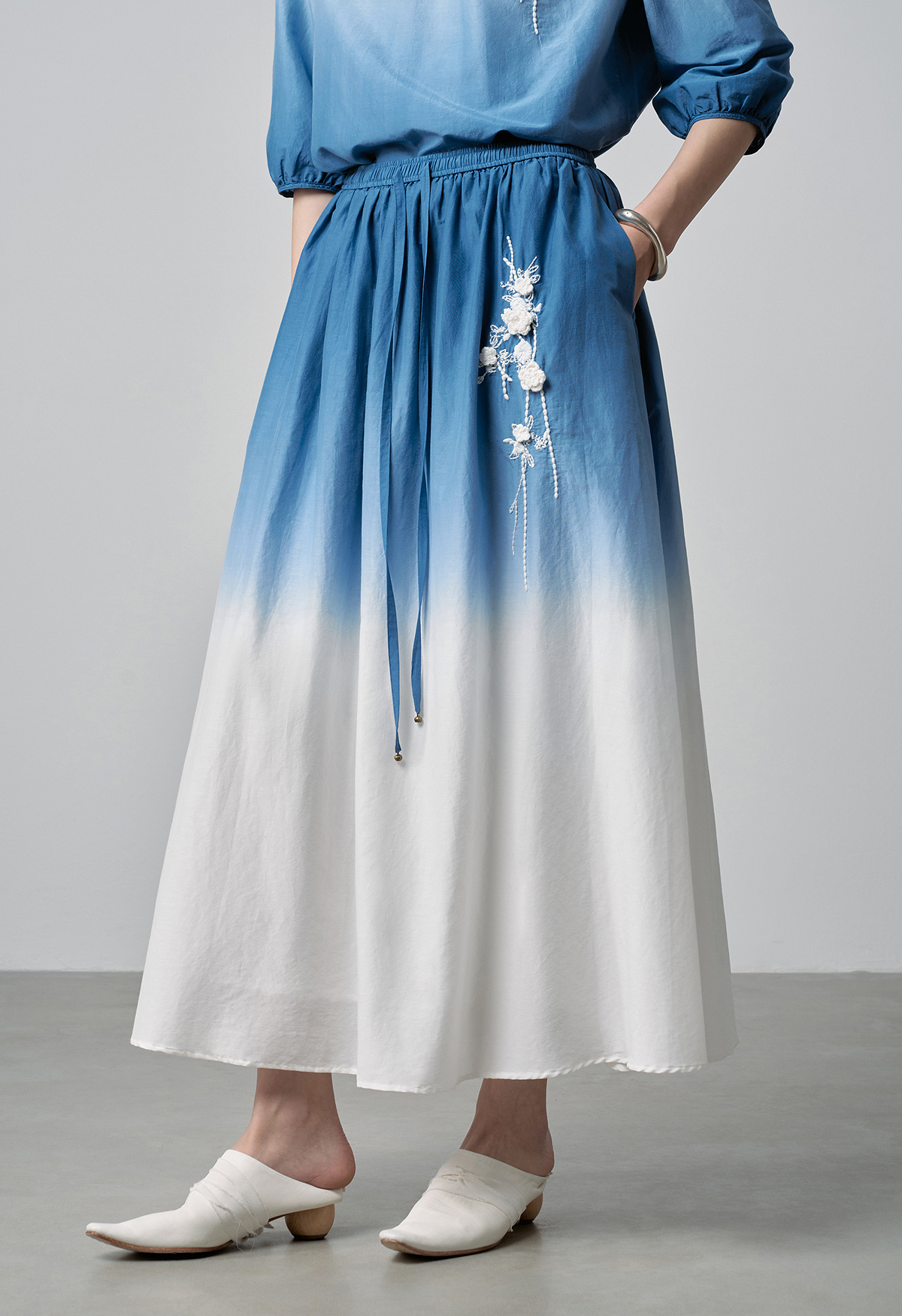 【林栖设计小店】手工钩花|丝棉蓝白渐变优雅百搭2026春新款绣花半身裙T1961278