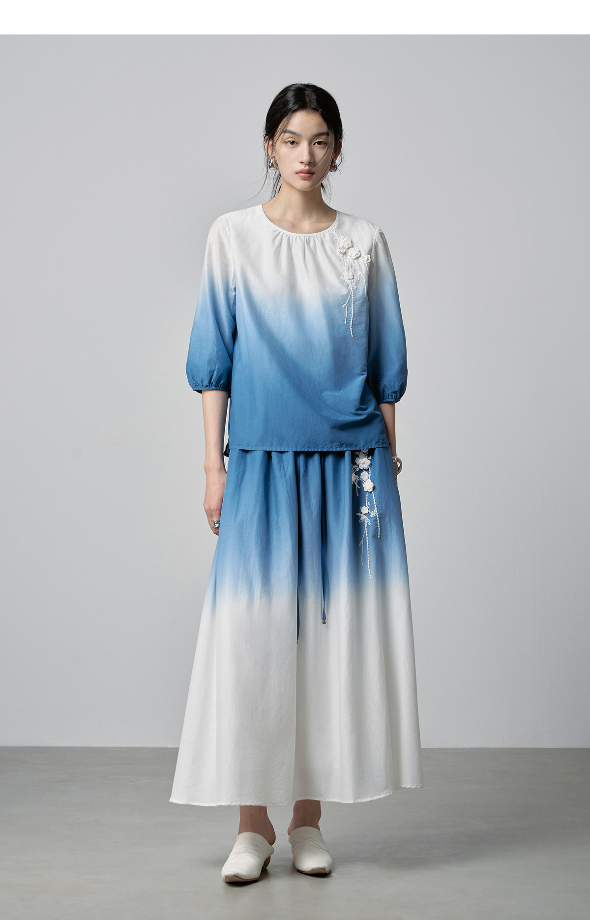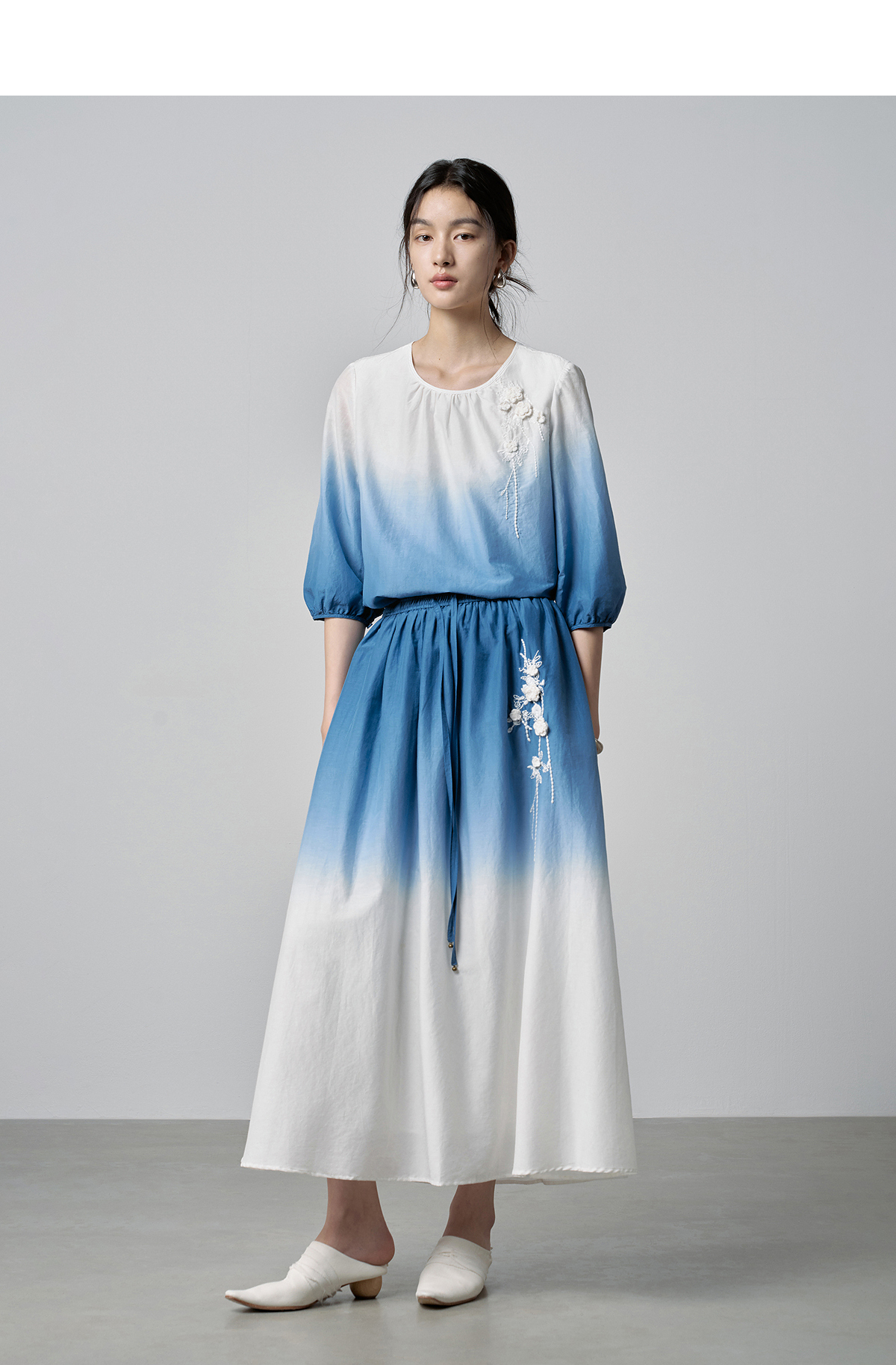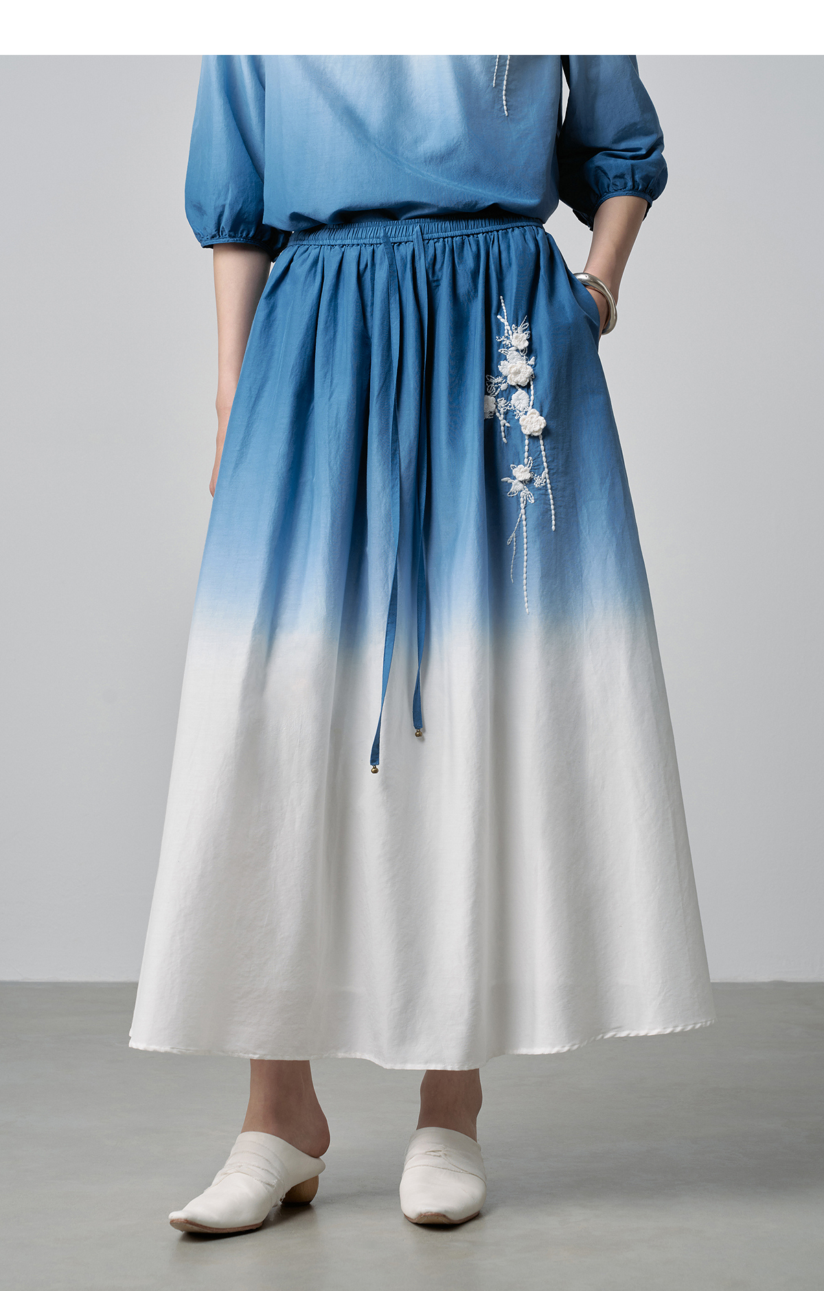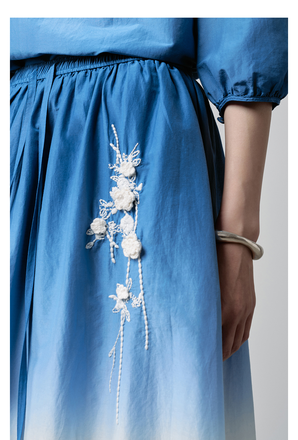 【林栖设计小店】手工钩花|丝棉蓝白渐变优雅百搭2026春新款绣花半身裙T1961278