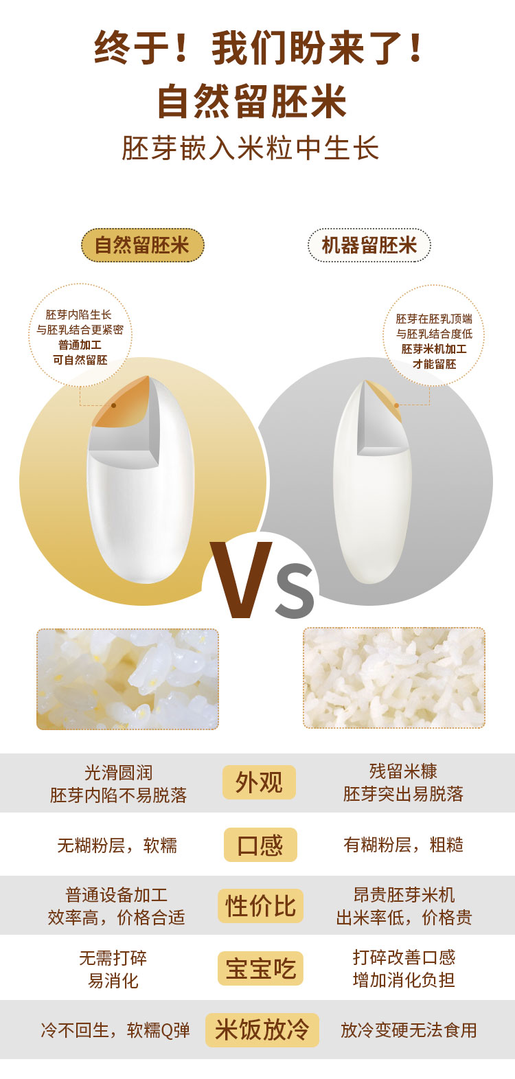 2、自然留胚米解决了大米通过加工才能留胚的技术难点,自然留胚米的胚芽往里面长,不需要深加工就能留住胚芽。市面上的胚芽米都是往外长,通过机器才能磨出来。