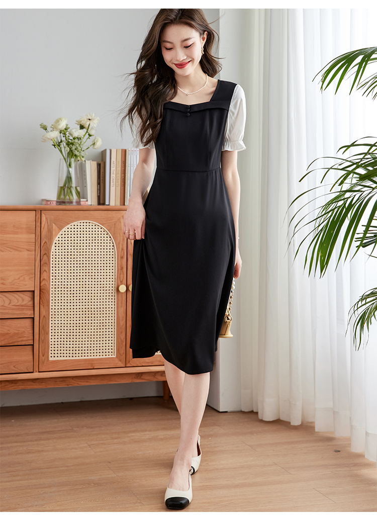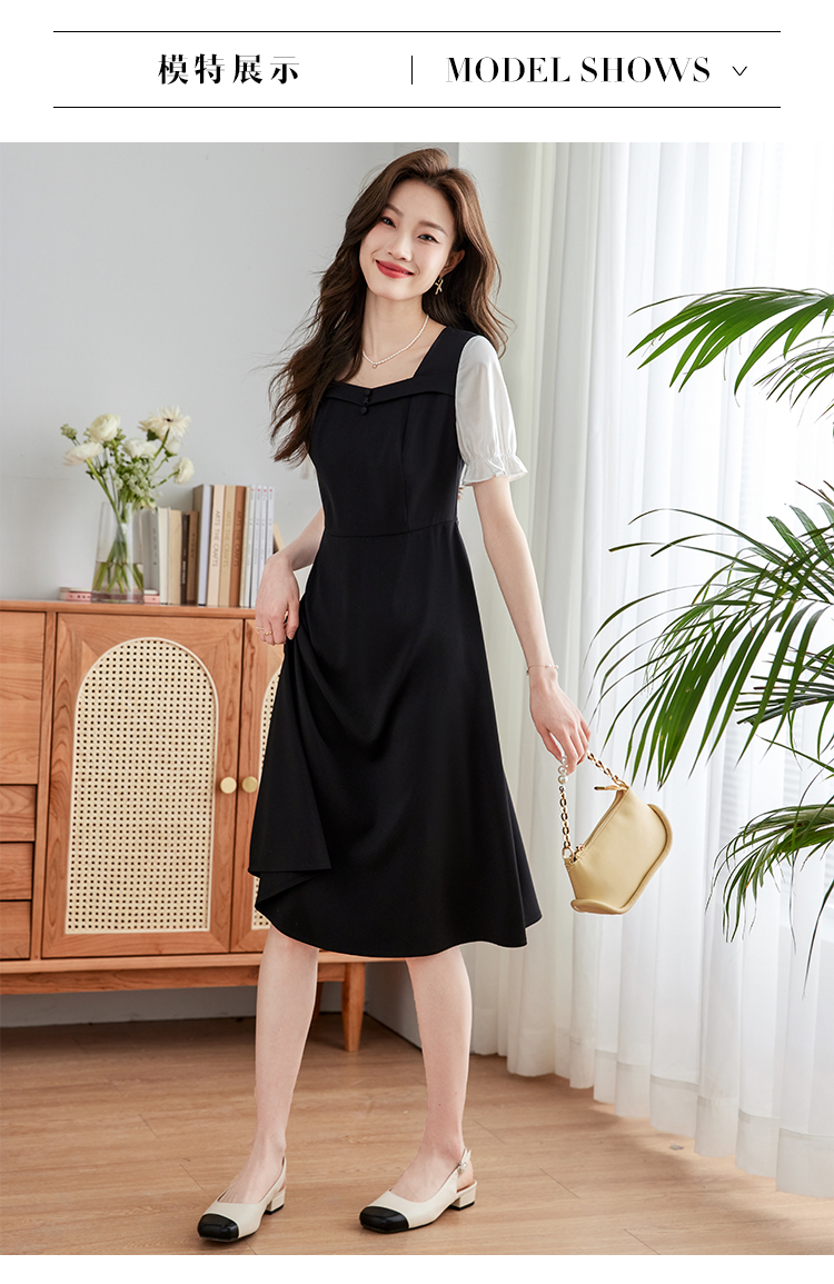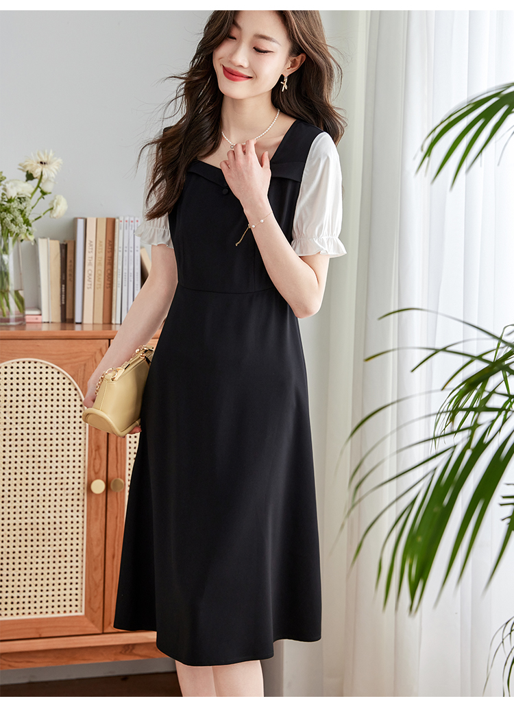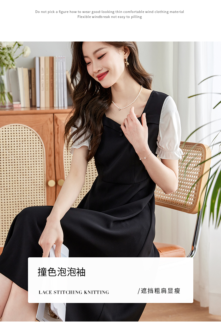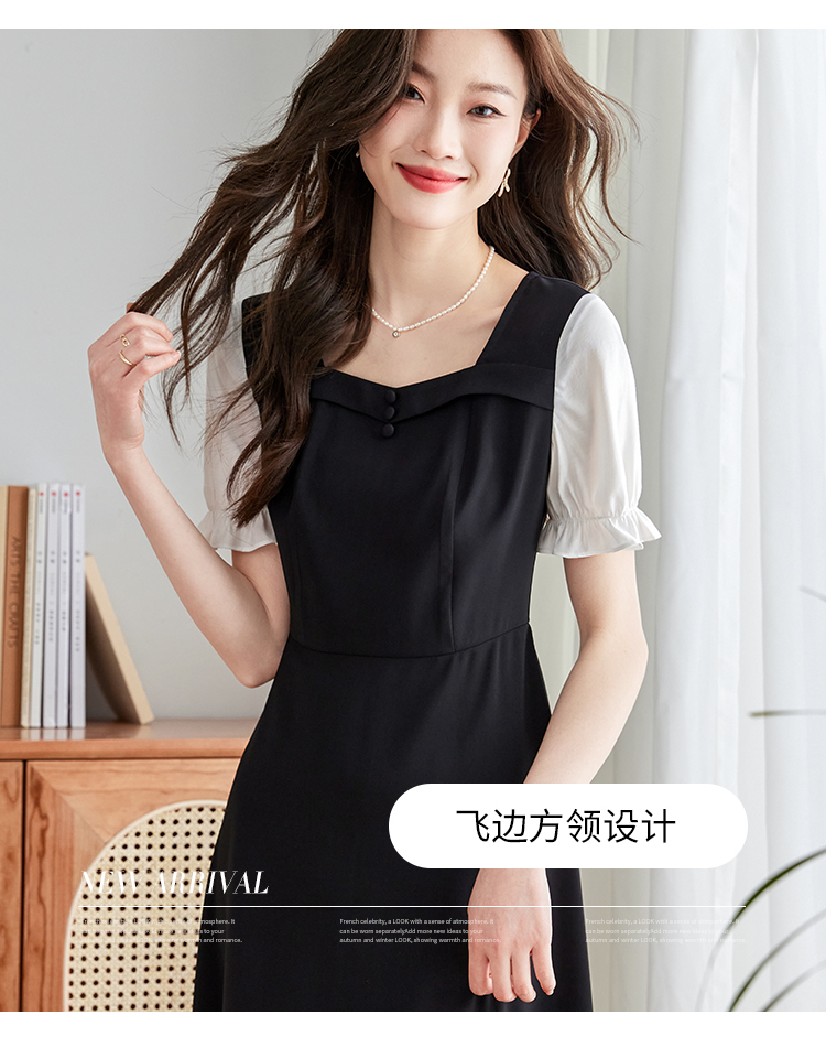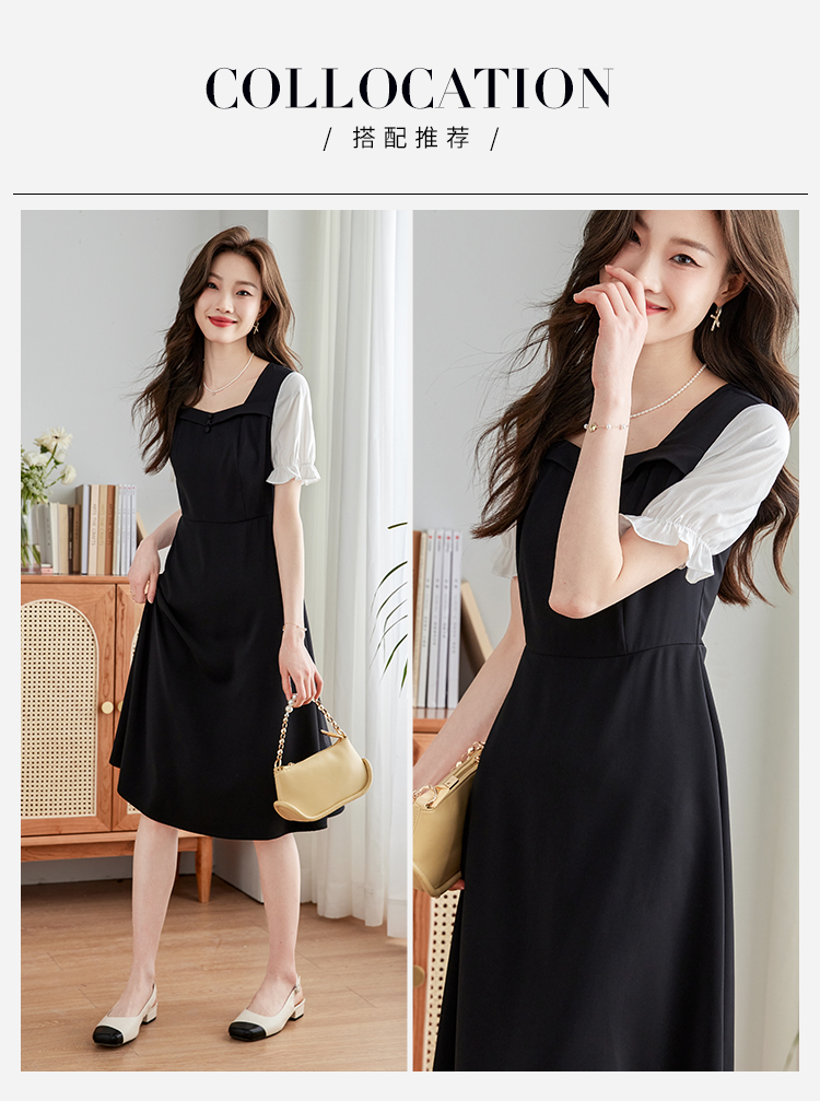 【专属特价】熙世界气质赫本风连衣裙女2025夏季新款撞色泡泡袖拼接方领小黑裙