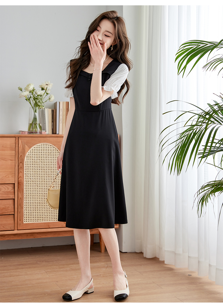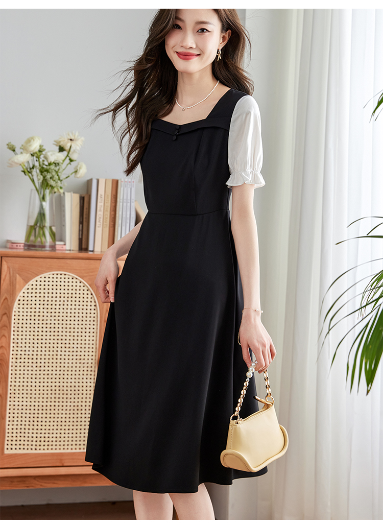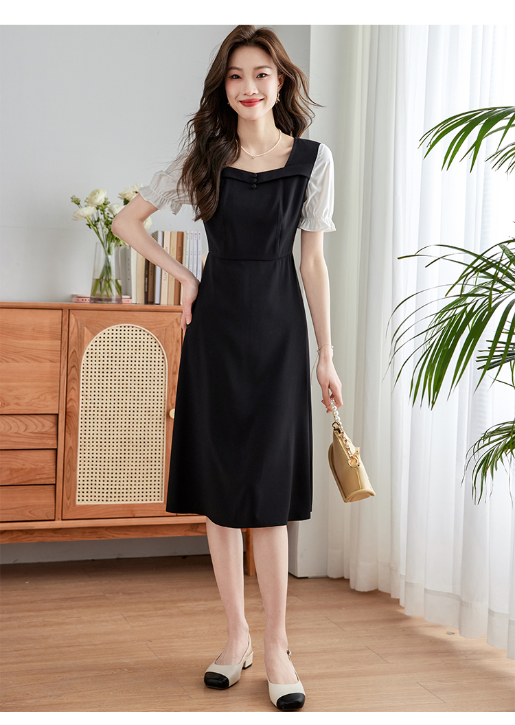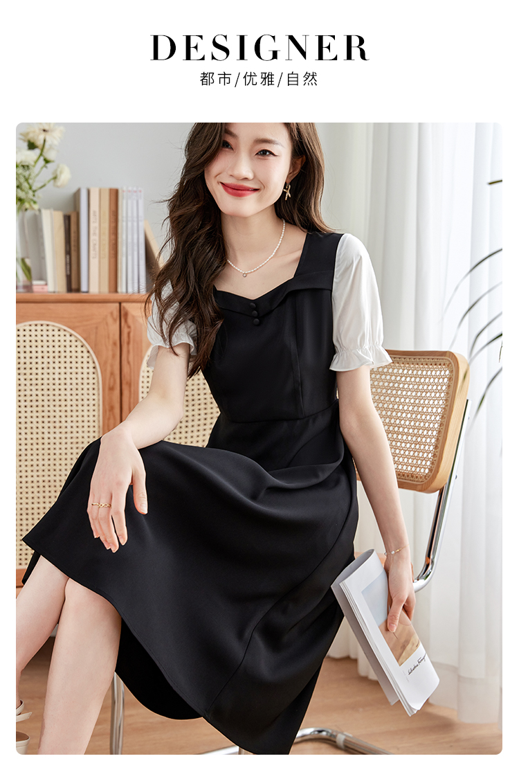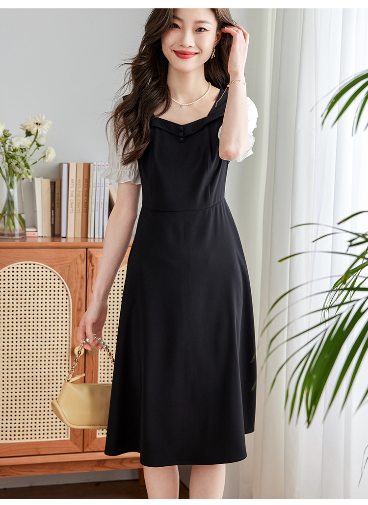 【专属特价】熙世界气质赫本风连衣裙女2025夏季新款撞色泡泡袖拼接方领小黑裙