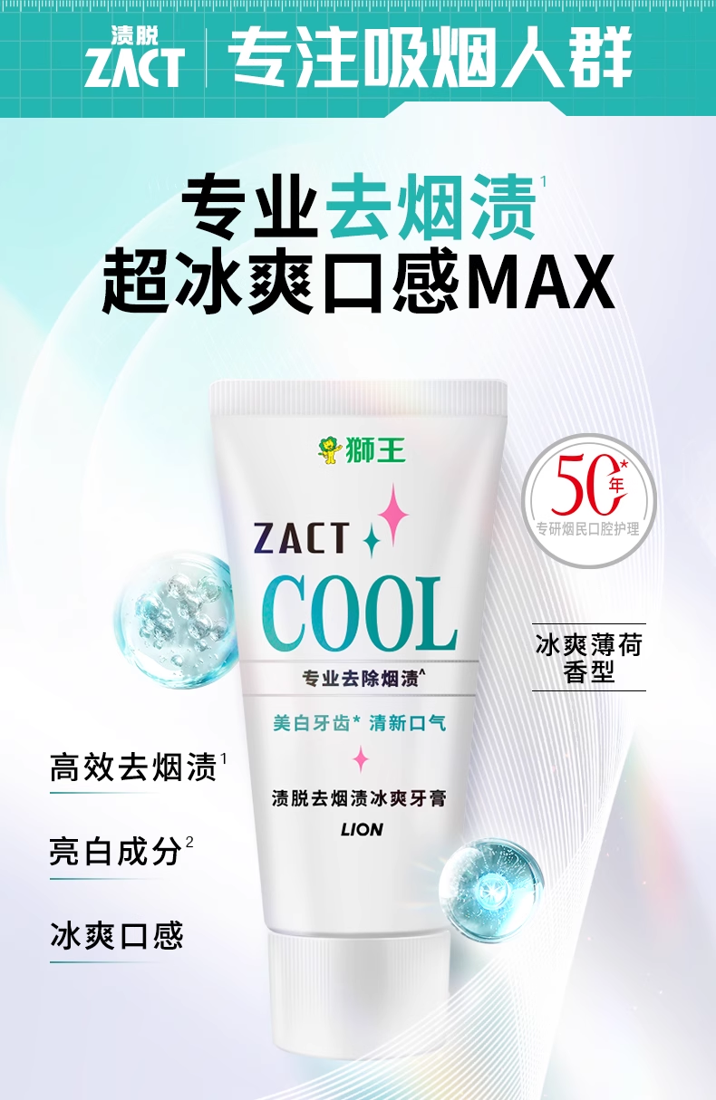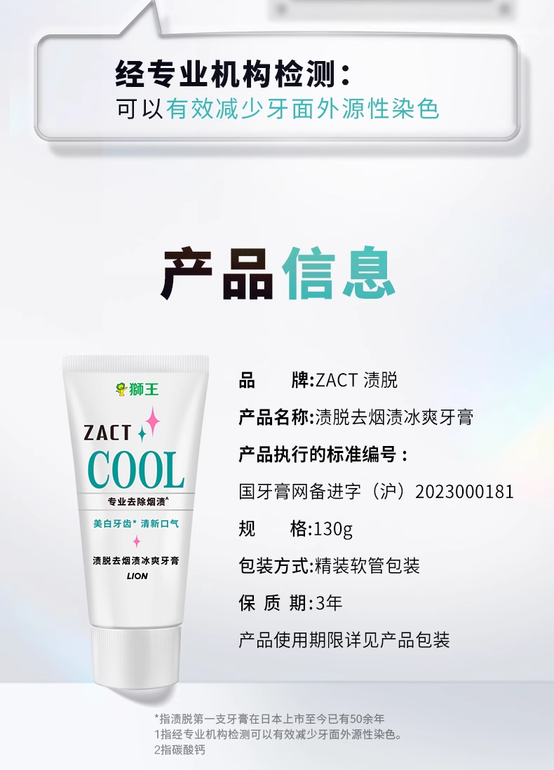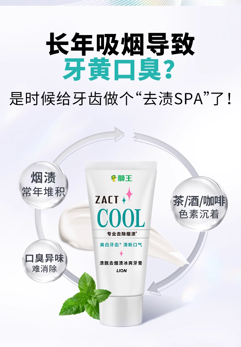 LION狮王ZACT去烟渍冰爽牙膏130g去渍去黄亮白清新
