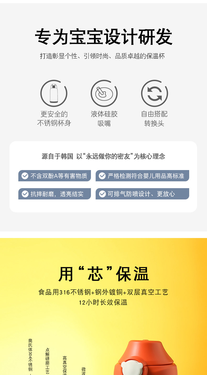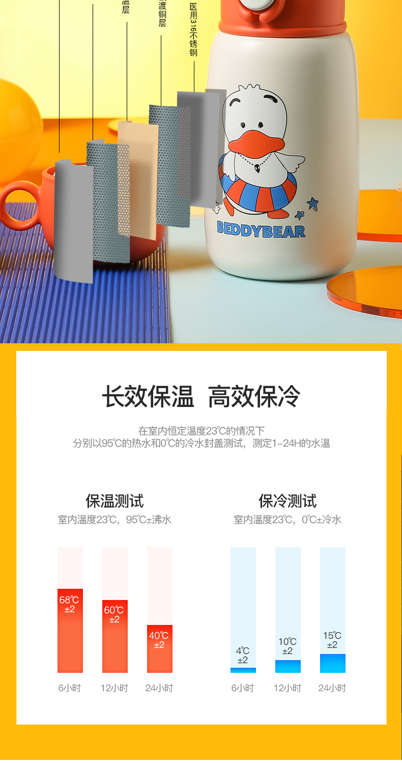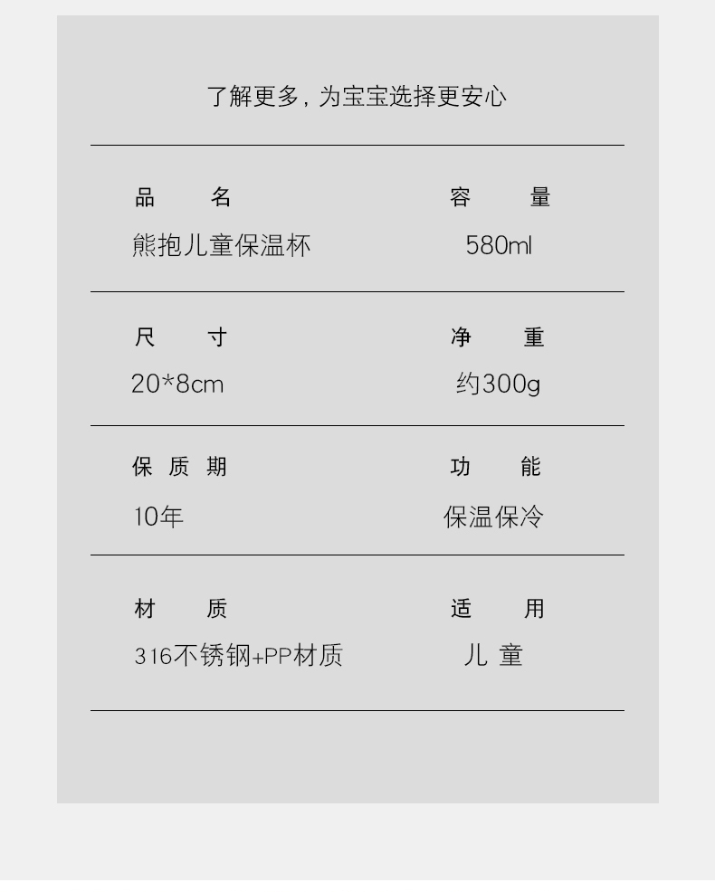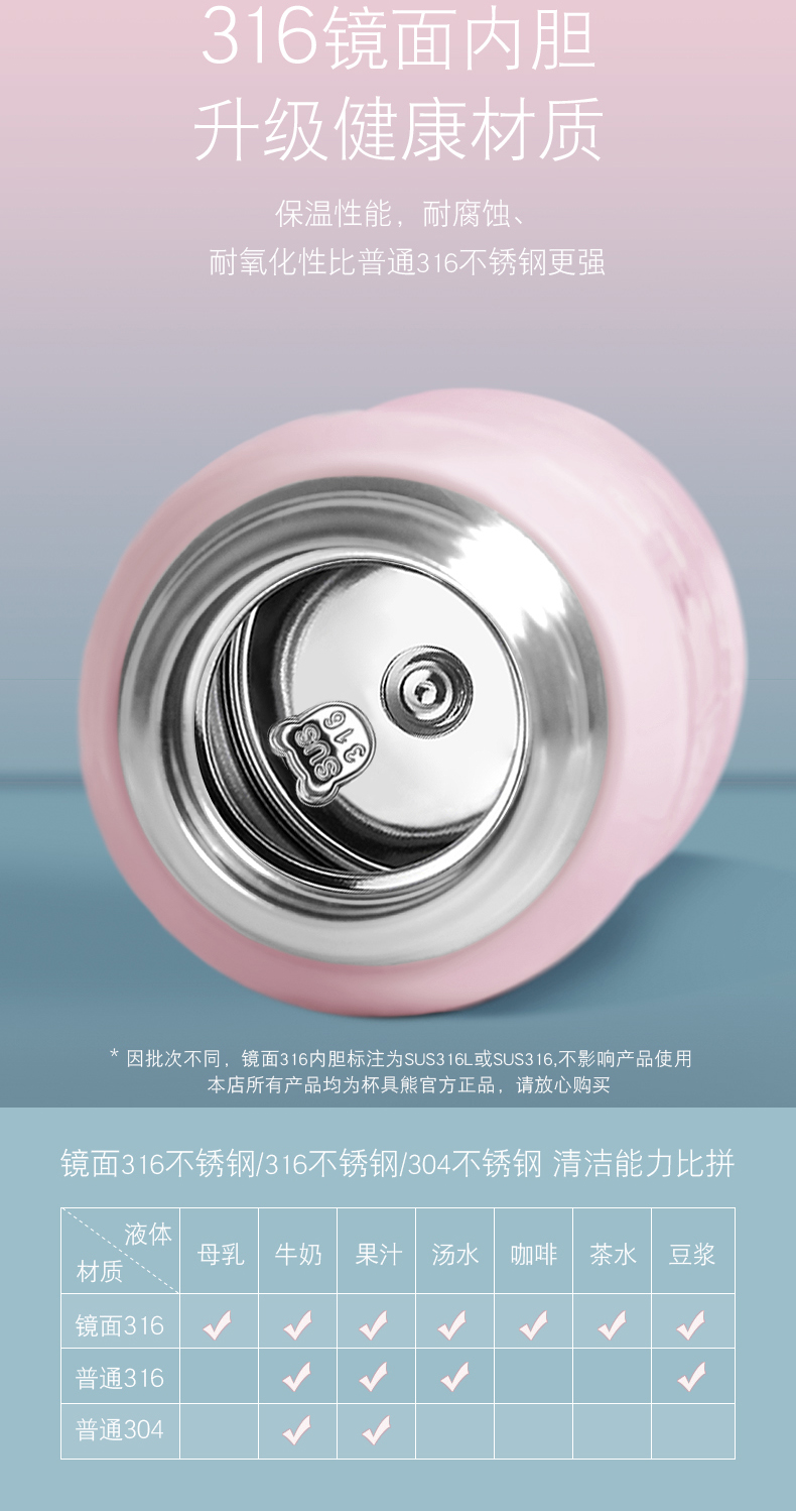 杯具熊熊抱儿童保温壶杯身材质:奥氏体型不锈钢06Cr19Ni10(304) 内胆材质:奥氏体型不锈钢022Cr17Ni12Mo2(316)