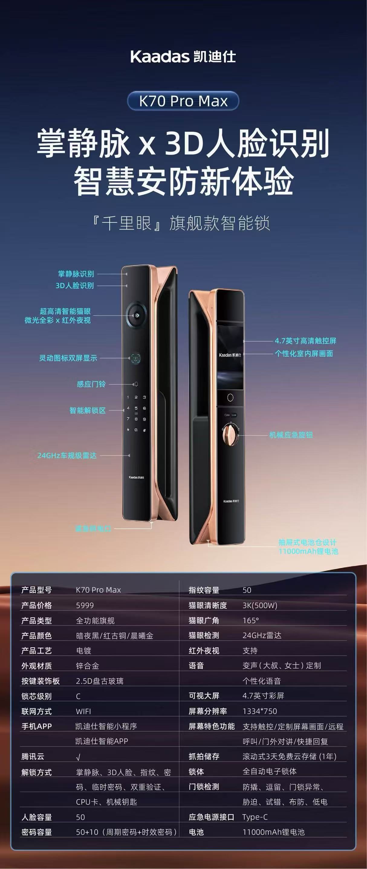 【四川】凯迪仕(KAADAS)传奇大师K70 Pro Max掌静脉指纹锁智能门锁大屏入户防盗门电子锁 掌静脉3D人脸-K70 Pro Max暗夜黑