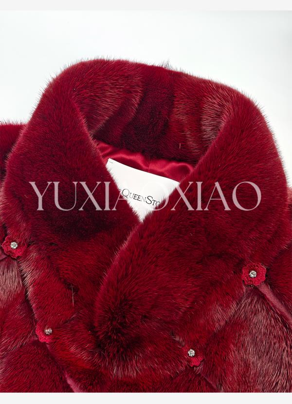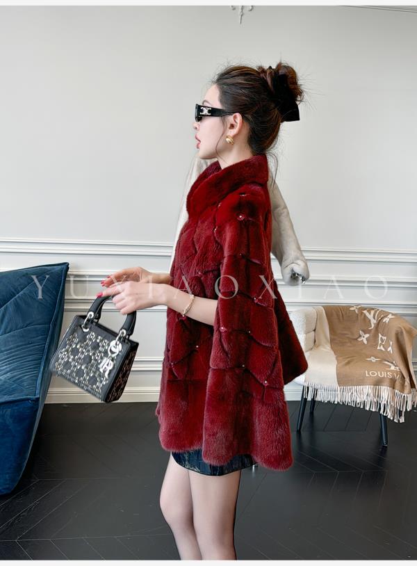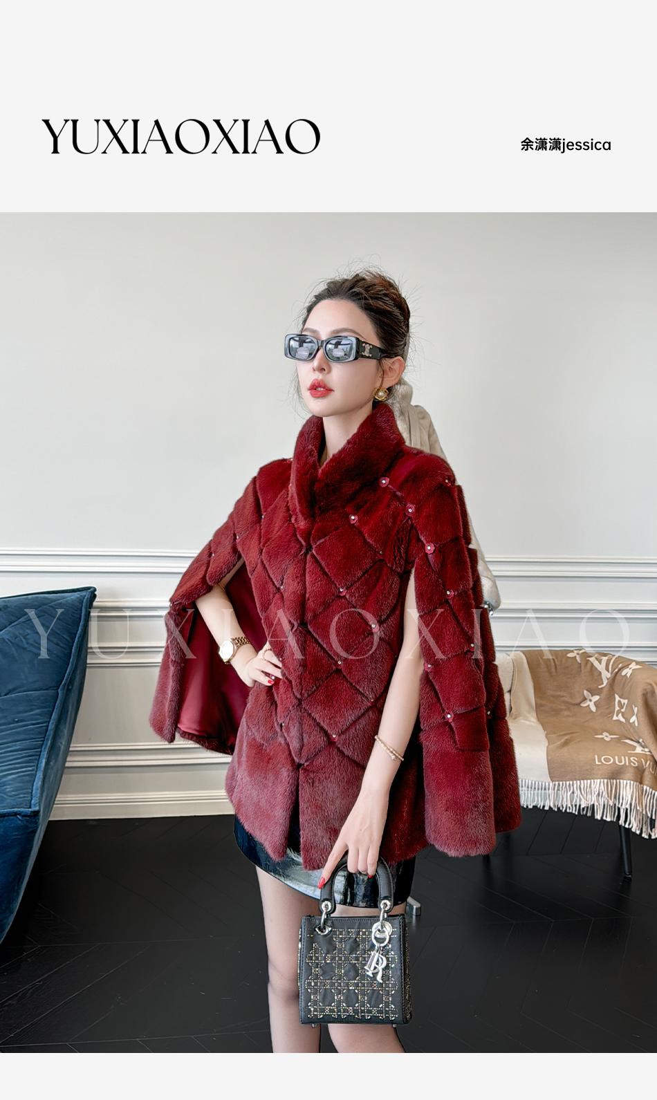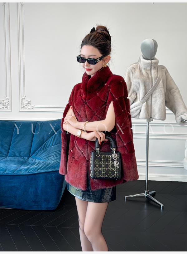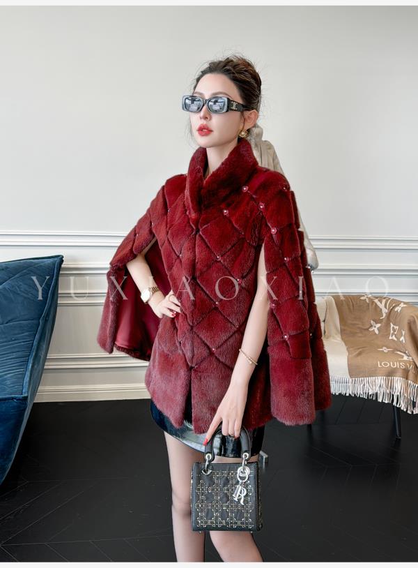 余潇潇【勃艮第贵妇】丹麦水貂定染菱形格纹斗篷廓形立领钩扣皮草