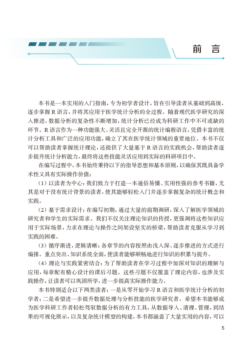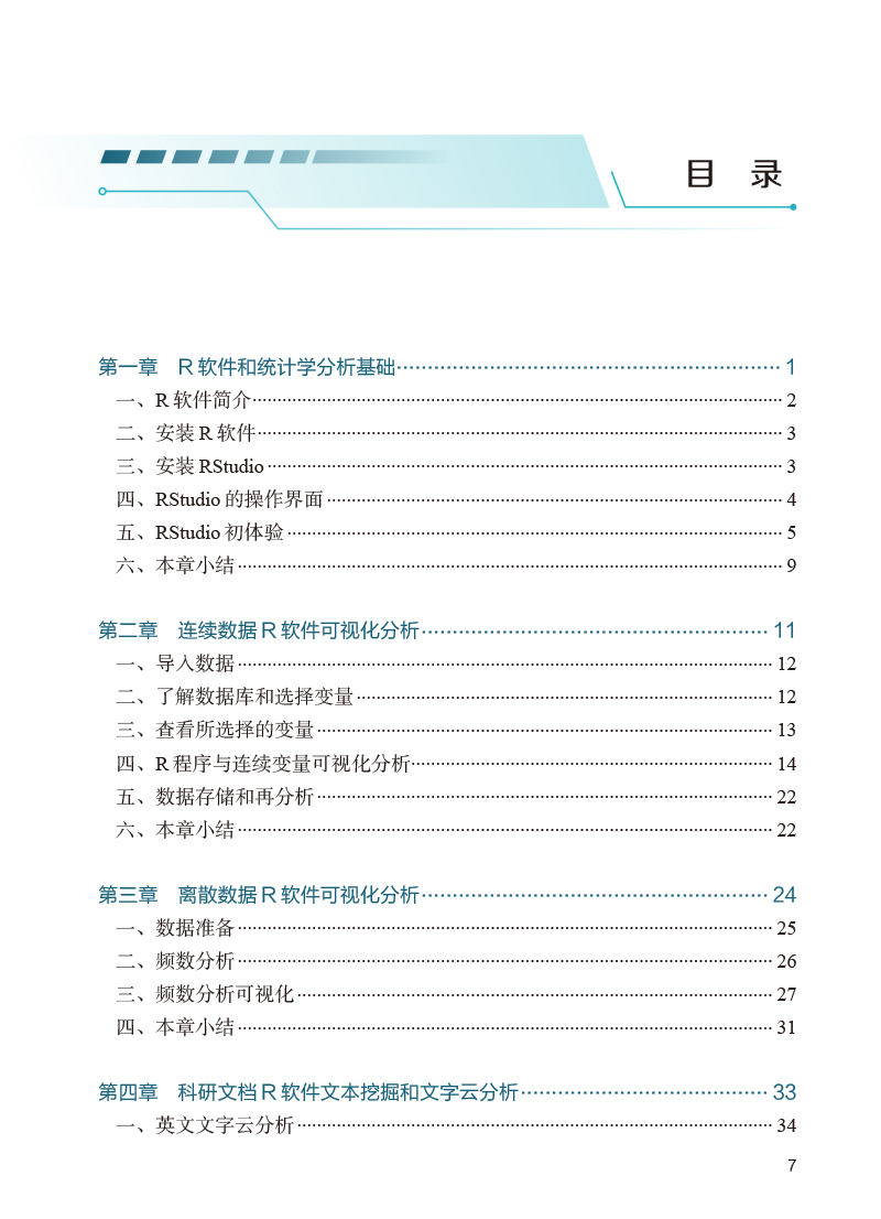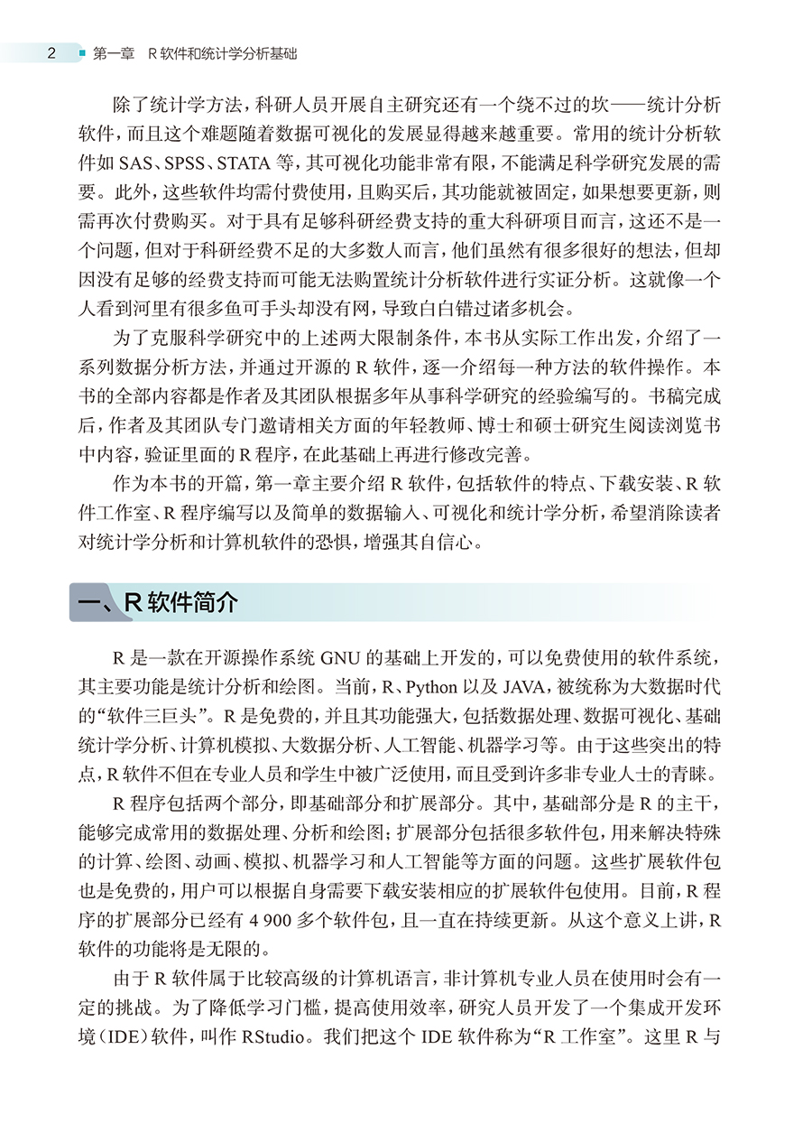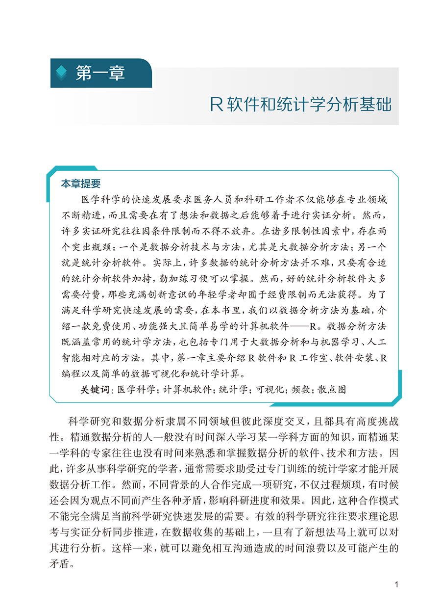 本书共15个章,对14个公共卫生领域最常使用的数据视像化方法与统计方法展开介绍。我们首先对R语言做了详细介绍,从背景、软件下载安装方法到工作界面及相应功能的讲解等,让读者在使用R语言之前先对其产生感性的认识。而后分别就连续变量、离散变量以及文字的视像化方法展开介绍,读者通过数据的视像化,能够更直观地认识数据、了解数据的基本情况。接着介绍卡方检验、t检验及F分析、相关分析以及多种回归分析方法,并拓展介绍了路径分析、中介效应以及Meta分析方法。文中使用公共卫生领域大数据案例,以解决问题为导向讲解统计方法及R语言实现;突出大数据应用特色,兼顾统计方法的经典性和普适性、理论讲解的通俗性和严谨性、R语言代码的实操性和示范性,能帮助读者快速掌握相关统计方法。