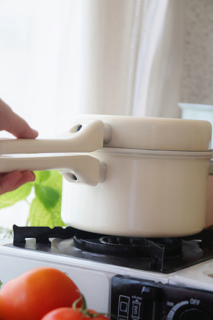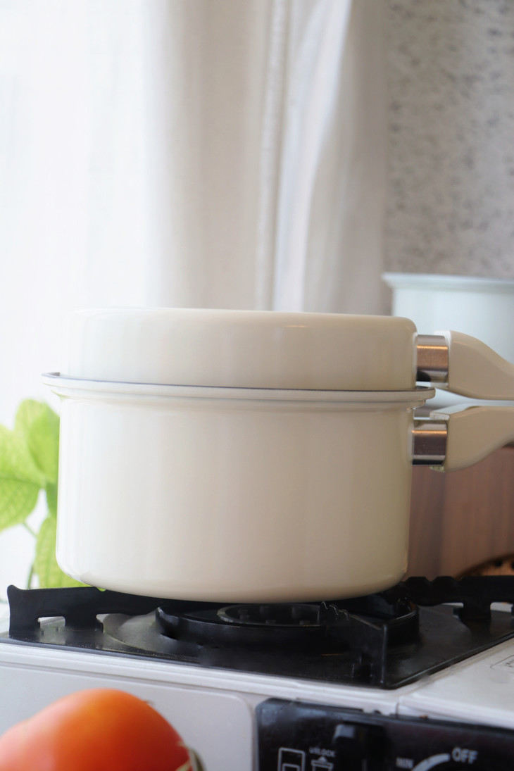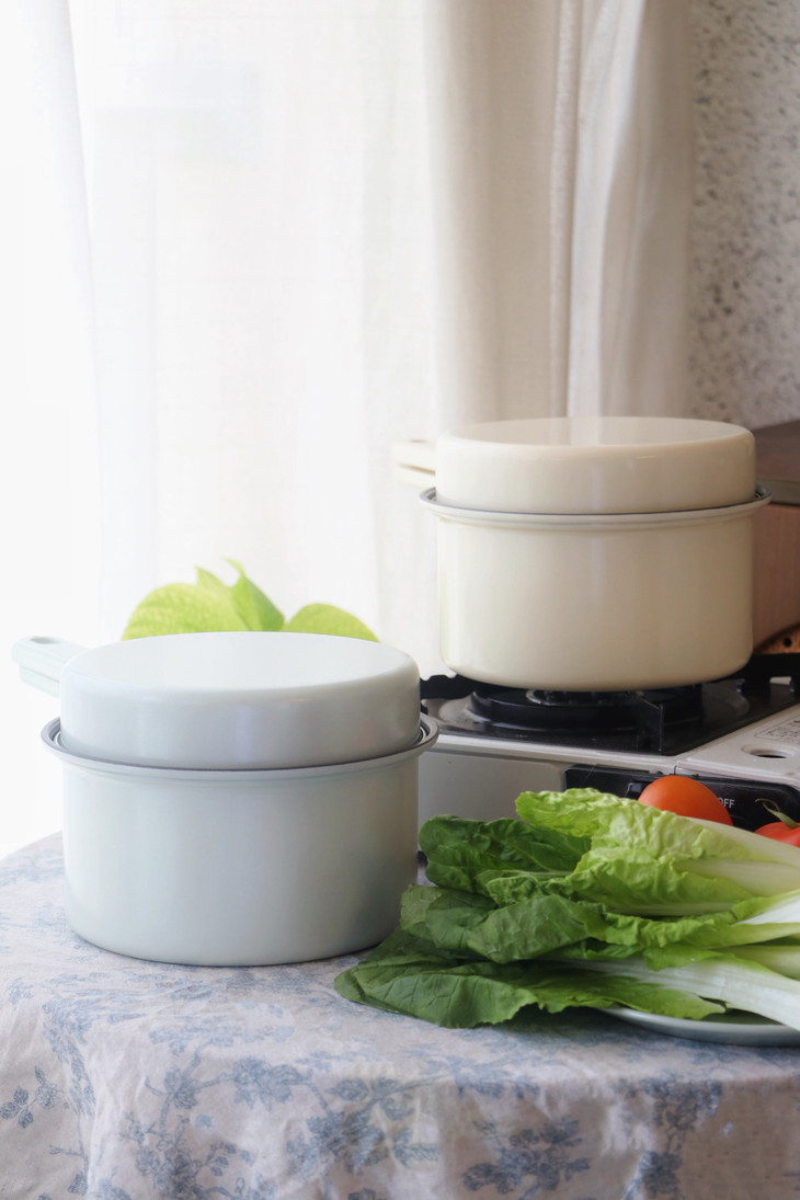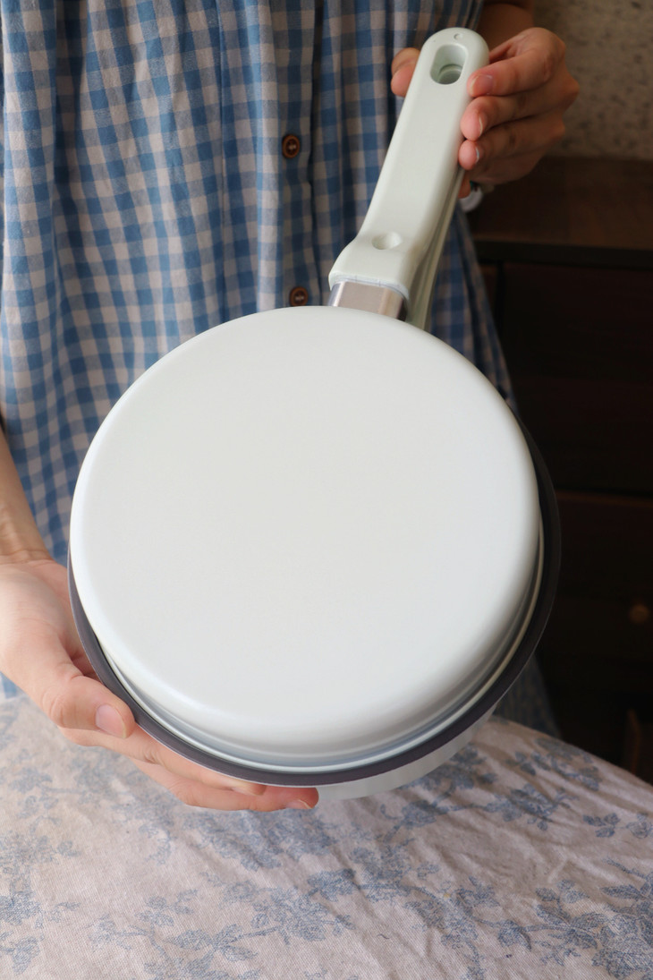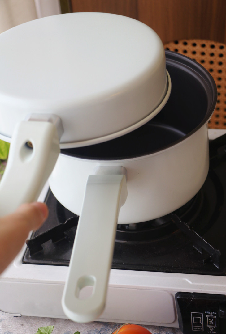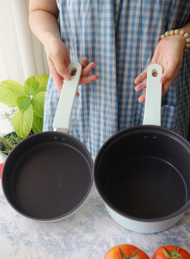 套叠收纳 两锅可以严丝合缝叠成"薄饼" 叠放时可当临时锅盖使用 烹饪时煎锅倒扣在奶锅上焖煮 厨房收纳大师非你莫属!