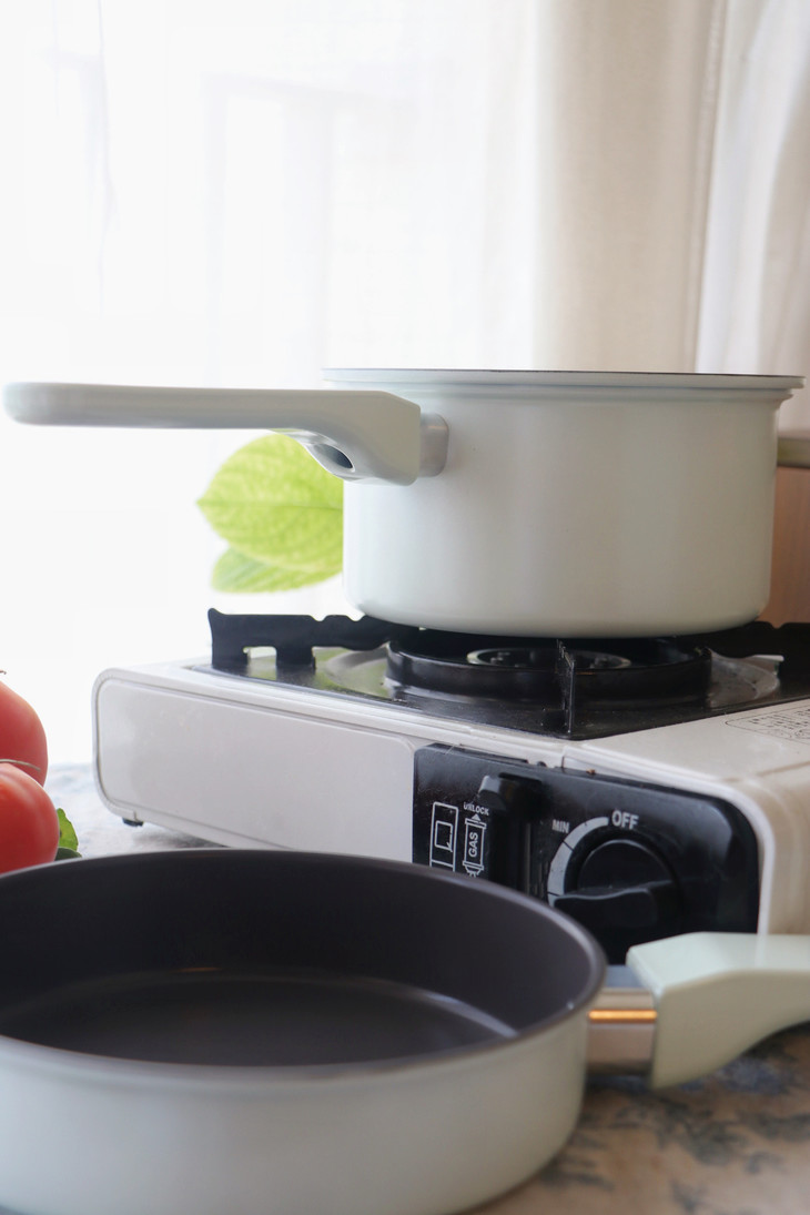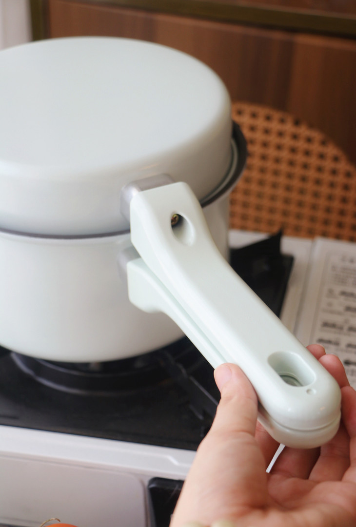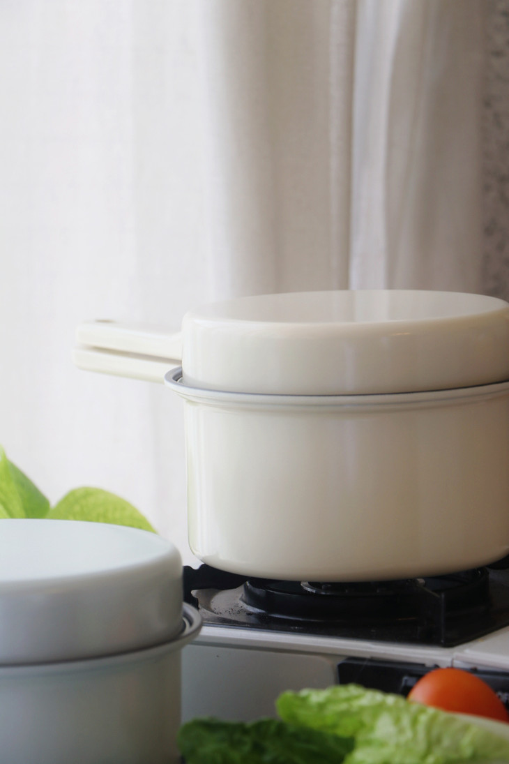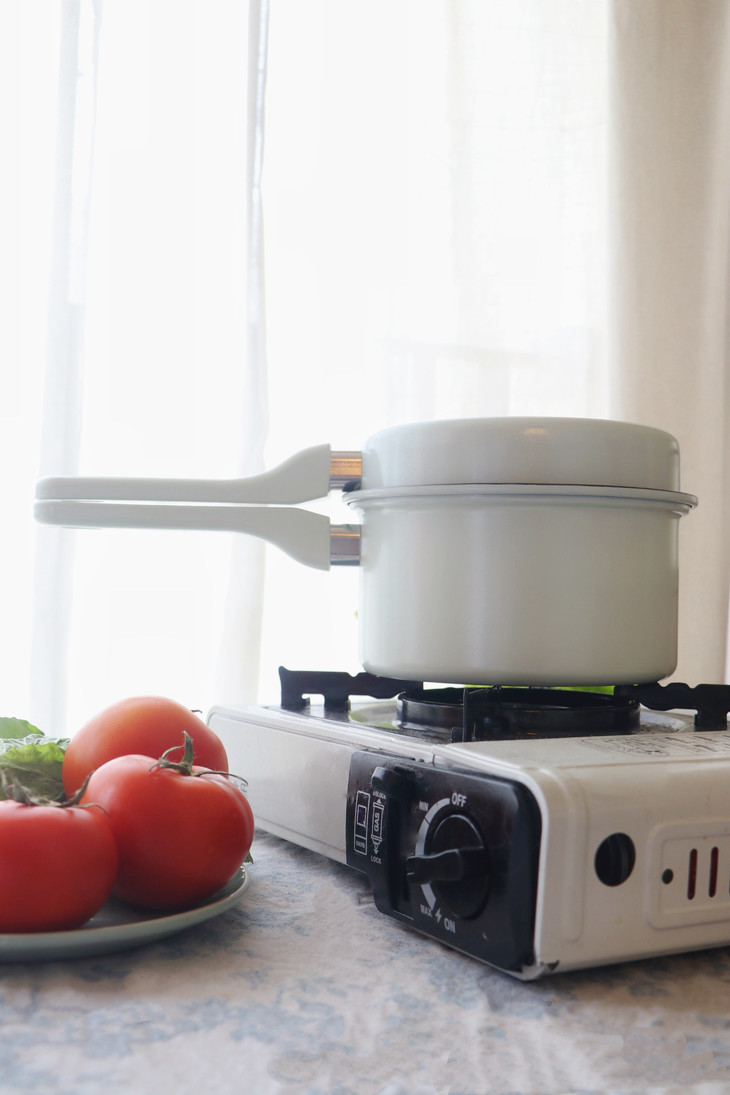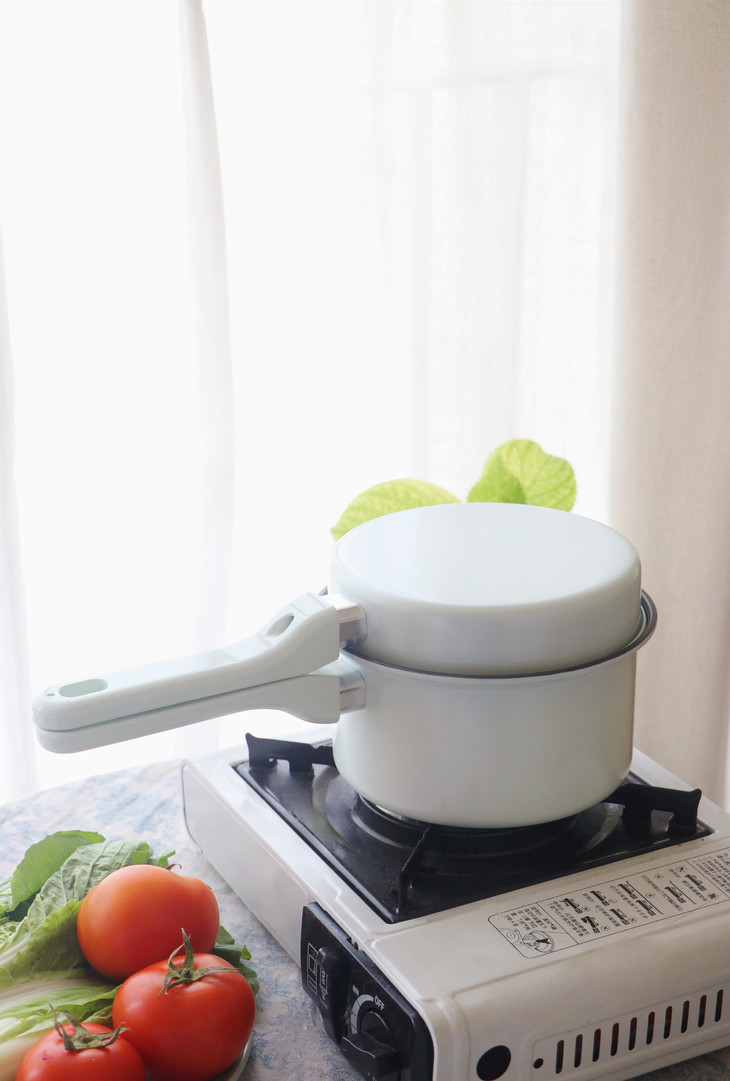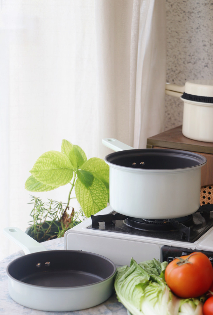 套叠收纳 两锅可以严丝合缝叠成"薄饼" 叠放时可当临时锅盖使用 烹饪时煎锅倒扣在奶锅上焖煮 厨房收纳大师非你莫属!