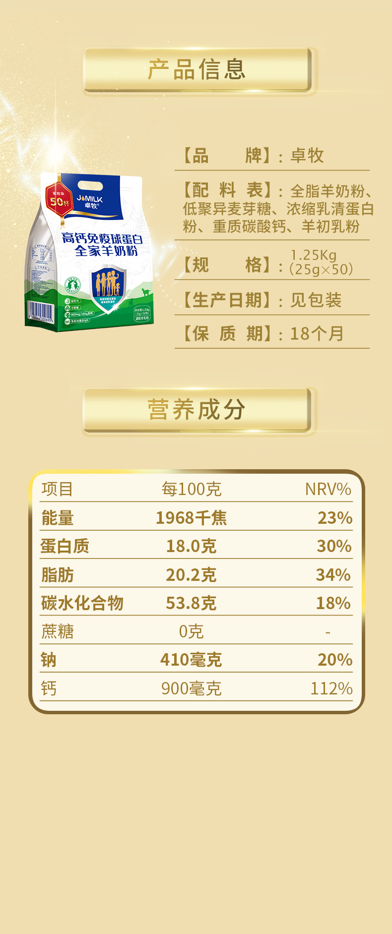 卓牧高钙免疫球蛋白全家羊奶粉 1.25KG 一袋可泡50杯 温和易吸收 营养中国家庭