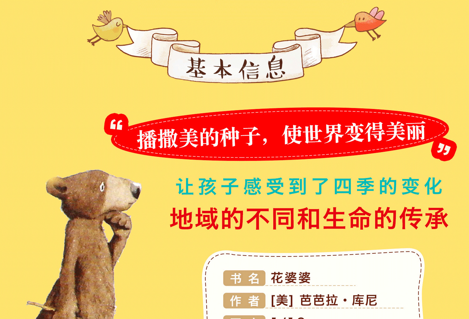 | 适读人群 :3-6岁 图画书也可以描绘一个人波澜万丈的一生吗?芭芭拉.库尼告诉我们:可以。 这本书是美国著名女作家芭芭拉·库尼以自己的生活经验为题材,自己写故事、自己画插图创作出的一本自传式图画书。她曾经说过《花婆婆》也许是极贴近她心的作品,也是她超喜欢的代表作之一。因从书的封面到内页的文图设计,都可谓匠心独运,美不胜收。 |
