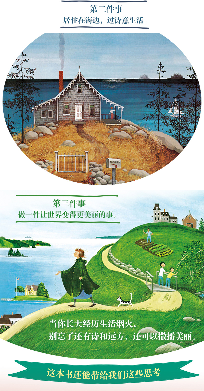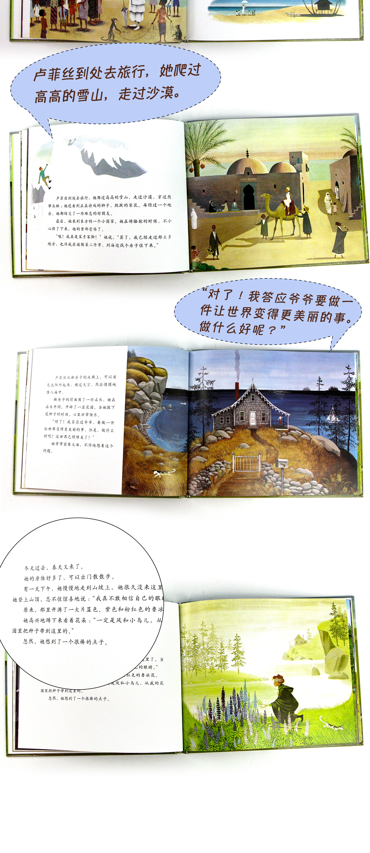 | 《花婆婆》直译应该是《鲁菲丝小姐》,讲述了一个倒叙的故事——当鲁菲丝小姐成了一位风烛残年的老婆婆时,她告诉年轻的叙述者,许多年以前,当她还是一个名叫艾丽丝的小女孩的时候,她曾经答应过爷爷三件事:第一件事是去很远的地方旅行,第二件事是住在海边,第三件事是做一件让世界变得更美丽的事。前两件事不难,难的是第三件事。直到有一年的春天,她喜出望外地发现山坡上开满了一大片蓝色、紫色和粉红色的鲁冰花时,她知道什么是她要做的第三件事了。整个夏天,她的口袋里都装满了花种子,她把它们撒在了乡间的小路边、教堂后面…… |
