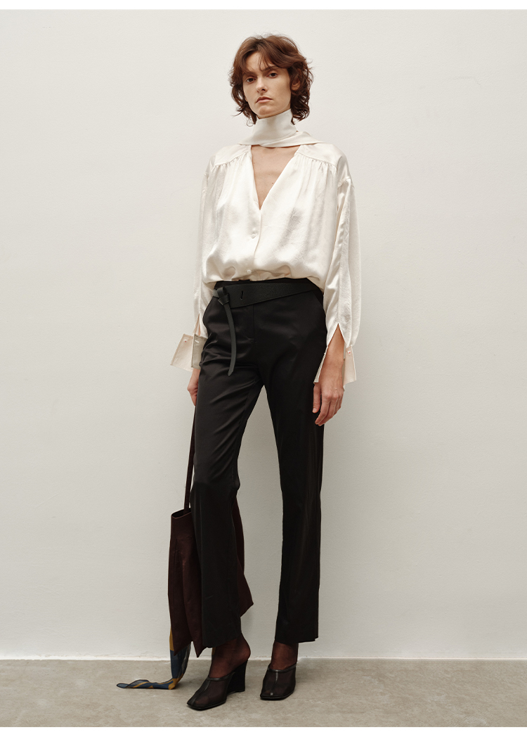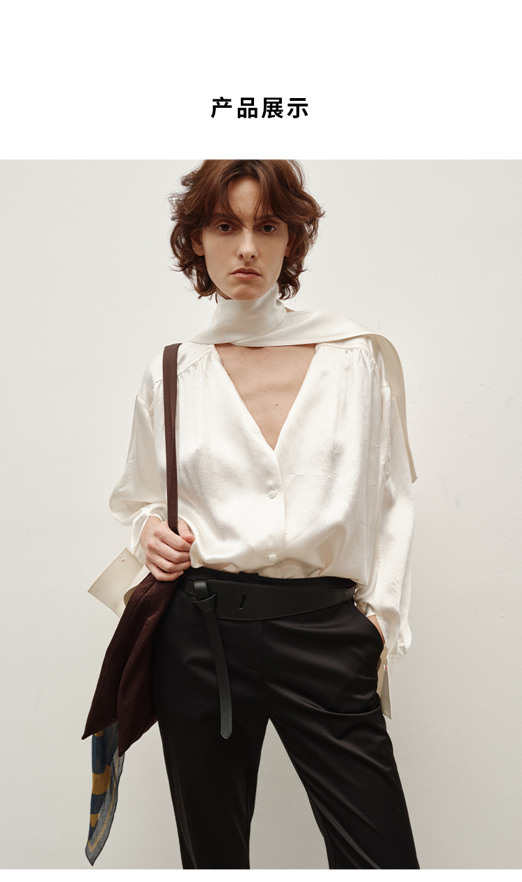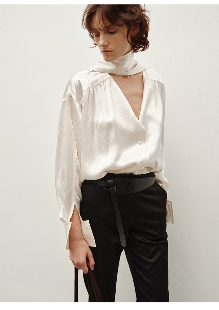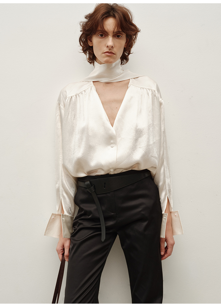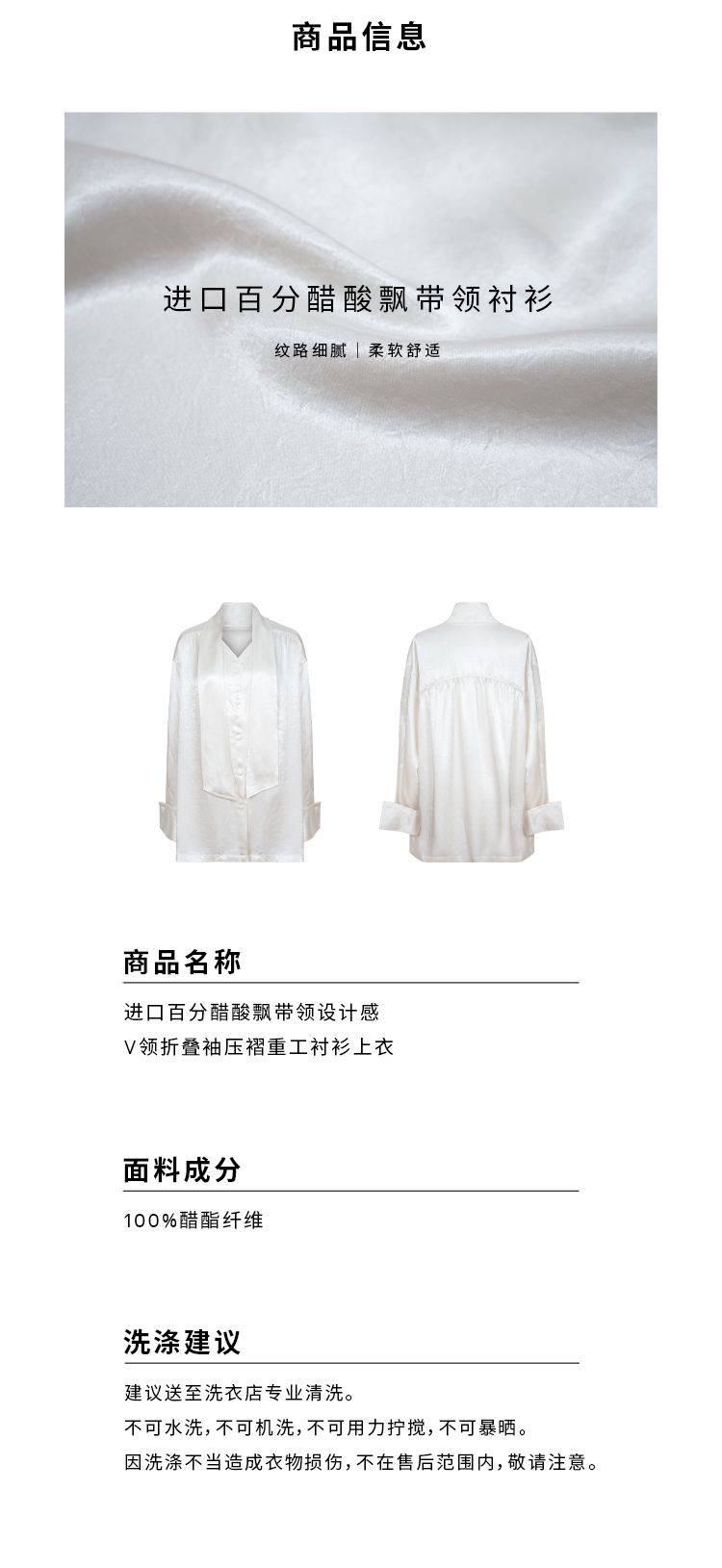 HIDEMI 进口百分醋酸飘带领设计感v领折叠袖压褶重工衬衫上衣